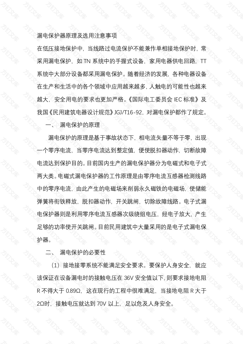 漏电保护器原理及选用注意事项在低压接地保护中,当线路过电流保护不能兼作单相接地保护时,常采用漏电保护,如TN系统中的手握式设备,家用电器供电回路,T系统中大部分设备都采用漏电保护。随着经济的发展,各种电器设备在生产和生活中的各个领域中应用越来越多,人触电的可能性也越来越大,安全用电的要求也更加严格。《国际电工委员会EC标准》及我国《民用建筑电器设计规范》JGT16-92,对漏电保护都作了规定漏电保护的原理漏电保护的原理是基于事故状态下,相电流矢量不等于零,出现个零序电流,当零序电流达到整定值,便使脱扣器动作,切断故障电流达到保护目的。目前国内生产的漏电保护器分为电磁式和电子式两大类。电磁式漏电保护器的工作原理是由零序电流互感器检测线路中的零序电流,由此产生的电磁场来削弱永久磁铁的电磁场,使储能弹簧将衔铁释放,脱扣器动作,开关跳闸,切除故障线路。电子式漏电保护器则是利用零序电流互感器次级绕组电压,经电子放大,产生足够的功率使开关跳闸。目前民用建筑中大量采用的是电子式漏电保护器。漏电保护的必要性(1)接地接零系统不能满足安全要求。要保护人身安全,就应该保证在设备漏电时的接触电压在36V安全值以下,则要求接地电阻R不得大于0.892,这在现行的工程中很难满足,当接地电阻R大于2Ω时,接触电压就达到70V以上,足以危及人身安全施工时接地接零线连接不可靠,甚至断接,这都埋下了隐患(3)等电位连结并没有包括多种各处的用电设备,触电危险仍没有根除。漏电保护器的选择合理选择漏电保护器的整定电流及时间漏电保护可用作防止直接触电或间接触电事故的发生。在接地故障中所采用的漏电保护都是用作间接触电保护的,即防止人体触及故障设备的金属外壳。人体触电不发生心室纤维颤动的界限值为30mA.S,因此设计漏电保护时,不仅要注意漏电保护器的动作电流,也要注意动作电流时间值小于30mA.s。2.系统的正常泄漏电流要小于漏电保护器的额定不动作电流漏电保护器的额定不动作电流,由产品的样本给出。如列此数可取漏电保护额定动作电流的一半。西电线路及电器设备的正常泄漏电流对漏电保护器的动作正确与否有很大的影响,若泄漏电流过大,会引起保护电器误动作,因此在设计中必须估算系统的泄漏电流,并使其小于漏电保护器的额定不动作电流。泄漏电流的计算非常复杂又没有实测的数据,设计中只能参考有关的资料。3.按照保护目的的选用漏电开关以触电保护为目的的漏电保护器,可装在小规模的干线上,对下面的线路和设备进行保护,也可以有选择地在分支上或针对单台设备装设漏电保护器,其正常的泄漏电流相对也小。漏电保护器的额定动作电流可以选得小些,但一般不必追求过小的动作电流,过小的动作电流容易产生频繁的动作。EC标准规定:漏电保护器的额定动作电流不大于30mA。动作时间不超过0.1s;如动作时间过长,30mA的电流可使人有室息的危险。来源http/www.tede.cn分支线上装高灵敏漏电保护器做触电保护,干线上装中灵敏或低灵敏延时型作为规定漏电火灾保护,两种办法同时采用相互配合,可以获得理想的保护效果,这时要注意前后两级动作选择性协调。4.按照保护对象选用漏电保护器人身触电事故绝大部分发生在用电设备上,用电设备是触电保护的重点,然而并不是所有的用电设备都必须装漏电保护器,应有选择地对那些危险较大的设备使用漏电保护器保护。如携带式用电设备,各种电动工具等潮湿多水或充满蒸汽环境内的用电设备万文住宅或公建中的插座回路:游泳池水泵,水中照明线路,方洗衣机、空调机、冰箱、电动炊具等娱乐设施的电气设备等。文方方方万万