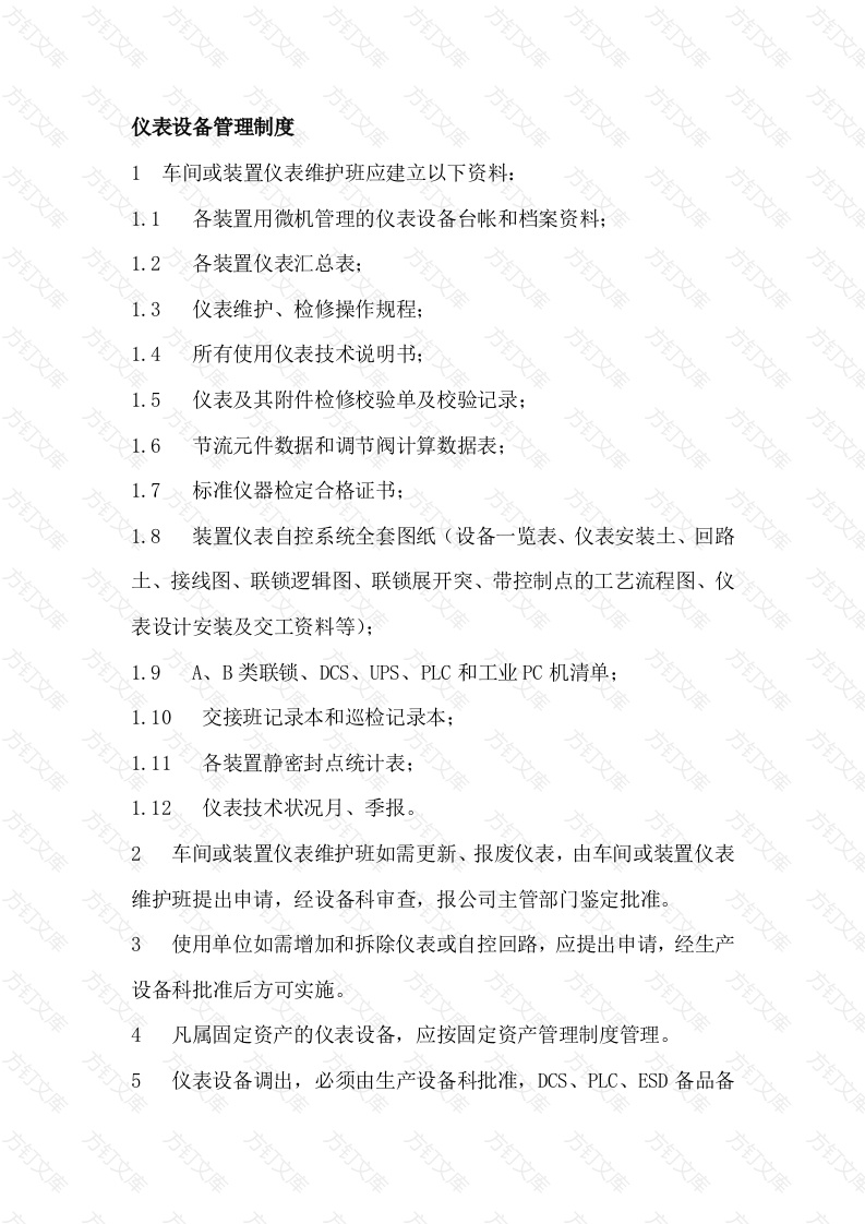 仪表设备管理制度车间或装置仪表维护班应建立以下资料:各装置用微机管理的仪表设备台帐和档案资料:1.2各装置仪表汇总表:1.3仪表维护、检修操作规程:1.4所有使用仪表技术说明书:1.5仪表及其附件检修校验单及校验记录;1.6节流元件数据和调节阀计算数据表;1.7标准仪器检定合格证书;装置仪表自控系统全套图纸(设备一览表、仪表安装土、回路土、接线图、联锁逻辑图、联锁展开突、带控制点的工艺流程图、仪表设计安装及交工资料等):1.9A、B类联锁、DCS、UPS、PLC和工业PC机清单:1.10交接班记录本和巡检记录本:1.11各装置静密封点统计表:1.12仪表技术状况月、季报。车间或装置仪表维护班如需更新、报废仪表,由车间或装置仪表维护班提出申请,经设备科审查,报公司主管部门鉴定批准。3使用单位如需增加和拆除仪表或自控回路,应提出申请,经生产设备科批准后方可实施。文凡属固定资产的仪表设备,应按固定资产管理制度管理仪表设备调出,必须由生产设备科批准,DCS、PLC、ESD备品备件调出必须报公司生产设备科备案车间或装置仪表维护班每季度上报仪表自动化状况,经主管仪表人员汇总签字,主管领导审核,按时上报公司生产科,内容包括:a.本厂仪表设备四率报表;b.本季度因仪表原因造成装置停车的事故分析报告;C.联锁解除或投运报表。每年年末要对工业自动化仪表设备进行一次统计,并做好年度运行总结。8主要部位仪表运行发生重大故障时应立即处理并及时上报生产设备科及有关主管领导。工业仪表设备A、B、C的分级按公司企业标准计量器具分级管理办法执行。10装置安全联锁系统管理按照厂仪表联锁系统管理规定执行。11集散控制系统的管理按照厂DCS管理规定执行。方仪表检修管理制度仪表检修分为大、中、小修三种。a.大修:对仪表主要零部件进行拆卸、清洗、更换或修理损坏零部件,对仪表进行出厂检验项目的检定。b.中修:对仪表主要零部件进行拆卸、清洗、更换或局部修理,对仪表主要技术性能进行检定。小修:对仪表进行一般的清洗、调校及一般的故障处理。仪表的大中修一般由仪表维修单位承担,小修由装置维护人员进公司控制的仪表检修项目要在装置检修前一个月做到图纸、备品配件、材料、机具、人员及安全措施等落实。追加项目必须提出追加计划,报生产运行处审查批准后,安排施重要检修项目(如联锁系统、DCS点检等)应由设备科组织相关员共同验收,一般项目由车间或装置仪表维护班验收。仪表检修要推行全面质量管理,建立健全质量保证体系仪表检修期间必须注意安全,执行各项安全规程和措施,实施HSE管理,做到文明检修8仪表检修验收,应具备检验记录,试压记录等大检修结束后,按要求做好检修总结,并按要求上报相关部门。10仪表及系统检修,必须按照检修规程要求全面检修。方方订方万万万万