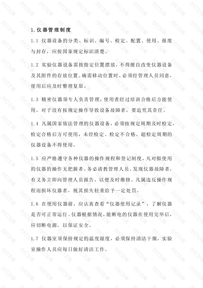 1.仪器管理制度1.1仪器设备的分类、标识、编号、检定、配置、使用、报废与封存,应按国家规定标识清楚。1.2实验仪器设备需按指定位置摆放,不得擅自改变仪器设备及其附件的存放位置。确需移动位置时,必须经管理人员同意,使用后应及时整理复原。1.3精密仪器须专人负责管理,使用者经过培训合格后方能使用,对于没有按规定操作导致设备故障者,要追究其责任。1.4凡属国家依法管理的仪器设备,必须按规定周期及时检定,检定合格后方可使用,未经检定、检定不合格、超检定周期的仪器设备不得使用。1.5应严格遵守各种仪器的操作规程和登记制度,凡对拟使用的仪器的操作无把握者,务必请教管理人员。发现仪器故障者,有义务立即向管理人员报告,以便及时维修。凡属违反操作规程而损坏仪器者,视其损失轻重给予一定处罚。1.6在使用仪器前,应认真查看“仪器使用记录”,了解仪器是否可正常运行。仪器根据情况,能断电的仪器在使用完毕后,应切断电源,以保证安全。1.7仪器室须保持规定的温度湿度,必须保持清洁干燥,实验室操作人员应每日做好清洁工作。实验室操作人员应每天记录仪器使用情况及仪器室温湿度1.9必须严格执行仪器设备运行记录制度,记录仪器运行状况、开关机时间。2.0下次使用者,在开机前,首先检查仪器清洁卫生,仪器是否有损坏,接通电源后,检查是否运转正常。发现问题应及时报告管理人员,并找上一次使用者问明情况,知情不报者追查当次使用者责任。2.1严格控制仪器室进出人员,非仪器分析人员不得随意进入仪器室。2.2非本单位或非本部门人员要使用仪器,须经管理人员同意,并必须由实验室人员在场,才能使用。2.3下班时,仪器室由每日操作人员负责锁门,锁门前要检查仪器(包括电脑)、电源、空调器是否已关闭以及室内情况,在一切正常的情况下锁门,钥匙放在实验室内固定地方,否则发生意外,由当日锁门者负责。万2.器皿管理制度2.1器皿应有专人保管,分类存放,并定期检查使用及保管情况万2.2取化学试剂的器皿应洗涤干净,分开使用。固体试剂的取用遵循“只出不进,量用为出”的原则:液体试剂的取用遵循“只准倾出,不准吸出”的原则。2.3玻璃器皿2.3.1各种玻璃仪器要分门别类的存放,以便取用。经常使用的玻璃仪器要洗净干燥后放在专用柜内,清洗清洁度以不挂水珠或内壁有一层均匀水膜为准。2.3.2清洗比色管不能使用毛刷;玻璃容量器具(量瓶、移液管、滴定管、量筒等)原则不可以加热干燥,应以自然晾干。2.3.3移液管洗净后,应用干净滤纸包住两端或全部用滤纸包起来,以防沾污。2.3.4滴定管用毕,洗去管内的溶液,再用纯水冲洗,上盖玻璃短试管或塑料套套管,也可放尽水倒置,夹于滴定管夹上,长期不用的滴定管要除掉凡士林后垫纸,用皮筋拴好活塞保存。2.3.5>比色皿用毕洗净,置滤纸上倒置晾干后收于比色皿盒或洁净的器皿中。2.3.6量瓶或比色管等最好在清洗前用小绳将塞和管口拴好,以免打破塞子或互相弄混。需长期保存的磨口仪器应在塞间垫张纸片,以免日久粘住。磨口塞间如有砂粒不要用力转动,以免损伤其精度。同理,不要用去污粉擦洗磨口部位。文