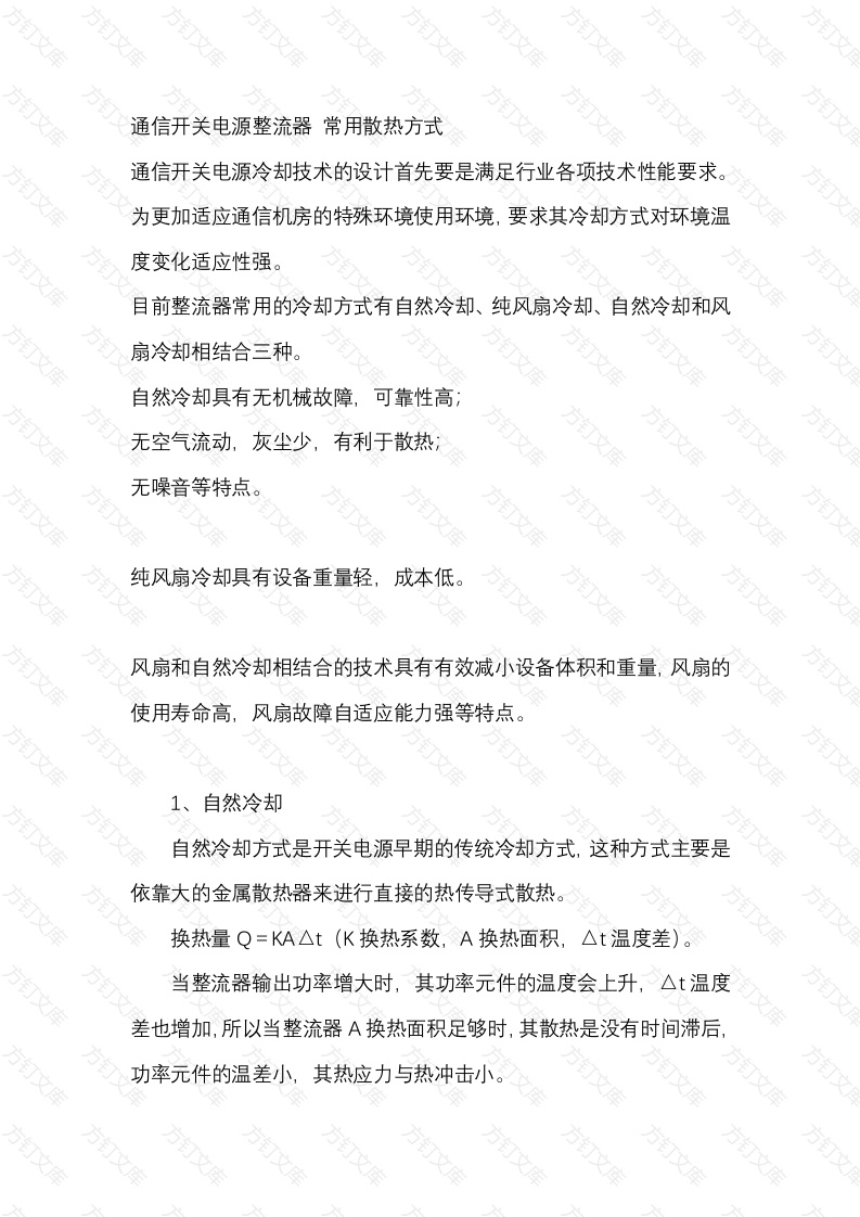 通信开关电源整流器常用散热方式通信开关电源冷却技术的设计首先要是满足行业各项技术性能要求为更加适应通信机房的特殊环境使用环境,要求其冷却方式对环境温度变化适应性强。目前整流器常用的冷却方式有自然冷却、纯风扇冷却、自然冷却和风扇冷却相结合三种。自然冷却具有无机械故障,可靠性高无空气流动,灰尘少,有利于散热;方无噪音等特点。纯风扇冷却具有设备重量轻,成本低。风扇和自然冷却相结合的技术具有有效减小设备体积和重量,风扇的使用寿命高,风扇故障自适应能力强等特点。1、自然冷却自然冷却方式是开关电源早期的传统冷却方式,这种方式主要是依靠大的金属散热器来进行直接的热传导式散热。换热量Q=KA△t(K换热系数,A换热面积,△t温度差)当整流器输出功率增大时,其功率元件的温度会上升,◇△t温度差也增加,所以当整流器A换热面积足够时,其散热是没有时间滞后功率元件的温差小,其热应力与热冲击小。但这种方式的主要缺点就是散热片体积和重量大。变压器的绕制为尽可能降低温升,防止温度的上升影响其工作性能,所以其材料选择的裕量较大,变压器的体积和重量也大。整流器的材料成本高,维护更换不方便。由于其对环境的洁净度要求不高,目前对于小容量通信电源,在些小型专业通信网还有部分应用,如电力、石油、广电等。风扇冷却随着风扇制造技术的发展,风扇的工作稳定性和使用寿命有较大的进步,其平均无故障时间是5万小时。采用风扇散热后可以减去笨重的散热器,使得整流器的体积和重量大大改善,原材料成本也大大降低。随市场竞争的加剧,市场价格的下滑,这种技术已成为当前的主要潮流。这种方式的主要缺点是风扇的平均无故障时间较整流器10万小时时间短,若风扇故障后对电源的故障率影响大。所以为保证风扇的使用寿命,风扇的转速是随设备内的温度变化而变化的。其散热量Q=Km△t(K换热系数,m换热空气质量,△t温度差)换热空气质量是和风扇的转速相关,当整流器输出功率增大时其功率元件的温度会上升,而功率元件温度的变化到整流器能将这种变化检测到,再到增加风扇的转速以加强散热,在时间上是有很大滞后的。万果负载经常突变,或者市电输入波动大,就会造成功率元件出现快速的冷热变化,这种突变的半导体温度差产生的热应力与热冲击,会导致元件的不同材料部分产生应力裂纹。使之过早失效。3、风扇和自然冷却相结合由于环境温度的变化和负载的变化,电源工作时的耗散热能,采用风扇和自然冷却方式相结合可以更快的将热能散发出去。这种方式在增加风扇散热的同时,可以减少散热器面积,使得功率元件工作在相对稳定的温度场条件下,使用寿命不会因为外部条件变换受影响。这样不仅克服纯风扇冷却对的功率元件散热调节滞后的缺点,也了避免风扇使用寿命低影响整流器的整体可靠性。尤其在机房的环境温度很不稳定的情况下,采用风冷和自冷相结合的冷却技术具有更好的冷却性能。这种方式整流器的材料成本在纯风扇冷去和自然冷却两种方式之间,重量低,维护方便。文方方方订万万万