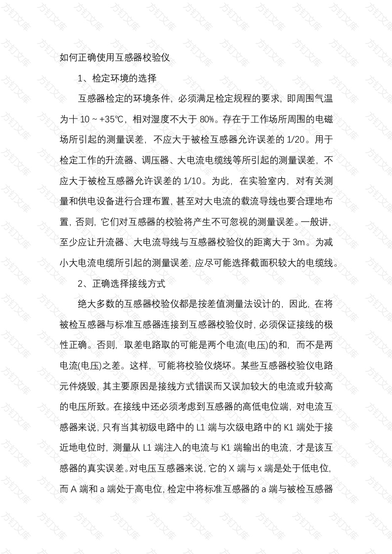 如何正确使用互感器校验仪1、检定环境的选择互感器检定的环境条件,必须满足检定规程的要求,即周围气温为十10~+35℃,相对湿度不大于80%。存在于工作场所周围的电磁场所引起的测量误差,不应大于被检互感器允许误差的1/20。用于检定工作的升流器、调压器、大电流电缆线等所引起的测量误差,不应大于被检互感器允许误差的1/10。为此,在实验室内,对有关测量和供电设备进行合理布置,甚至对大电流的载流导线也要合理地布置,否则,它们对互感器的校验将产生不可忽视的测量误差。一般讲至少应让升流器、大电流导线与互感器校验仪的距离大于3m。为减小大电流电缆所引起的测量误差,应尽可能选择截面积较大的电缆线2、正确选择接线方式绝大多数的互感器校验仪都是按差值测量法设计的,因此,在将被检互感器与标准互感器连接到互感器校验仪时,必须保证接线的极性正确。否则,取差电路取的可能是两个电流(电压)的和,而不是两电流(电压)之差。这样,可能将校验仪烧坏。某些互感器校验仪电路元件烧毁,其主要原因是接线方式错误而又误加较大的电流或升较高的电压所致。在接线中还必须考虑到互感器的高低电位端,对电流互感器来说,只有当其初级电路中的L1端与次级电路中的K1端处于接近地电位时,测量从L1端注入的电流与K1端输出的电流,才是该互感器的真实误差。对电压互感器来说,它的X端与×端是处于低电位,而A端和a端处于高电位,检定中将标准互感器的a端与被检互感器的a端短接在两互感器的×端取次级电压差。如电流端接反,则可能引起泄漏误差综上所述,我们在互感器的检定中,应避免电流互感器L1、K1端与L2、K2端对调;电压互感器A端、a端与X端、x端对调。3、校验时接地问题的处理采用互感器校验仪进行互感器检定时,必须使互感器校验仪的电路始终处于低电位状态,从而减小其对地的泄流,但对电流互感器而言,在用差值比较法进行检定时,又不允许K1端接地,所以,我们在互感器的检定过程中需要依具体电路的实际情况,合理选择接地点。通常行之有效的接地措施为;将其面板上设置的接地端钮可靠接地。4、负载匹配电流互感器与电压互感器的误差特性,对于负载阻抗(或导纳)是十分敏感的。在检定过程中,由于标准互感器的负载选择不匹配,将可能导致误判。故要对标准互感器及被检互感器分别进行负载匹配,使其在检定电路承担的实际负载等于该互感器的额定负载。由于检定线路已形成一部分负载,所以应对检定线路进行内载测试。结合负载箱的参数,选合适的导线,准确匹配后,才可以工作。每次检定前,注意一定要将每个接线端钮旋,以防松动和断线。5、合理选择校验仪的量程开关由于互感器校验仪的功能较多,在对互感器进行检定时,一定要正确选择功能开关,正确选择合适的量程,以避免误操作造成人为事故减小校验仪产生的测量误差6外观检查外观检查是检定人员对被检互感器进行的表面直观的检查。虽然十分简单,但却是必不可少的重要一环。该环节的主要目的是:发现表面存在的问题并正确处理。即首先检查铭牌标记的完整性,以便提供正确的参数,进行检定。其次检查接线端钮的完好状况,以及极性标记。对多变比互感器,还应检查不同变比的接线方式。7、绝缘电阻的测定用兆欧表测量其各绕组之间和绕组对地之间的绝缘电阻值。8、工频耐压试验工频耐压试验,包括工频耐压试验和感应电压试验。,工频耐压试验时,必须严格遵守有关规程9、极性检查无论是电流互感器还是电压互感器,如将极性接错,很容易烧坏仪器。因此,正式检定误差前,都要先检查其极性的正确性。检查的方法可用比较法或直流法,一般校验仪上都有互感器极性试验及显示功能。当连接方式正确,仍发现极性指示器动作,表明被检互感器的内部极性有问题。这时可反接极性再试。对任何互感器的检定,该步骤都不能省略,否则极易造成人为事故的发生。10、退磁电流互感器的铁芯一般有两种材料,即铁镍合金与硅钢片。对不同材料,不同结构型式的电流互感器,其退磁的方法和要求各不相同对用铁镍合金作铁芯的电流互感器,如采用次级开路退磁,往往会发