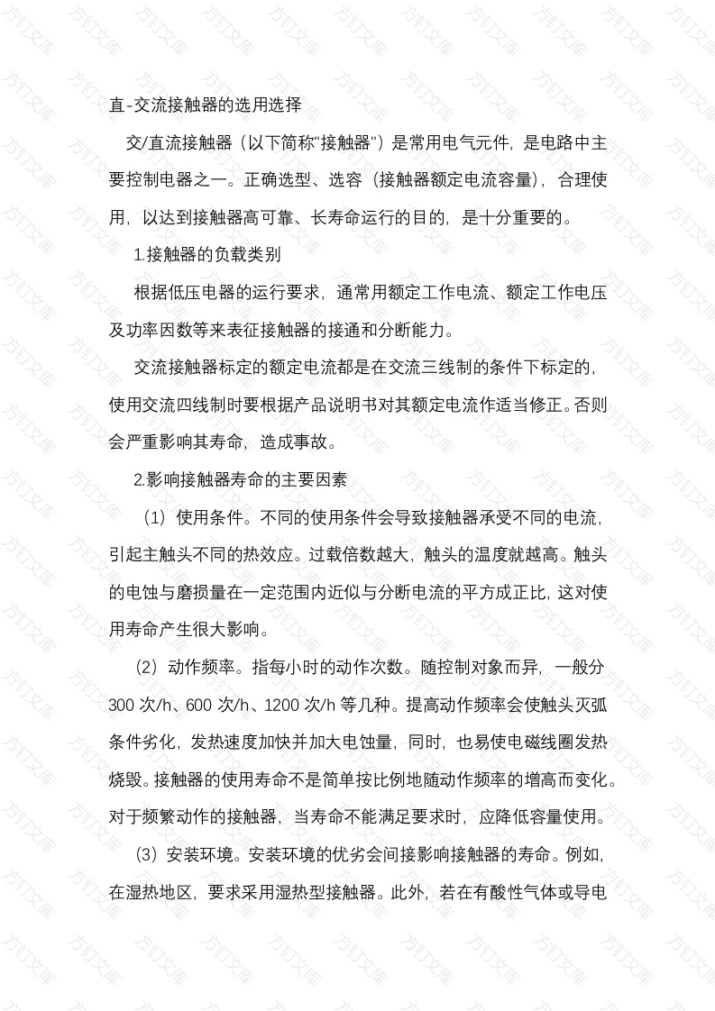 直-交流接触器的选用选择交/直流接触器(以下简称“接触器“)是常用电气元件,是电路中主要控制电器之一。正确选型、选容(接触器额定电流容量),合理使用,以达到接触器高可靠、长寿命运行的目的,是十分重要的。1接触器的负载类别根据低压电器的运行要求,通常用额定工作电流、额定工作电压及功率因数等来表征接触器的接通和分断能力。交流接触器标定的额定电流都是在交流三线制的条件下标定的使用交流四线制时要根据产品说明书对其额定电流作适当修正。否则会严重影响其寿命,造成事故。2影响接触器寿命的主要因素(1)使用条件。不同的使用条件会导致接触器承受不同的电流引起主触头不同的热效应。过载倍数越大,触头的温度就越高。触头的电蚀与磨损量在一定范围内近似与分断电流的平方成正比,这对使用寿命产生很大影响。(2)动作频率。指每小时的动作次数。随控制对象而异,一般分300次h、600次/h、1200次/h等几种。提高动作频率会使触头灭弧条件劣化,发热速度加快并加大电蚀量,同时,也易使电磁线圈发热烧毁。接触器的使用寿命不是简单按比例地随动作频率的增高而变化。对于频繁动作的接触器,当寿命不能满足要求时,应降低容量使用。(3)安装环境。安装环境的优劣会间接影响接触器的寿命。例如,在湿热地区,要求采用湿热型接触器。此外,若在有酸性气体或导电文粉尘存在、湿度大、环境温度高、供电质量差、电压波动大、高次谐波含量高等场合下使用,均会使接触器的寿命缩短,应根据情况对接触器的规格加以修正。3提高接触器寿命的途径接触器的负载类别、动作频率由应用条件和需要决定,是不可改变的。选用接触器时,除按要求选用相应功能的接触器外,要提高接触器的寿命,减少更换维修接触器的次数,最有效的办法就是降容使用。在安装条件允许的情况下,降容倍数越大,寿命提高的倍数越大。4.注意事项由于接触器的安装场所与控制的负载不同,其工作条件与工作的繁重程度也不相同。在选用接触器时必须对被控负载的工作情况以及接触器的性能有较全面的了解,从而正确地选用接触器。重点是根据负载类别选用接触器的类型与容量。(1)用于交流单相与交流三线制时,在规定的动作频率下可按负载的满载电流,选用稍大于额定工作电流的接触器,其它参数按负载参数选择。(2)工作于重载型电机负载,或接触器不是控制单一类别负载而是时而接交流三线制、时而接交流四线制的混合使用状态,或不时点动、反接制动、反向和在低速下分断,或动作频率可达100次h甚至更高、电机功率一般在20kW以下,可按电机额定电流3~4倍来选择,其寿命可按交流四线制类别的5~10倍粗略计算(3)工作于特重型电机负载,如长期在交流四线制或缺相条件下使用,频繁点动、反接制动和可逆运行,其动作频率可达600~1200次h甚至3000次/h,应特别注意选用较高使用寿命的接触器。应用时,可粗略以电机的启动电流作为接触器的额定电流来选择。(4)根据动作次数校验接触器允许的动作频率。交流接触器的选用,应根据负荷的类型和工作参数合理选用。具体分为以下步骤:1.选择接触器的类型交流接触器按负荷种类一般分为一类、二类、三类和四类,分别记为AC1、AC2、AC3和AC4。一类交流接触器对应的控制对象是无感或微感负荷,如白炽灯、电阻炉等;二类交流接触器用于绕线式异步电动机的起动和停止;三类交流接触器的典型用途是鼠笼型异步电动机的运转和运行中分断;四类交流接触器用于笼型异步电动机的起动反接制动、反转和点动。2·选择接触器的额定参数根据被控对象和工作参数如电压、电流、功率、频率及工作制等确定接触器的额定参数。接触器的线圈电压,一般应低一些为好,这样对接触器的绝缘要求可以降低,使用时也较安全。但为了方便和减少设备,常按实际电网电压选取。2电动机的操作频率不高,如压缩机、水泵、风机、空调、冲床等接触器额定电流大于负荷额定电流即可。接触器类型可选用C0CJ20等