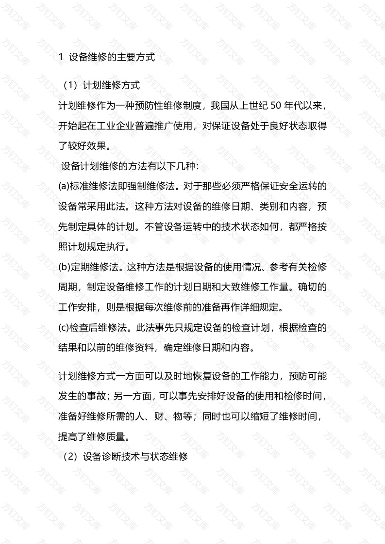 设备维修的主要方式(1)计划维修方式计划维修作为一种预防性维修制度,我国从上世纪50年代以来开始起在工业企业普遍推广使用,对保证设备处于良好状态取得了较好效果。设备计划维修的方法有以下几种:()标准维修法即强制维修法。对于那些必须严格保证安全运转的设备常采用此法。这种方法对设备的维修日期、类别和内容,预先制定具体的计划。不管设备运转中的技术状态如何,都严格按照计划规定执行。(b)定期维修法。这种方法是根据设备的使用情况、参考有关检修周期,制定设备维修工作的计划日期和大致维修工作量。确切的工作安排,则是根据每次维修前的准备再作详细规定。(c)检查后维修法。此法事先只规定设备的检查计划,根据检查的结果和以前的维修资料,确定维修日期和内容。计划维修方式一方面可以及时地恢复设备的工作能力,预防可能发生的事故;另一方面,可以事先安排好设备的使用和检修时间,准备好维修所需的人、财、物等;同时也可以缩短了维修时间,提高了维修质量。2)设备诊断技术与状态维修文万万万与传统检查相对,设备诊断技术由依靠人员的感官判断,发展到大量采用先进的科学仪器、仪表;由人工测试,发展为在设备运转中由电子仪器显示;由高级技术工人承担,发展为由于采用既科学又方便的仪器、仪表,一般设备操作者也能承担;由在停机情况下检测,发展到不停机直接检测;检测的目的,由检测劳损(磨损、腐蚀等)、预防故障发展到预测设备的自然寿命。目前,该技术已发展为系统的设备维修管理方法,可以对整套设备的单个零件、主要部件进行监测,也可以对整套设备进行全面的监测。设备状态监测维修是根据设备的日常监测、定期检查、状态监测和诊断提供的信息,经统计分析处理,来判断设备的劣化程度并在故障发生之前有计划地进行适当的维修。设备状态维修被公认为设备维修方式中效率最高的一种方式。采用设备状态维修可以及时掌握故障隐患并及时消除,从而提高设备完好率和利用率提高设备维修工作质量和节省各种费用,提高总体效益。(3)事后维修法在设备的维修工作中,还有一种方法叫做事后维修法,或叫故障维修法,也就是坏了再修,不坏不修的方法。这种方法只适用于数量多、一般的设备。2不同设备维修方式的对比分析计划维修方式认为设备故障率遵循浴盆曲线。要有效地实行预防性维修,必须科学制定维修计划。如果计划制订不合理,这种方法常常会造成很大的浪费。在进行预防性维修时,必须准确地找到拐点,这样才可避免过剩维修或维修范围的扩大,获得最佳的效益。但是设备的寿命周期与设备的使用环境、人员素质、维护保养等因素密切相关,科学合理地确定设备的寿命有一定难度因此设备很难真正有效地实施计划维修。传统的观念认为,设备故障的发生、发展与使用时间有直接关系定时的计划拆修普遍使用。根据现代设备故障率曲线可知,设备故障的发生有的与设备使用时间有关,有的则与设备使用时间无关,要根据实际情况而定。同时,许多设备的故障有一定的潜伏期,可以通过现代设备诊断技术检测到,可以进行安全经济的决策维修,而预防性维修不能提高设备的可靠度。设备状态维修作为一种新型的维修方式,其应用范围越来越广越来越受到人们的重视。但是设备维修工作中还不可能完全采用这种技术。这是因为:(1)随着科学技术水平的发展,目前已经有很多设备可以用设备诊断技术进行维修,但作为一种新技术,它本身还处于不断发展和完善之中,并不是所有的机器设备都可以用设备诊断技术进行维修。(2)从经济上考虑,如果所有的设备都采用状态维修方式,需要笔很大的经济投入。这些诊断设备只在企业内部使用的话,使用率低,部分维修资源平时可能闲置,这样使得维修成本大大提高,对企业来说经济上是不合适的。