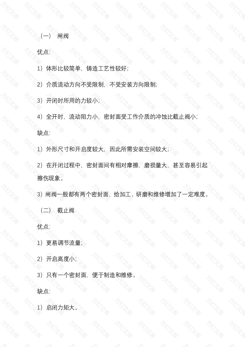 闸阀优点1)体形比较简单,铸造工艺性较好:2介质流动方向不受限制,不受安装方向限制:万3)开闭时所用的力较小:4)全开时,流动阻力小,密封面受工作介质的冲蚀比截止阀小;缺点外形尺寸和开启度较大,。因此所需安装空间较大;2)在开闭过程中,密封面间有相对摩擦,磨损量大,甚至容易引起擦伤现象。3闻阀一般都有两个密封面,给加工、研磨和维修增加了一定难度。截止阀方优点:万文1更易调节流量;方方2)开启高度小;3)只有一个密封面,便于制造和维修。缺点:启闭力矩大。方万万万万2流动阻力大,阀体内介质通道曲折,消耗能量大。万3)流动方向受限制,只能单向流动,不能改变流动方向。球阀用带圆形通孔的球体作启闭件,球体随阀杆转动,以实现启闭动作的阀门。球阀的结构与旋塞阀相似,也有人称它为球形旋塞阀。它由一个球体和两个阀座(密封圈)组成密封副。阀座最常用的材料为聚四氟乙烯塑料。优点:当球阀全开时,可得到与管径相吻合的通道,流通阻力小,同时便于清管器顺利通过。操作方便,开闭迅速,从全开到全关只要旋转90°,便于远距离的控制。3)结构简单、体积小,重量轻。方启闭费力,球体转动时阻力大。2球阀手柄旋转处与阀体密封面容易渗漏。蝶阀万万蝶阀的特点:结构简单,外形尺寸小,结构长度短,体积小,重量轻,适用于大口径的阀门。全开时阀座通道有效流通面积较大,流体阻力较小。3)启闭方便迅速,调节性能好4)启闭力矩较小,由于转轴两侧蝶板受介质作用基本相等,而产生转矩的方向相反,因而启闭较省力。(5)密封面材料一般采用橡胶、塑料、故低压密封性能好。五止回阀旋启式止回阀:流动阻力小,密封性能不如升降式。适用于低流速和流动不常变动的场合,不宜用于脉动流。(a)单瓣式:中等口径(b)双瓣式:较大口径(DN≤600方升降式止回阀:(a)直通式升降止回阀b)立式升降止回阀底阀:泵吸入口设置。防止倒流,利于启泵。止回阀的特点:升降式止回阀的阀体形状与截止阀一样(可与截止阀通用)因此它的流体阻力系数较大。旋启式止回阀,阀瓣围绕阀座外的销轴旋转,应用较为普遍。文
