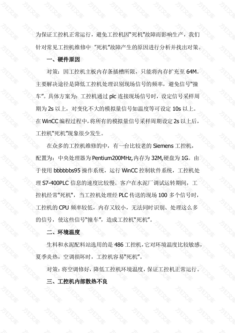 为保证工控机正常运行,避免工控机因“死机"故障而影响生产,我们针对常见工控机维修中"死机"故障产生的原因进行分析并找出对策。硬件原因对策:因工控机主板内存条插槽所限,只能将内存扩充至64M。主要解决途径是降低工控机处理识别现场信号的频率,避免信号“撞车”。具体方案为:工控机通过pc连接现场信号时,设定信号采样周期为2s以上,对变化不大的模拟量信号如温度等可设定10s以上。在WinCC编程过程中,将所有的模拟量信号采样周期设定2s以上后,工控机“死机"现象很少发生。在众多的工控机维修的中,有一台比较老的Siemens工控机,配置为:中央处理器为Pentium.200MH忆,内存为32M,硬盘为1G。由于使用bbbbbbs95操作系统,运行WinCC控制软件系统,工控机处理S7-400PLC信息的速度比较慢。客户在水泥厂调试运转期间,工控机经常"死机",当工控机处理经PLC传送的现场100多个信号时,工控机的CPU频率较低,内存又较小,无法同时识别、处理这么多的信号,使这些信号撞车”,造成工控机死机”。二、环境温度生料和水泥配料站选用的是486工控机,它对环境温度比较敏感,夏季炎热,空调损坏时,工控机容易死机”。对策:将空调修好,降低工控机环境温度,保证工控机正常运行。三、工控机内部散热不良工控机所处的环境较恶劣,除温度高外,灰尘也较大。当工控机内进入灰尘,各种板卡、CPU等电子元器件散热效果差,造成工控机死机”。对策:定期清除工控机内部灰尘,保持良好通风四、检查CPU风扇和主机电源风扇工控机的散热主要通过CPU风扇和电源风扇进行。当CPU风扇损坏时,CPU的温度升高,极易造成工控机死机"。生料配料站就发生过这种现象。对策:经常检查工控机的风扇,及时更换损坏的风扇。中控室的工控机出厂时CPU只加装了散热片,没有风扇。后加装专用散热风扇,CPU的温度降低了近5C五、经常清理临时产生的文件工控机在运行时,会产生大量的临时文件如Temp文件,这些文件占用着硬盘和系统资源,影响工控机处理信息的速度。定期检查硬盘并删除临时性文件,提高工控机处理信息的速度。六、经常维护系统因编辑控制程序等原因,系统中加装了其它应用软件,太多的应用软件会让工控机的运行速度越来越慢。因此每隔一段时间,对工控机做一次全面的维护,点击开始”→程序”→附件”→系统工具”→维护向导”,然后点击“确定"按钮即对工控机进行全面的维护,这样能使工控机保持最佳状态。对硬盘最好每隔1个月就做1次“硬盘碎片整理”,整理之后能加快程序运行速度。七、由信息阻断造成工控机“死机”中控室工控机(上位机)监视和控制S7-400PLC(下位机),信息阻断时故障现象为:工控机画面上监控信号处出现阴影"且信号数值都为零,上位机对下位机无法监视和控制。这种故障与上面提到的死机"现象不一样。该故障原因是由信息阻断造成的,由于下位机“死机”或传输信号网线和网卡发生故障,导致上位机接收不到信号引起,其实上位机并没有死机”。这种故障在2001年11月初发生过,由于网线和网卡接触不良导致上位机对下位机无法监视和控制。对策:当上位机画面出现阴影"时,首先检查下位机的工作状态,S7-400PLC的CPU模板上有各种错误指示灯,可根据指示灯的状态进行操作。如果PLC死机"”,用钥匙将PLC的CPU重新启动就能恢复正常。如果网线和网卡有问题,操作工(或通知电工、厂部技术员)应立即检查上、下位机的信号电缆插头有无接触不良,用手对各插头轻压或摆动,很有可能找出故障点,为厂部技术员到场诊断处理创造条八、建议工控机升级目前,通过以上措施,工控机的死机"”次数大大减少。但是,由于上位机的硬件配置较低,软件操作和控制系统版本也较低,上位机的处理信息速度还较慢,建议升级工控机,增加CPU频率、内存容量和硬盘容量。为了更好地满足生产需要,建议中控室工控机CPU升级为Pentium41.5GHz以上,内存为256M,硬盘为20G以上。同时操作软件升级为中文bbbbbbs98或bbbbbbsNT系统,控制软件升级
