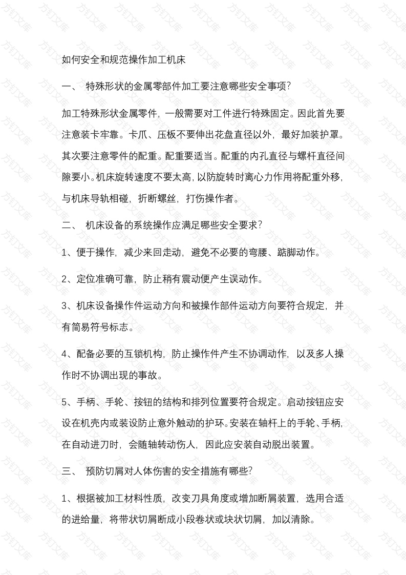 如何安全和规范操作加工机床特殊形状的金属零部件加工要注意哪些安全事项?加工特殊形状金属零件,一般需要对工件进行特殊固定。因此首先要注意装卡牢靠。卡爪、压板不要伸出花盘直径以外,最好加装护罩。其次要注意零件的配重。配重要适当。配重的内孔直径与螺杆直径间隙要小。机床旋转速度不要太高,以防旋转时离心力作用将配重外移与机床导轨相碰,折断螺丝,打伤操作者文机床设备的系统操作应满足哪些安全要求?便于操作,减少来回走动,避免不必要的弯腰、踮脚动作。2、定位准确可靠,防止稍有震动便产生误动作。3、机床设备操作件运动方向和被操作部件运动方向要符合规定,并有简易符号标志。4、配备必要的互锁机构,防止操作件产生不协调动作,以及多人操作时不协调出现的事故。5、手柄、手轮、按钮的结构和排列位置要符合规定。启动按钮应安设在机壳内或装设防止意外触动的护环。安装在轴杆上的手轮、手柄,在自动进刀时,会随轴转动伤人,因此应安装自动脱出装置。预防切屑对人体伤害的安全措施有哪些?文1、根据被加工材料性质,改变刀具角度或增加断屑装置,选用合适的进给量,将带状切屑断成小段卷状或块状切屑,加以清除在刀具上安装排屑器,或在机床上安装护罩、档板,控制切屑流不致伤人。3、高速切削生铁、铜、铝材料,除在机床上安装护罩、档板以外操作者应配备防护眼镜。4、使用工具及时清除机床上和工作场所的铁屑,防止伤手、脚,切忌用手去扒铁屑。四、机床设备配置哪四种安全装置其作用是什么?1、防护装置。用来使操作者和机器设备的转动部分、带电部分及加工过程中产生的有害物加以隔离。如皮带罩、齿轮罩、电气罩、铁屑档板、防护栏杆等。2、保险装置。用来提高机床设备工作可靠性。当某一零部件发生故障或出现超载时,保险装置动作,迅速停止设备工作或转入空载运行。如行程限位器、摩擦离合器等。3、联锁装置。用于控制机床设备操作顺序,避免动作不协调而发生事故。如车床丝杆与光杆不能同时动作等,都要安装电气或机械的联锁装置加以控制。4、信号装置。用来指示机器设备运行情况,或者在机器设备运转失常时,发出颜色、音响等信号,提醒操作者采取紧急措施加以处理。如指示灯、蜂鸣器、电铃等。操作机床要注意哪些安全事项?万万万万工作前穿好工作服,扎好袖口,戴好工作帽,严禁戴手套操作2、认真检查设备各部分及防护罩、限位块、保险螺钉等安全装置是否完好有效。3、设备必须牢固有效地接地接零,局部照明灯电压必须稳定。4、工作前,在各油孔内加油润滑,空转试车确认无故障方可工作。文5、机床运转时,不能用手检查工件表面光洁度和测量工件尺寸。6、装卡零部件时,扳手要符合要求,不得加套管以增大力矩去拧紧螺母。7、不能用手缠绕砂布去打磨转动零件8、对高速转动的工件要加配重,并作平衡试验,突出部分加护罩。方9、更换齿轮、装卸夹具必须切断电源,停稳后才能进行10、自动走刀前,调整和紧固行程限位器,并拨出进给手枪。11、下班时,要将各种走刀手柄放在空档设置,拉下电门,并擦试机床打扫卫生。方万万万