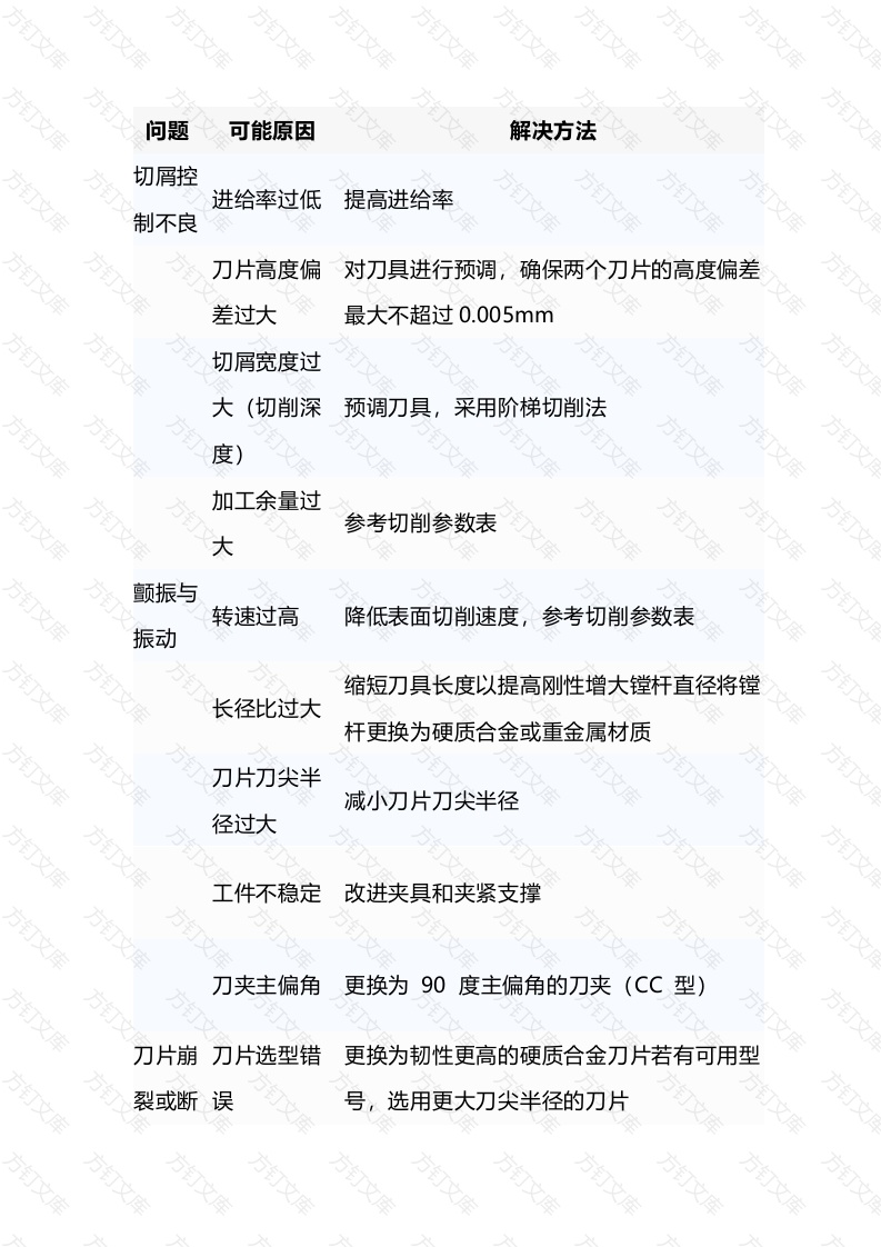 问题可能原因解决方法切屑控进给率过低提高进给率制不良刀片高度偏对刀具进行预调,确保两个刀片的高度偏差差过大最大不超过0.005mm切屑宽度过大(切削深预调刀具,采用阶梯切削法度加工余量过参考切削参数表大颤振与转速过高降低表面切削速度,参考切削参数表方振动缩短刀具长度以提高刚性增大镗杆直径将镗长径比过大杆更换为硬质合金或重金属材质刀片刀尖半减小刀片刀尖半径径过大文工件不稳定改进夹具和夹紧支撑刀夹主偏角更换为90度主偏角的刀夹(CC型)刀片崩刀片选型错更换为韧性更高的硬质合金刀片若有可用型裂或断误号,选用更大刀尖半径的刀片问题可能原因解决方法切削中断剧提高转速,降低进给率烈切屑堆积并检查镗杆与孔径的间隙改进切屑控制,提高二次切削进给率刀具寿刀片选型错更换为耐磨性更高的刀片牌号命过短误方切削速度过降低转速刀片崩裂检查加工余量和进给率方冷却液压力提高通过刀具的冷却液压力若设备允许,调过低整刀头的冷却液喷口切屑无镗杆直径过更换为更小直径的刀头,并搭配延伸范围刀法排出大夹加工余量过重新预调刀具,采用阶梯切削法大孔下方空间将工件从工作台上进一步垫高不足切屑控制不参考上述“切屑控制不良”问题的解决方法良文问题可能原因解决方法机床动进给率过高降低进给率(最低为刀片半径的25%)力不足加工余量过重新预调刀具,采用阶梯切削法大若转速处于主轴扭矩较低区间,需提高转速机床扭矩过若转速处于换挡区间,需调整转速更换为更低大前角的刀片减小切削深度出口毛进给率过高降低进给率刺过大使用CC型改用带6度主偏角的方形刀片刀夹刀夹切削力过高减小切削深度减小刀片刀尖半径方方方方方万方万万