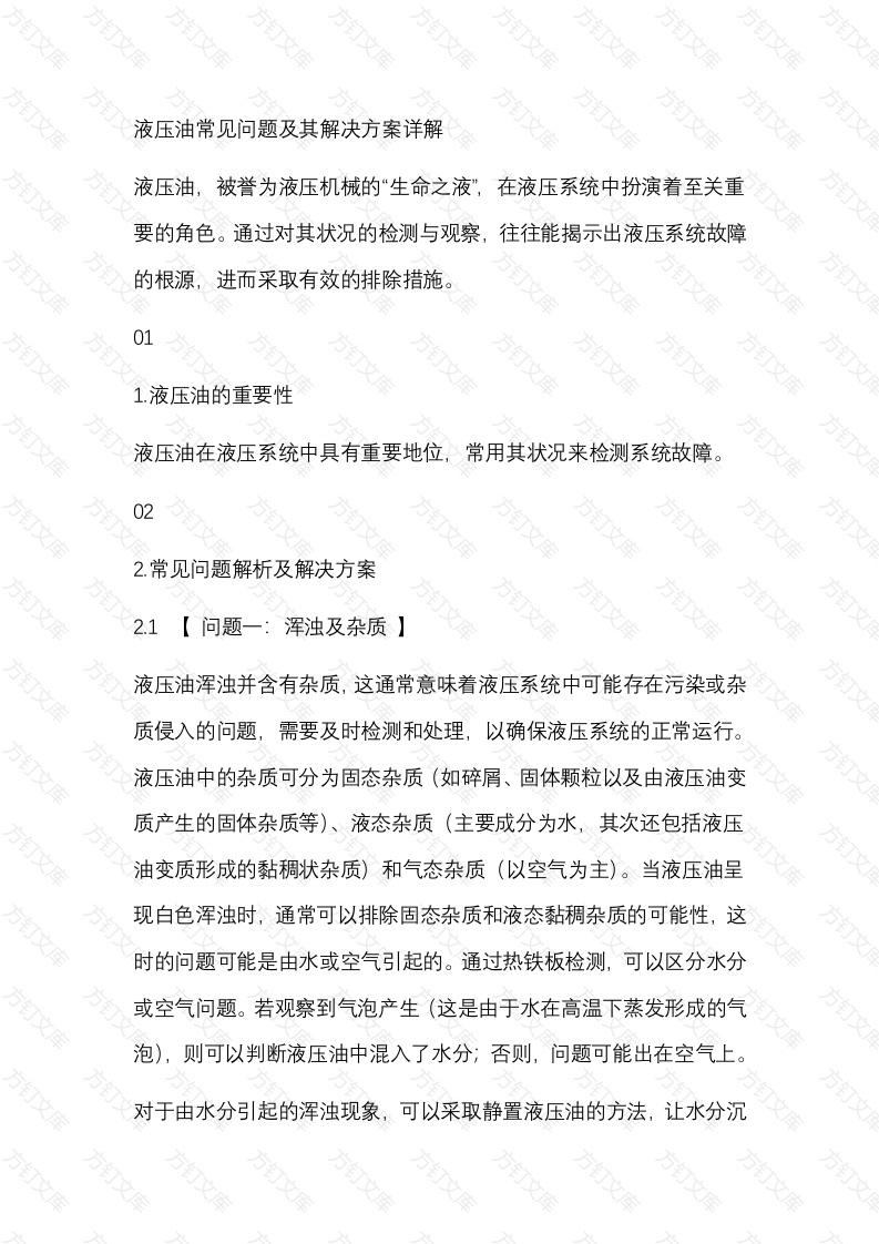 液压油常见问题及其解决方案详解液压油,被誉为液压机械的“生命之液”,在液压系统中扮演着至关重要的角色。通过对其状况的检测与观察,往往能揭示出液压系统故障的根源,进而采取有效的排除措施。01文1.液压油的重要性液压油在液压系统中具有重要地位,常用其状况来检测系统故障。022.常见问题解析及解决方案2.1【问题一:浑浊及杂质】液压油浑浊并含有杂质,这通常意味着液压系统中可能存在污染或杂质侵入的问题,需要及时检测和处理,以确保液压系统的正常运行。液压油中的杂质可分为固态杂质(如碎屑、固体颗粒以及由液压油变质产生的固体杂质等)、液态杂质(主要成分为水,其次还包括液压油变质形成的黏稠状杂质)和气态杂质(以空气为主)。当液压油呈现白色浑浊时,通常可以排除固态杂质和液态黏稠杂质的可能性,这时的问题可能是由水或空气引起的。通过热铁板检测,可以区分水分或空气问题。若观察到气泡产生(这是由于水在高温下蒸发形成的气泡),则可以判断液压油中混入了水分;否则,问题可能出在空气上对于由水分引起的浑浊现象,可以采取静置液压油的方法,让水分沉降至液压油箱底部,然后进行排水处理。但若水分含量过高导致液压油乳化,那么就需要更换新的液压油。而若是由于空气混入导致的浑则应检查液压系统的管路是否漏气,并采取措施切断空气的混入源。2.2【问题二:温度异常上升液压油在运行过程中,其温度应保持在正常范围内。若发现液压油温度异常升高,这可能意味着液压系统出现了问题。温度上升可能是由于液压系统管路堵塞、散热不良或液压泵内部磨损等原因导致的。此时,需要检查液压系统的管路和散热装置,以及液压泵的工作状态以找出并解决问题。液压油油温异常升高的根本原因可归结为三个方面:其一,安全阀的压力设定值过低,导致液压油大量通过安全阀回流至油箱,降低了液压系统的做功效率。在负荷过大的情况下,大部分能量会转化为液压油的热能,从而引发高温;其二,冷却系统的冷却效果不佳,无法有效降低液压油温度;其三,液压油在油路中循环过于频繁,这通常是由于油量不足所导致,进而造成散热困难和温度上升。在故障诊断时,应遵循由易到难的顺序。首先,检查液压油箱的油量若发现油量不足,应立即补充至标准液位。加注时需确保使用牌号相符的液压油,并经过充分过滤。文万2.3问题三:液压油过脏液压油污浊、过脏的问题,可能源于油液因长期使用而发生的化学变化,或是杂质积累导致的物理变化。要解决这一问题,关键在于找出这些变化的原因,从而采取相应的解决措施。缺乏专业检测设备的情况下,可以采用一种简便实用的方法来判断液压油的状况,即使用滤纸进行检测。具体来说,就是对液压油进行取样,将油滴在滤纸上,然后观察油滴形成的油晕。如果油晕出现明显的分层和分圈现象(即中心区域较脏边缘区域较清),那就说明液压油已经变质,需要更换新油。而如果油晕均匀摊开,则说明液压油中的杂质含量过多,此时应及时检查滤油器,更换滤芯,甚至可能需要更换新的液压油。借滤纸检测可简单判断其状况,出现分层需更换油或滤芯,以维护系统性能。方方万万