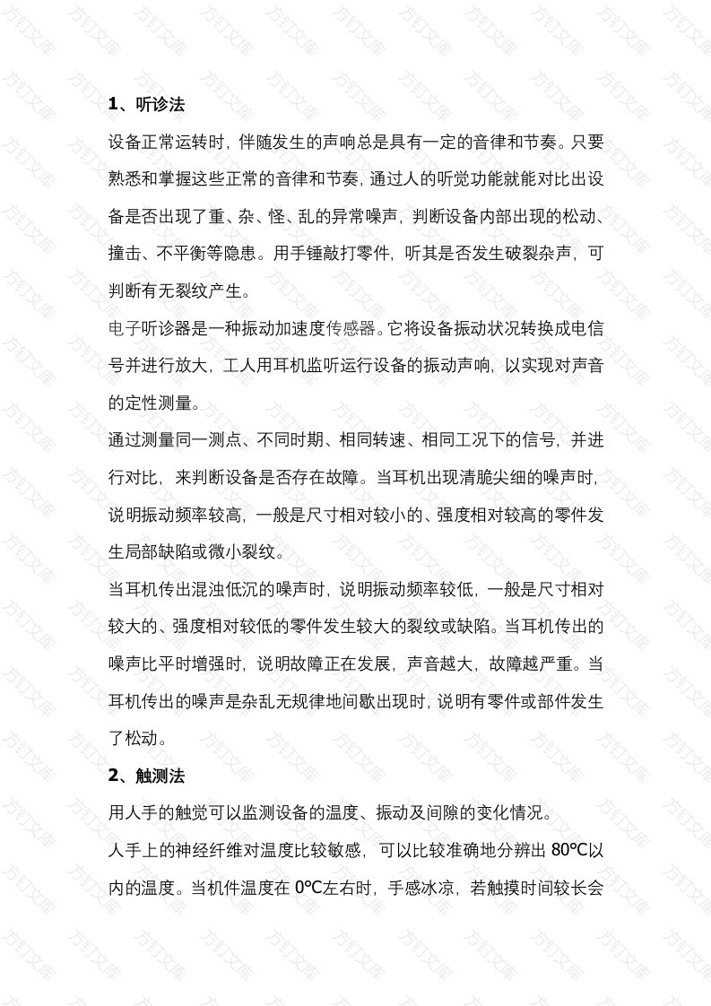听诊法设备正常运转时,伴随发生的声响总是具有一定的音律和节奏。只要熟悉和掌握这些正常的音律和节奏,通过人的听觉功能就能对比出设备是否出现了重、杂、怪、乱的异常噪声,判断设备内部出现的松动、撞击、不平衡等隐患。用手锤敲打零件,听其是否发生破裂杂声,可判断有无裂纹产生。电子听诊器是一种振动加速度传感器。它将设备振动状况转换成电信号并进行放大,工人用耳机监听运行设备的振动声响,以实现对声音的定性测量。通过测量同一测点、不同时期、相同转速、相同工况下的信号,并进行对比,来判断设备是否存在故障。当耳机出现清脆尖细的噪声时说明振动频率较高,一般是尺寸相对较小的、强度相对较高的零件发生局部缺陷或微小裂纹。当耳机传出混浊低沉的噪声时,说明振动频率较低,一般是尺寸相对较大的、强度相对较低的零件发生较大的裂纹或缺陷。当耳机传出的噪声比平时增强时,说明故障正在发展,声音越大,故障越严重。当耳机传出的噪声是杂乱无规律地间歇出现时,说明有零件或部件发生了松动。2、触测法用人手的触觉可以监测设备的温度、振动及间隙的变化情况人手上的神经纤维对温度比较敏感,可以比较准确地分辩出80℃以内的温度。当机件温度在0°℃左右时,手感冰凉,若触摸时间较长会产生刺骨痛感。10°C左右时,但一般能忍受。时,手感稍凉,随着接触时间延长,手感渐温。30℃左右时,手感微温,有舒适感。40℃左右时,手感较热,有微烫感觉。50℃左右时,手感较烫,用掌心按的时间较长,会有汗感。60℃左右时,手感很烫,但一般可忍受10s长的时间。70℃左右时,手感烫得灼痛,一般只能忍受3s长的时间,并且手的触摸处会很快变红。触摸时,应试触后再细触,以估计机件的温升情况。用手晃动机件可以感觉出0.1mm-0.3mm的间隙大校用手触摸机件可以感觉振动的强弱变化和是否产生冲击,以及溜板的爬行情况。用配有表面热电偶探头的温度计测量滚动轴承、滑动轴承、主轴箱电动机等机件的表面温度,则具有判断热异常位置讯速、数据准确触测过程方便的特点3、观察法文人的视觉可以观察设备上的机件有无松动、裂纹及其他损伤等可以检查润滑是否正常,有无干摩擦和跑、冒、滴、漏现象;可以查看油箱沉积物中金属磨粒的多少、大小及特点,以判断相关零件的磨损情况;可以监测设备运动是否正常,有无异常现象发生可以观看设备上安装的各种反映设备工作状态的仪表,了解数据的变化情况,可以通过测量工具和直接观察表面状况,检测产品质量,判断设备工作状况把观察的各种信息进行综合分析,就能对设备是否存在故障、故障部位、故障的程度及故障的原因作出判断。通过仪器,观察从设备润滑油中收集到的磨损颗粒,实现磨损状态监测的简易方法是磁塞法。它的原理是将带有磁性的塞头插入润滑油中,收集磨损产生出来的铁质磨粒,借助读数显微镜或者直接用人眼观察磨粒的大孝数量和形状特点,判断机械零件表面的磨损程度。用磁塞法可以观察出机械零件磨损后期出现的磨粒尺寸较大的情况。观察时,若发现小颗磨粒且数量较少,说明设备运转正常;若发现大颗磨粒,就要引起重视,严密注意设备运转状态;若多次连续发现大颗粒,便是即将出现故障的前兆,应立即停机检查,查找故障,进行排除。讲的很详细了,这些诊断方法需要较长时期的经验累积才能判断准确。补充一下,听诊可以用改锥尖(或金属棒)对准所要诊断的部位,用手握改锥把,放耳细听这样作可以滤掉一些杂音。温度手感判定训练用一结点式温度计,测出金属表面的50度,60度,70度,80度几种状态,对于低温时可以用描,考察手能接触的时间,根据不同时间来断定温度。对较高温度不能手摸时,可以淋少量的水滴观察水蒸发状态,然后记住这些状态。在诊断设备时使用,能得到较为准确的判