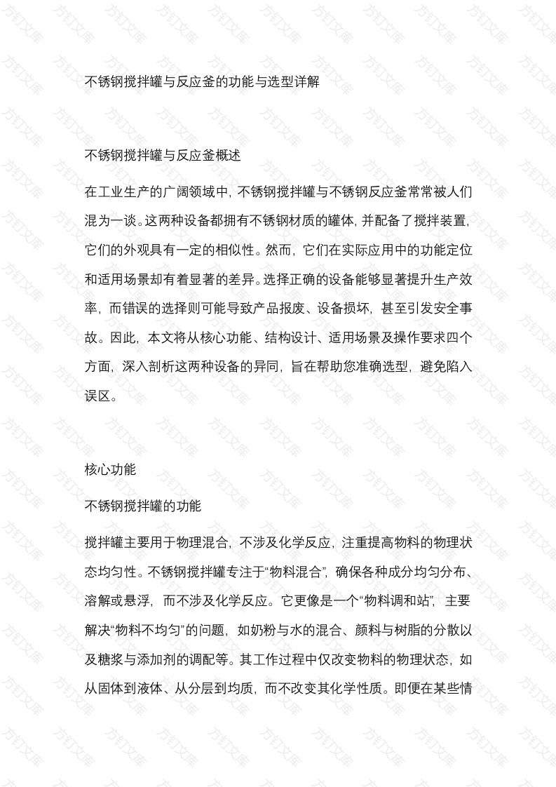 不锈钢搅拌罐与反应釜的功能与选型详解不锈钢搅拌罐与反应釜概述在工业生产的广阔领域中,不锈钢搅拌罐与不锈钢反应釜常常被人们混为一谈。这两种设备都拥有不锈钢材质的罐体,并配备了搅拌装置,它们的外观具有一定的相似性。然而,它们在实际应用中的功能定位和适用场景却有着显著的差异。选择正确的设备能够显著提升生产效率,而错误的选择则可能导致产品报废、设备损坏,甚至引发安全事故。因此,本文将从核心功能、结构设计、适用场景及操作要求四个方面,深入剖析这两种设备的异同,旨在帮助您准确选型,避免陷入误区。文核心功能不锈钢搅拌罐的功能搅拌罐主要用于物理混合,不涉及化学反应,注重提高物料的物理状态均匀性。不锈钢搅拌罐专注于“物料混合”确保各种成分均匀分布溶解或悬浮,而不涉及化学反应。它更像是一个“物料调和站,主要解决“物料不均匀”的问题,如奶粉与水的混合、颜料与树脂的分散以及糖浆与添加剂的调配等。其工作过程中仅改变物料的物理状态,如从固体到液体、从分层到均质,而不改变其化学性质。即便在某些情况下需要加热或冷却,也是为了更好地进行物理混合,而非引发化学反应。不锈钢反应釜的功能反应釜为化学反应提供可控环境,强调温度、压力的精准控制。不锈钢反应釜的核心使命是为化学反应打造一个既稳定又可控的环境,其中搅拌功能仅作为辅助手段存在。它仿佛是化学实验室的规模化版本,要求对温度、压力、搅拌速度等参数进行精细调控,以确保化学反应能够遵循预设的工艺流程。在运行过程中,反应釜不仅通过搅拌使物料均匀接触以促进反应,还通过夹套/盘管进行温度控制、压力监测以及惰性气体保护等功能,从而实现对反应速率、反应方向和产物纯度的精确把控。万文结构设计不锈钢搅拌罐与反应釜的结构差异方两者在罐体材质、厚度及内部结构等多方面差异显著,决定各自应用范围。不锈钢反应釜与常规搅拌罐虽共享罐体、搅拌系统及辅助装置三大组件,然而,为满足各自独特功能需求,其结构设计上存在着诸多不容忽视的差异。正是这些差异,直接界定了各自的应用范围与能力边界”。不锈钢搅拌罐主要采用304不锈钢材质,这种材质在性价比方面具有万优势,能够满足食品、日化等行业对于卫生及基础耐腐蚀性的要求。然而,对于那些涉及轻微腐蚀性物料的特定场合,316L不锈钢则会被选用。相较之下,不锈钢反应釜由于经常与强腐蚀性化学介质接触因此主要选用316L不锈钢,其耐腐蚀性远胜于304不锈钢。在罐体厚度方面,不锈钢搅拌罐的罐体设计相对轻薄,而反应釜的罐体设计则更为厚重。搅拌罐的厚度通常维持在3-5mm,。而反应釜的厚度可达15-25mm。这主要是因为反应釜需要应对高温高压的环境以及化学反应过程中产生的冲击力,厚实的罐体是确保设备安全稳定运行的关键。除此之外,两者的搅拌系统配置也存在显著差异。不锈钢搅拌罐的搅拌桨设计相对简单,而反应釜的搅拌桨更为多样化,以适应不同黏度和反应特性的物料,并且反应釜配备的电机功率更大,以应对更为强烈的搅拌阻力。万选择与适用适用场景搅拌罐适用于无需化学反应的混合场景,反应釜专用于需要反应控制的生产过程。不锈钢搅拌罐适用于不涉及复杂化学反应的物理混合过程,其典型应用包括食品饮料、日化和化工行业的多种配比。而不锈钢反应釜则专为涉及化学反应且需要控制反应参数的生产过程而设计,尤其在化工、制药及新能源等行业有广泛的应用。