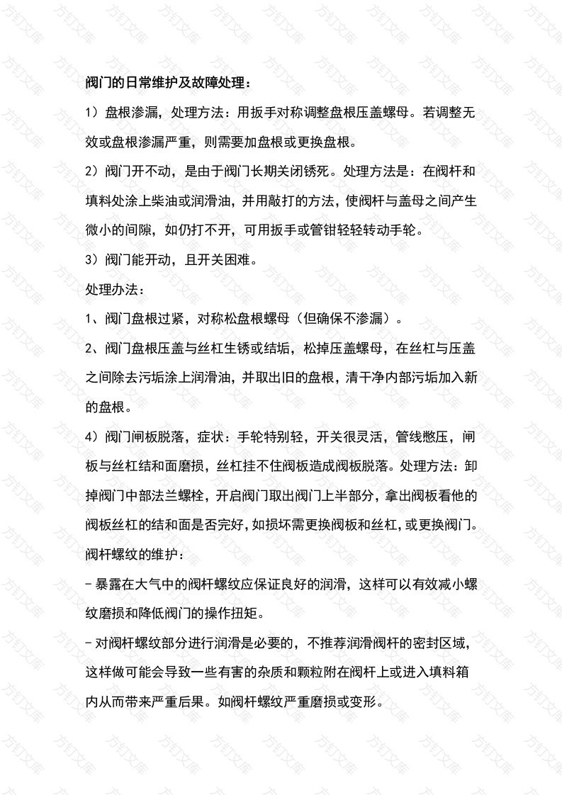 阀门的日常维护及故障处理:1)盘根渗漏,处理方法:用扳手对称调整盘根压盖螺母。若调整无效或盘根渗漏严重,则需要加盘根或更换盘根。2)阀门开不动,是由于阀门长期关闭锈死。处理方法是:在阀杆和填料处涂上柴油或润滑油,并用敲打的方法,使阀杆与盖母之间产生微小的间隙,如仍打不开,可用扳手或管钳轻轻转动手轮。3)阀门能开动,且开关困难。处理办法:1、阀门盘根过紧,对称松盘根螺母(但确保不渗漏)2、阀门盘根压盖与丝杠生锈或结垢,松掉压盖螺母,在丝杠与压盖之间除去污垢涂上润滑油,并取出旧的盘根,清干净内部污垢加入新的盘根。4)阀门闸板脱落,症状:手轮特别轻,开关很灵活,管线憋压,闸板与丝杠结和面磨损,丝杠挂不住阀板造成阀板脱落。处理方法:卸掉阀门中部法兰螺栓,开启阀门取出阀门上半部分,拿出阀板看他的阀板丝杠的结和面是否完好,如损坏需更换阀板和丝杠,或更换阀门。阀杆螺纹的维护:暴露在大气中的阀杆螺纹应保证良好的润滑,这样可以有效减小螺纹磨损和降低阀门的操作扭矩。对阀杆螺纹部分进行润滑是必要的,不推荐润滑阀杆的密封区域,这样做可能会导致一些有害的杂质和颗粒附在阀杆上或进入填料箱内从而带来严重后果。如阀杆螺纹严重磨损或变形。文体/盖密封的维护及垫片的更换,体/盖密封的维护体/盖密封检查是常规每月阀门维护检查的一个基本部分。如果是螺栓连接的体/盖密封产生泄漏,应当对阀盖螺栓螺母进行再紧固,每个螺栓的受力应尽量均匀。如果螺栓紧固后阀门仍然泄漏,就应当考虑更换密封垫片或检查垫片密封面是否有缺陷。对于高压、高温及温度/压力剧烈变化的工况,建议阀门在工作24小时后对阀盖螺栓螺母进行再紧固,以补偿可能发生的任何松动。垫片的更换1)检查垫片座的表面,看是否有刀痕、裂纹、刮痕或侵蚀斑点等缺陷,并且确保垫片座表面形状与使用的垫片形式一致。应采取必要措施努力将刀痕消除。2)检查垫片是否为指定的材料,确认垫片是否损坏和存在缺陷。3)检查并清理每个紧固件、垫片和法兰上螺母接触面,确认这些部位是否存在严重的磨损和蚀斑,如果以上所提到各项存在不可修补的损坏和缺陷,则应考虑更换零件。4)对凸面和平面法兰的安装,以法兰螺栓孔的中心圆为中心,在两法兰面间放上垫圈,均匀地扳紧螺栓和螺母使其紧固。5)如果垫片安装在一个凹面或凹槽内,垫片中心轮廓线应与凹面或凹槽的中心轮廓线对齐。如果连接面是垂直的,则应采取必要的措施,以保证在法兰紧固的过程中垫片的安装位置不会移动:6)首先按较小的力矩拧紧螺栓,建议采用星形顺序,如果垫片是金属材料,则这种情况将比非金属材料更加严重这需要几次拧紧,当一个螺栓被紧固后,相邻螺栓紧固时将会减小它所承受的应力,这样反复调整直到所有螺栓应力达到平衡状态时为止。1.更换中腔垫片前,应卸除系统和阀门内腔的压力,并将内腔介质排放干净,检查阀门不处在高温状态下,切断电动装置的电源。否则可能引起严重的人身伤害和设备损坏。2.对压力密封阀盖,严禁用户自行拆卸。因为压力密封阀盖的密封圈经拆卸,便很难再保持其密封性能。填料的更换1)卸除系统和阀门内腔的压力和介质。2)松开并拧下填料压板的螺母,此时压板和压套将能自由地沿阀杆上下移动,阀杆填料被暴露出来。3)移除旧的填料,小心使用移走填料的工具确保不要碰伤阀杆或填料函的内壁,彻底清理阀杆和填料函。4)添加填料:对于开口填料,朝相反的方向扭转开口端(填料环像“S”型),分别安装填料,压紧一环后再装下一环填料。5)开口填料的开口应交错呈90°或120°摆放。6)如果有隔环,应确保填料更换后隔环仍在最初的安装位置。7)拧紧填料压盖上的螺母。8)手动开关几次阀门,确保所有零件在压力下平稳工作,该动作还可以帮助“放置”填料,使填料受力均匀分布。9)几天后,检查阀门填料函的泄漏情况,并根据实际情况进行调整。1O)如果采用V形聚四氟乙烯填料,应注意以下几点: