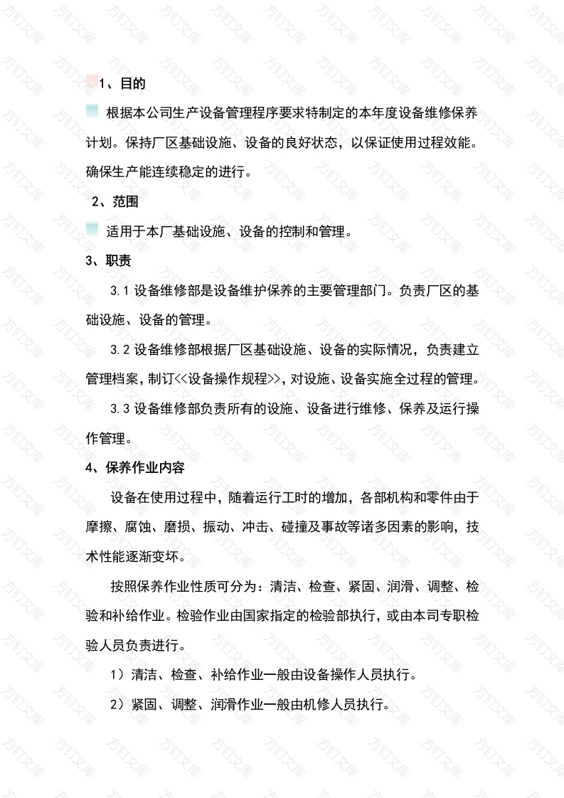 目的根据本公司生产设备管理程序要求特制定的本年度设备维修保养计划。保持厂区基础设施、设备的良好状态,以保证使用过程效能确保生产能连续稳定的进行。2、范围适用于本厂基础设施、设备的控制和管理文3、职责3.1设备维修部是设备维护保养的主要管理部门。负责厂区的基础设施、设备的管理。3.2设备维修部根据厂区基础设施、设备的实际情况,负责建立管理档案,制订<设备操作规程>,对设施、设备实施全过程的管理。3.3设备维修部负责所有的设施、设备进行维修、保养及运行操作管理4、保养作业内容设备在使用过程中,随着运行工时的增加,各部机构和零件由于摩擦、腐蚀、磨损、振动、冲击、碰撞及事故等诸多因素的影响,技术性能逐渐变坏。按照保养作业性质可分为:清洁、检查、紧固、润滑、调整、检验和补给作业。检验作业由国家指定的检验部执行,或由本司专职检验人员负责进行。1)清洁、检查、补给作业一般由设备操作人员执行。2)紧固、调整、润滑作业一般由机修人员执行。文万3压力容器作业由专业人员执行。万万电气作业由专业维修人员执行。保养制度本公司的设备保养制度是以预防为主,定运行工时进行保养的原则,分为例行保养,一级保养,二级保养,三级保养,季节性保养。设备保养的分级和作业内容是根据实际使用中技术情况的变化;设备的结构;使用的条件;环境条件等确定。是根据零件磨损规律,老化规律,把程度相近的项目集中起来,在达到正常磨损,老化将补破坏前进行保养,保持设备整洁,发现和消除故障隐患,防止设备早期损坏,达到设备维持正常运行的目的。5.1设备的例行保养设备的例行保养是各级保养的基础,直接关系到运行安全,能源的消耗,机件的使用寿命。例行保养作业由设备操作人负责执行,其作业中心内容以清洁、补给、安全、检视为主,坚持开工之前、运行中、收工后的三检制度。检查操纵机构、运行机件、安全保护装置的可靠性,维护整机和各总成部位的清洁,润滑必须润滑到位,紧固松动件等。5.1.1设备启动前的工作项目1)清洁设备,消除与生产无关的杂物2)检查各指示仪器,仪表,操作按钮和手柄以及紧急停止按钮是否正常。3)检查各部位有无漏水,漏气,漏电的现象。5.1.2设备运行中的检查1)注意各仪器仪表的工作情况,及各部分有无异常的声响。2)运行中注意安全部件是否正常。3)遇异常情况要及时向相关部门负责人报告5.1.3收工后的作业项目1)清洁设备外部,除去管道和容器内的生产用料,清洁各种零部件。2)放尽系统内的剩水,检查润滑油的质量,油量视需要补给。3)排除运行中发现的缺陷和故障。5.2设备的维修保养设备的维修保养是合理使用设备的重要环节,必须用强制性的保养制度取代那些随坏随修,以修代保,进行频繁的大拆大卸的做法。设备的维修保养就是预防为主的思想指导下,把设备保养作业项目按其周期长短分别组织在一起,分级定期执行,设备的定期保养分为:一级保养,二级保养,三级保养。5.2.1一级保养一级保养是各级技术保养的基础,各级技术管理部门必须十分重视一级保养工作的质量。由专业维修工负责执行。主要作业内容以清洁、润滑、紧固为主,检查操纵、指示用仪器、仪表、安全部位、各种阀门、润滑油油平面。5.2.2二级保养文万万万文万万万