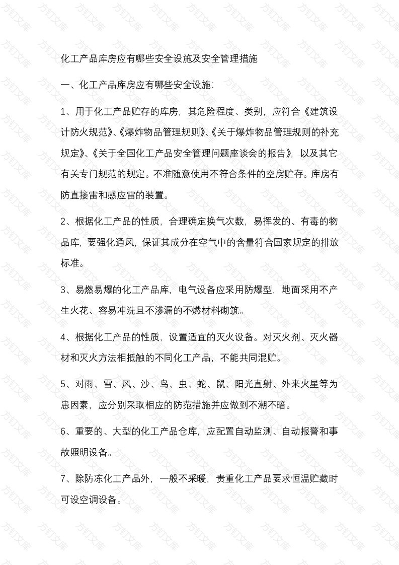 化工产品库房应有哪些安全设施及安全管理措施化工产品库房应有哪些安全设施1、用于化工产品贮存的库房,其危险程度、类别,应符合《建筑设计防火规范》、《爆炸物品管理规则》、《关于爆炸物品管理规则的补充规定》、《关于全国化工产品安全管理问题座谈会的报告》,以及其它有关专门规范的规定。不准随意使用不符合条件的空房贮存。库房有防直接雷和感应雷的装置。2、根据化工产品的性质,合理确定换气次数,易挥发的、有毒的物品库,要强化通风,保证其成分在空气中的含量符合国家规定的排放标准。易燃易爆的化工产品库,电气设备应采用防爆型,地面采用不产生火花、容易冲洗且不渗漏的不燃材料砌筑。4、根据化工产品的性质,设置适宜的灭火设备。对灭火剂、灭火器材和灭火方法相抵触的不同化工产品,不能共同混贮。5、对雨、雪、风、沙、鸟、虫、蛇、鼠、阳光直射、外来火星等为患因素,应分别采取相应的防范措施并应做到不潮不暗。6、重要的、大型的化工产品仓库,应配置自动监测、自动报警和事故照明设备。除防冻化工产品外,一般不采暖,贵重化工产品要求恒温贮藏时可设空调设备。万8要求隔离存放时,隔离层建造坚固不渗不漏。9、对放射性物品、剧毒物品仓库,应根据特殊需要,设置吸收射线的屏蔽层和消除吸收毒物的设施,有足够的安全隔离地带。库房还应该设危险性标志,有阻止无关人员接近的设施。10、库房内的货架或垛座应坚固,不晃动碰撞。架与架、垛与垛之间应有2~3米(m)的通道,架或垛距墙及柱不小于0.7米m),货架底层或垛座高离地0.3米(m),以便搬运、疏散、通风、防潮和检查二、化工产品库房应有安全管理措施保管员和值班员在上班期间,必须坚守岗位,并加强对库区、库房的巡视、检查工作,不得私自找人替班,不准在库房或库区内会客留宿他人。2、严格执行双人双锁制度和现场交接班制度,未当面交接班的,得交班离岗。3、严禁在库区内吸烟、用火,不得在库房内乱拉电线和私装用电设备,井下炸药临时存放点要注意安全用电,做好防火、防静电工作人离开时,必须全部切断电源。保管员、值班员要加强进入库区人员的检查,防止带入火种,引发事故。4、保管员、值班员要经常检查仓库报警装置、消防器具、避雷装置、和应急设施等是否完好、齐备有效,确保库房安全。未经批准库房内不准存放任何与帐面不符的货物、材料。6.库房内货物要堆放整齐,。类别明确,层高及存放量符合要求7、值班人员、保管员在上班期间不准饮酒、打扑克等干与工作无关的事。8、收存和发放必须当时登记下帐,做到帐目清楚,帐物相符,出入库手续不全或无手续的拒绝入库和发放。井下炸药临时存放点保管员要严格按规定对领料人员及手续进行审查,发现异常情况可不予发放。9、领用爆炸器材有毒有害化学品的领料单必须经领用单位、辅助生产部、武装保卫部领导签字或盖章后有效,缺一不可。10、库区周围要清洁,做到无杂草,不得堆放杂物。库区200米内不得使用手机。万万万