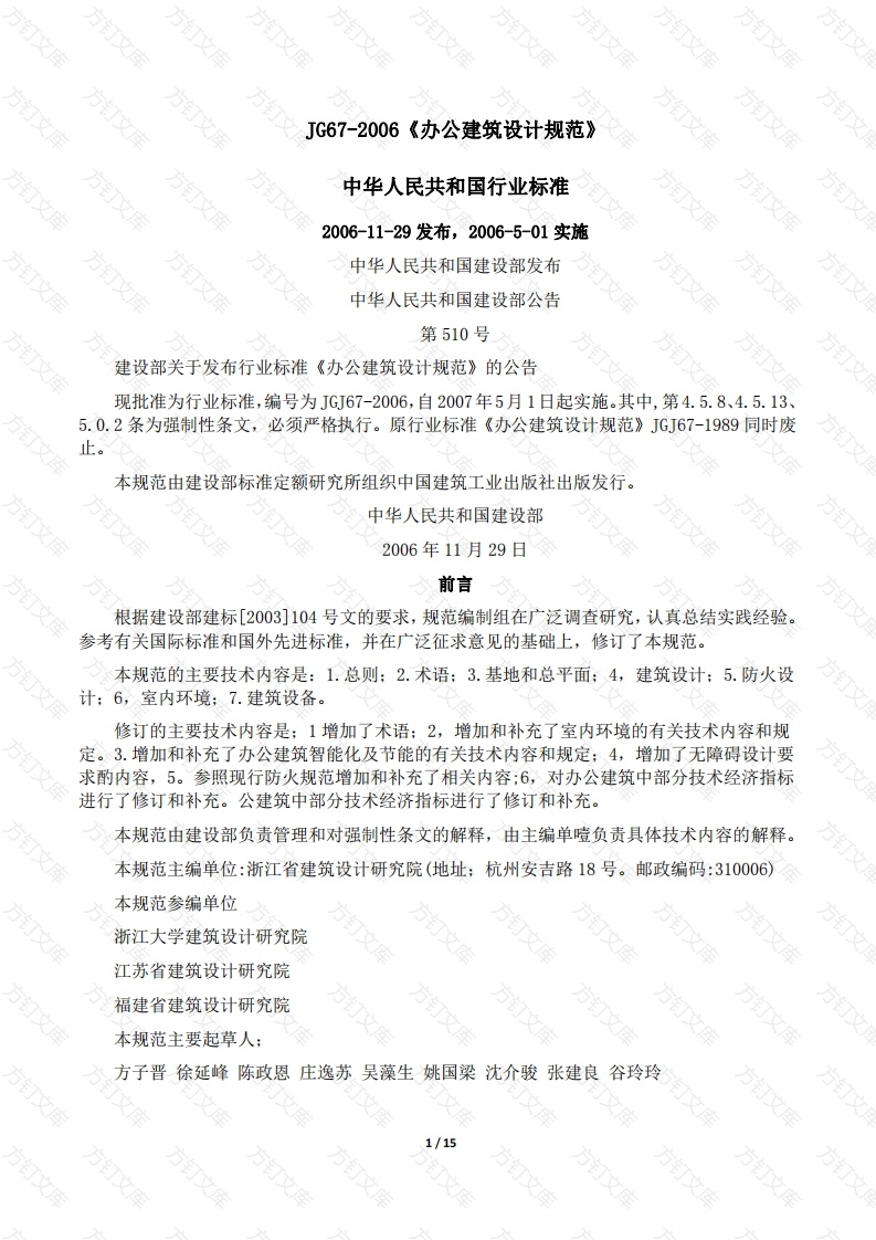JG67-2006《办公建筑设计规范》万文中华人民共和国行业标准2006-11-29发布,2006-5-01实施中华人民共和国建设部发布中华人民共和国建设部公告第510号建设部关于发布行业标准《办公建筑设计规范》的公告现批准为行业标准,编号为JGJ67-2006,自2007年5月1日起实施。其中,第4.5.8、4.5.13、5.0.2条为强制性条文,必须严格执行。原行业标准《办公建筑设计规范》JGJ67-1989同时废止。本规范由建设部标准定额研究所组织中国建筑工业出版社出版发行。中华人民共和国建设部2006年11月29日前言根据建设部建标[2003]104号文的要求,规范编制组在广泛调查研究,认真总结实践经验。参考有关国际标准和国外先进标准,并在广泛征求意见的基础上,修订了本规范。本规范的主要技术内容是:1.总则:2.术语:3.基地和总平面:4,建筑设计:5.防火设计:6,室内环境:7.建筑设备。修订的主要技术内容是;1增加了术语;2,增加和补充了室内环境的有关技术内容和规定。3.增加和补充了办公建筑智能化及节能的有关技术内容和规定:4,增加了无障碍设计要求酌内容,5。参照现行防火规范增加和补充了相关内容:6,对办公建筑中部分技术经济指标进行了修订和补充。公建筑中部分技术经济指标进行了修订和补充。本规范由建设部负责管理和对强制性条文的解释,由主编单噎负责具体技术内容的解释。本规范主编单位:浙江省建筑设计研究院(地址:杭州安吉路18号。邮政编码:310006)本规范参编单位浙江大学建筑设计研究院文江苏省建筑设计研究院福建省建筑设计研究院本规范主要起草人:方子晋徐延峰陈政恩庄逸苏吴藻生姚国梁沈介骏张建良谷玲玲1/15万文方方方方目总则2术语3基地和总平面3.1基地3.2总平面4建筑设计4.1一般规定4.2办公室用房4.3公共用房4.3公共用房4.4服务用房4.5设备用房5防火设计6室内环境方订6.1一般规定6.2室内小气候环境万6.3室内光环境6.4室内声环境7建筑设备7.1给水排水7.2暖通空调7.3建筑电气7.4建筑智能化本规范用词说明。附条文说明1总则1.0.1为保证办公建筑的设计质量,使其符合安全、卫生、适用以及技术、经济等方面的要求,制定本规范。1.0.2本规范适用于所有新建、改建、扩建的办公建筑的设计。1.0.3办公建筑设计应依据使用要求分类,并应符合表1.0.3的规定:表1.0.3办公建筑分类类别示例设计使用年限耐火等级类特别重要的办公建筑100年或50年级二类重要办公建筑50年不低于二级三类普通办公建筑25年或50年不低于二级1.0.4办公建筑设计除应符合本规范规定外,尚应符合国家现行有关标准的规定。2术语2.0.1办公建筑office building供机关、团体和企事业单位办理行政事务和从事各类业务活动的建筑物。2.0.2公寓式办公楼apartment-office building由统一物业管理,根据使用要求,可由种或数种平面单元组成。单元内设有办公、会客空间和卧室、厨房和厕所等房间的办公楼。2,0.3酒店式办公楼hotel-office building提供酒店式服务和管理的办公楼。2.0.4综合楼multiple-use building由两种及两种以上用途的楼层组成的公共建筑。2.0.5商务写字楼business office building在统一的物业管理下,以商务为主,由种或数种单元办公平面组成的租赁办公建筑。2.0.6开放式办公室open office space灵活隔断的大空间办公空间形式。2.0.7半开放式办公室semi-open office space由开放办公室和单间办公室组合而形成的办公空间形式。2.0.8单元式办公室unit-typed office space由接待空间、办公空间、专用卫生间以及服务空间等组成的相对独立的办公空间形式。2.l.9单间式办公office space in singler moclule一个开间(亦可以几个开间)和以个进深为尺度而隔成的独立办公空间形式。3基地和总平面3.1基地3.1.1办公建筑基地的选择,应符合当地总体规划的要求。3,1.2办公建筑基地宜选在工程地质和水文地质有利、市政设施完善且交通和通信方便的地段。3.1.3办公建筑基地与易燃易爆物品场所和产生噪声、尘烟、散发有害气体等污染源的距离,应符合安全、卫生和环境保护有关标准的规定。3.2总平面/15万