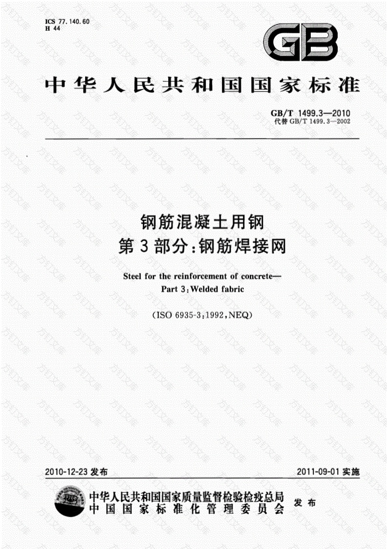 Cs77.140.60H44中华人民共和国国家标准GB/T1499.3-2010代替GB/T1499.3-2002钢筋混凝土用钢第3部分:钢筋焊接网Steel for the reinforcement of concrete-Part 3:Welded fabric(1S06935-3:1992,NEQ)2010-12-23发布2011-09-01实施中华人民共和国国家质量监督检验检疫总局中国国家标准化管理委员会发布GB/T1499.3-2010前言GB/T1499分为三个部分:第1部分:热轧光圆钢筋,第2部分:热轧带肋钢筋,第3部分:钢筋焊接网。本部分为GB1499的第3部分,对应国际标准IS06935-3:1992《钢筋混凝土用钢第3部分钢筋焊接网》,与IS06935-3:1992的一致性程度为非等效,本部分按照GB/T1,1一2009给出的规则起草。本部分代替GB/T1499.3一2002(钢筋混凝土用钢筋焊接网》.本部分与GB/T1499.3-2002相比,主要变化如下:标准名称变更:在图2中增加并筋焊接网的图示:钢筋焊接网实际重量与理论重量的允许偏差改为士4.0%,对于公称直径不小于6mm的冷轧带肋钢筋用于焊网时,增加了冷轧带肋钢筋的最大力伸长率和强屈比的要求:修改重量偏差取样方法:增加重量偏差计算公式:增加特征值检验:修改验收批次重量,增加附录A定型钢筋焊接网型号F系列,增加附录C“桥面、,建筑用标准钢筋焊接网”,本部分的附录A为规范性附录,附录B、附录C为资料性附录,本部分由全国钢铁工业协会提出,本部分由全国钢标准化技术委员会(SAC/TC183)归口,本部分起草单位:中冶建筑研究总院有限公司、治金工业信息标准研究院、安徽马钢比亚西钢筋焊网有限公司、北京邢锅焊网科技发展有限贵任公司、中国建筑科学研究院、广州市番禺裕丰钢铁有限公司、山西和易金属制品有限公司、天津市建科机械制造有限公司、安阳市合力高速冷轧有限公司、江苏联峰实业股份有限公司、莱芜钢铁集团有限公司、国家金属制品质量监督检验中心、首钢总公司。本部分主要起草人:朱建国、冯超、张莹、徐尚华、乔国军、顾万黎、刘宝石、文济、董眷海、陈振东、本部分所代替标准的历次版本发布情况为:GB/T1499.3-2002,GB/T1499.3-2010钢筋混凝土用钢第3部分:钢筋焊接网GB/T1499的本部分规定了钢筋混凝土用钢筋焊接网的定义、分类与标记、订货内容、技术要求、试验方法、检验规则、包装标志及质量证明书。本部分适用于采用冷轧带肋钢筋或(和)热轧带肋钢筋以电阻焊接方式制造的钢筋焊接网,采用光面或其他类别钢筋焊接而成的钢筋焊接网可参考使用。2规范性引用文件下列文件对于本文件的应用是必不可少的,凡是注日期的引用文件,仅注日期的版本适用于本文件。凡是不注日期的引用文件,其最新版本(包括所有的修改单)适用于本文件。GB/T228.1金属材料拉伸试验第1部分:室温试验方法(GB/T228.1一2010,IS06892-1:2009,MOD)GB/T232金属材料弯曲试验方法(GB/T232一1999,eqv IS07438,1985(E)GB1499.2钢筋混凝土用钢第2部分:热轧带肋钢筋GB13788怜轧带肋钢筋GB/T17505钢及钢产品交货一-般技术要求YB/T081冶金技术标准的数值修约与检测数值的判定原则3术语和定义下列术语和定义透用于本文件,3.1钢筋焊接网welded fabric纵向钢筋和横向钢筋分别以一定的间距排列且互成直角、全部交叉点均用电阻点焊方法焊接在一起的网片,如图1所示。图1钢筋焊接网形状