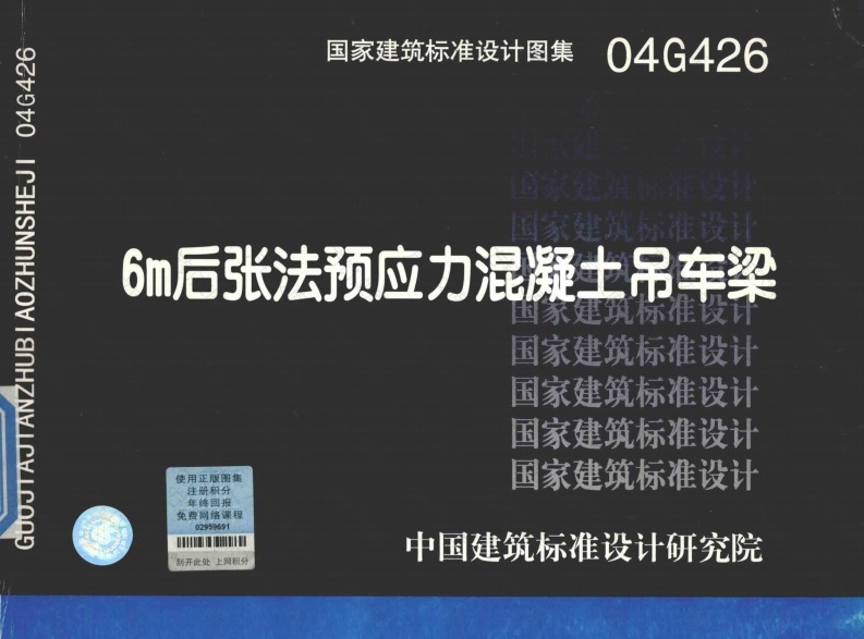 国家建筑标准设计图集04G4266加后张法预应力混凝土吊车梁国家建筑标准设计国家建筑标准设计国家建筑标准设计使用正版图集国家建筑标准设计注册积分0295691中国建筑标准设计研究院文国家建筑标准设计图集04G4266m后张法预应力混凝土吊车梁方批准部门:中华人民共和国建设部组织编制:中国建筑标准设计研究院万中國计刻虫版社文方文图书在版编目(CIP)数据郑重声明:本图集已授权“全国家建筑标准设计图集,6m后张法预应力混凝土吊车国律师知识产权保护协作网”对著梁,04G426/中国建筑标准设计研究院组织编制.一北作权(包括专有出版权)在全国范京:中国计划出版社,201.1围予以保护,盗版必究。ISBN978-7-80242-573-6举报盗版电话:010-63906404Ⅲ.①建筑设计一中国一图集2后张法预加应力一混凝土结构一梁一结构设计一中国图集W.①TU206②TU375.104-64010-68318822中国版本图书馆CP数据核字(2010)第263015号国家建筑标准设计图集6m后张法预应力混凝土吊车梁2011年1月第1版2011年1月第1次印制15BN978-7-80242-573-6