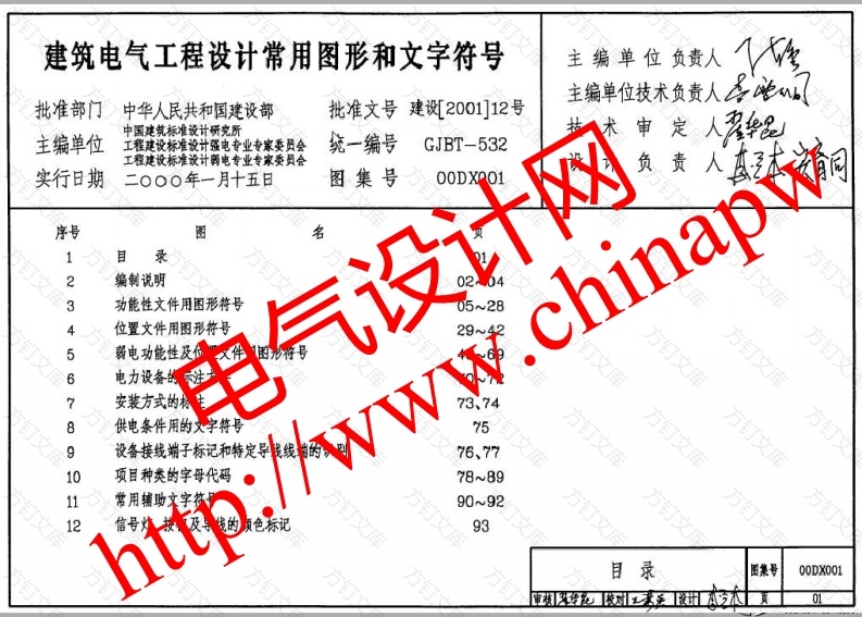 建筑电气工程设计常用图形和文字符号主编单位负责人主编单位技术负责人多批准部门中华人民共和国建设部批准文号建[2001]12号主编单位中国建筑标准设计研究所定人实行日期序号123456电气设计网8工程建设标准说计强电专业专家委员会GJBT-532工程建设标准設计弱电专业专家委员会二000年一月十五日图集号图名目录编制说明功能性文件用图形符0528位置文件用图形符安装方式的病775976、7710项目种类的字母代码78~89119092129300DX001编制说明电气简图用图形符号第7部分:开关、控制和保护器件一.主题内容与适用范围GB/T4728.7-2000(idt IEC60617-7:1996)本图集按照我国工业与民用建筑电气技术用文件的编制需要,依据电气简图用图形符号第8部分:测量仪表、灯和信号装置最新领布的国家标准、EC标准编制了工程设计中常用的功能性文件、GB/T8.8-2000(dt IEC60617-8:1996)位置文件的图形和文字符号:电力设备的标注安装方式的标注提出供电气简部分:电信:交换和外围设备9电条件的文字符号,设备接线端子标记和特定导线线端的识跳项目种类的字母代码常用辅助文字符号:信号灯、按钮及导线的颜色标记篷内客供编制、阅读、实落工业与民用建筑电气工程技术文件时使用4728.10-1999(idt21996)二编制依据a置图GEidC60617-11:1996准设计编制工作计划》通知电气技术用文件部分一般要求2.引用的标准电气简图用图形符号和其气技术的编制第2部分:功能性简图它常用符号98idt1EC60617-21996)GB/T6988.2-1997(idt IEC61082-2:1993)体和连接件电气技术用文件的编制第3部分:接线图和接线表GB/1728.GB/T6988.3-1997(idt IEC61082-3:1993)电气设备用图形特号GB/T4728.4-199 (idt IEc6017-4:1996GB/T5465.2-1996(idt IEC60417:1994)5部电气技术中的项目代号GB5094-85(eq?EC60750:1983)20 idt IEC60617-5:1996)电器设备接线端子和特定导线线端的识别及应用字母数字系简图用电能的发生与转换472.6-2000(idt1EC60617-6:1996编制说明02统的通则GB/T4026-92(eqv IEC60445:1988)三相交流系统短路电流计算GB/T15544-1995电气技术中的文字符号制订通则GB/T7159-87火灾报警设备专业术语GB/T4718-199610kV及以下变电所设计规范GB50053-94电学和磁学的量和单位导体的颜色或数字标识GB3102.5-93 eqv IS031-5:1992)GB7947-1997(idt IEC60446:1989过程检测用图形符号和文字代号用颜色及辅助方法标记指示器和操作件修订草稿EC16(中夹办公)70号文准电工成套装置中的指示灯颜色和按钮的颜色GB/T2682电工术语电气继电器GB/T50311-2000GB/T2900.17-94eqm程设计施工图集电工术语低压电器YD5082-99GB/T 290与图形符号YD/T5015-95电工术语高压开ECGY/T5059-1997电工术语旋转电机低压接触器JB2455-85安全防范系统通用图形符号GA/T74-94电工术语控制电机GA/T229-1999电工术语电力系统保护三使用说明1.本图集编入的图形特号可根据需要缩小或放大系统的GB/T6567.1-86形符号GB/T4327-93编制说明03