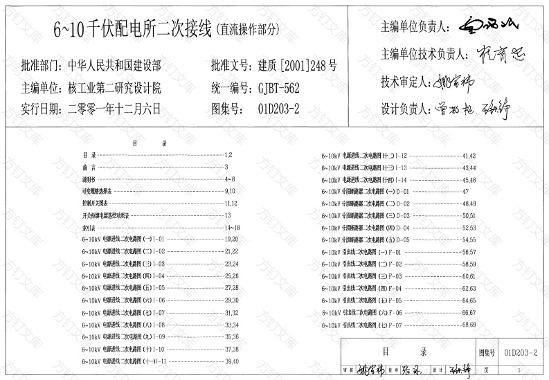 6~10千伏配电所二次接线(值流操作部分)主编单位负责人:批准部门:中华人民共和国建设部批准文号:建质[2001]248号主编单位:核工业第二研究设计院统一编号:GJBT-562实行日期:二零零一年十二月六日图集号:01D203-241,42前言43,4445.469,1011,12141819,2050515259212256572824252660.612930333468.6935,36录01D203-239,401147273115116,1177677118-119-120,121122,123124,125-128,129100,101102103104万111,12-113录01D203-2言道用电气装置标准图集(6(10)千伏配电所二次接线》(直流操作)(01D203-2)的编制任务。在阁集编制过程中,得到了中耳建筑标差设计研究所及西安高压电器研究所的大力支持,隳定该图集除作为各有关设计院在工作中选用外,还要用来作为各高压成套设备造厂制造的依据。中国建筑标差设计研究所于1999年10月在该所召开了该图集修政方案研讨会,确定了该图集的修成方案。并于2000年12月在该所召开了对该图集餐政方案的初步审查会。在工作过程中,航天,兵器、建筑、纺织、机械、电子、解铁、冶金、煤炭、铁道国防等有关设计、安装、运行部们对因集编制提出了很多宝贵意见,特此表示感谢!核工业第二研究设计院万二零零一年十一月文方前言图集号01D203-23