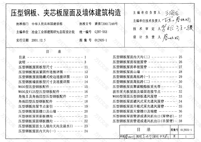 压型钢板、夹芯板屋面及墙体建筑构造主编单位负贵人批准部门中华人民共和国建设部批准文号建质「20011248号技术审主编单位冶金工业部建筑研究总院设计院统一编号GJBT-553设计负实行日期2001.12.5图集号01J925-1责人目录目录--1压型钢板屋面内天沟(二)3压型钢板屋面双坡屋脊压型锅板屋面板型尺寸、11文压型钢板屋面单坡屋脊压型钢板屋面紧固件连接详图12压型钢板屋面山墙压型钢板屋面隐藏式咬边连接详图13压型钢板屋面高低跨(一)压型钢板墙面板型尺寸及连接详图14600型压型钢板配件15压型钢板屋面聚碳酸酯板采光带W600及V125型压型钢板配件16波形采光板屋面及墙面连接节点角弛IⅡ及角弛Ⅲ型压型钢板配件17W600型屋面压型钢板通风屋脊角弛Ⅲ型压型钢板配件18压型钢板屋面避风式采光通风屋脊3压型钢板房屋节点索引19压型钢板屋面开散式采光通风屋脊压型钢板屋面檐口及山墙20压型钢板屋面天窗檐口及端壁36乐型钢板屋面彩板擒沟21压型钢板屋面管道或通风机出口(屋脊处)一37压型钢板屋面钢板檐沟压型钢板屋面管道或通风机出口(非屋脊)一38压型钢板屋面女儿墙内天沟及滋水口23压型钢板屋面内天沟(一)目录01J925-1压型钢板墙体构造39夹芯板屋面聚碳酸酯板采光带64压型钢板墙体窗套压型钢板构件穿墙构造04夹芯板屋面波形采光板连接节点65荚芯板屋面波形采光板屋脊及避雷带66压型钢板墙体雨棚42夹芯板屋面天窗檐口及端壁67压型钢板墙体上屋面梯43夹芯板屋面管道及通风机出口68压型钢板屋面墙体变形缝及雨水管44夹芯板墙体构造压型钢板屋面内天沟变形缝45夹芯板墙体窗套压型钢板墙体外门46夹芯板屋面及墙体变形缝压型钢板墙体外门详图47夹芯板雨棚压型钢板屋面避雷带48夹芯板墙体外门压型钢板复合保温屋面构造(一)49夹芯板墙体外门详图压型钢板复合保温屋面构造(二)50夹芯板墙体窗式空调器安装图012335压型钢板复合保温墙体构造51夹芯板墙体分体式空调器安装图夹芯板屋面板型尺寸及连接52防水卷材型复合保温压型屋面板体系(一)一77夹芯板墙体板型尺寸及横向连接53防水卷材型复合保温压型屋面板体系(二)78夹芯板常用板型配件54夹芯板组合房屋节点索引79夹芯板房屋节点索引55夹芯板组合房屋节点(一)夹芯板屋面檐口及檐沟56夹芯板组合房屋节点(二)81夹芯板屋面女儿墙内天沟及构件穿墙构造一57夹芯板组合房屋节点(三)8夹芯板屋面内天沟(一)58夹芯板组合房屋节点(四)夹芯板屋面内天沟(二)59夹芯板组合房屋雨棚夹芯板屋面夹芯板天沟及檐沟60附表(常用板型最大允许檩距)夹芯板屋血屋脊相关技术贤料夹芯板屋面山墙及女儿墙夹芯板屋面高低跨63目录图集号01J925-1库说明1.设计依据2.2本图集压型钢板屋而构造所选用的板型连接方式为本图集根据下列文件,标准和规范编制:紧固件连接及咬边连接两种,其墙面构造所选用的板型建设部建设[1994]664号文件《一九九四年通用建筑标连接方式为紧固件连接;夹芯板屋面构造所选用的板型准设计编制计划》连接方式为紧固件连接,其墙面构造所选用的板型连接《屋面工程质量验收规范》GB50207-2002方式为紧固件连接及挂件连接两种,《压型金属板设计施工规程》YBJ216-88本图集未包括扣压连接的板型,其常规构造做法可《冷弯尊壁型钢结构技术规范》GBJ18-87参考本图集及相关规范规定,《彩色涂层钢板与钢带》GB/T12754-912.3本图集培体构造主要为竖排板型墙体,横排板型墙体《建筑用压型钢板》GB/T12755-91应增加相应水平搭接节点。《建筑物隔热用硬质聚氨酯泡沫塑料》QB/T3806-19992.4本图集适用于抗震设防烈度<9度的地区。当建筑物《金属面硬质聚氨酯夹芯板》JC/T868-2000内有振动设备时,应依照国家相关标准及规程规定增设相《隔热用聚苯乙烯泡沫塑料》QB/T3807-1999《金属面聚苯乙稀夹芯板》JC689-19982.5本图集配合使用的屋而坡度宜>5%;在积雪厚度较《绝热用岩棉、矿渣棉及其制品》GB/T11835-1998大及腐蚀环境中屋面坡度宜>8%。压型钢板波高<50mm《金属面岩棉、矿渣棉夹芯板》JC/T869-2000时,其屋面坡度应适当加大。当屋面坡度<5%时,其坡度取值应根《压型金属板设计施工规程》(YBJ216-88)进行排水验算,2.1本图集透用于非保温型及保温型的工业与民用建筑,主要包括压型钢板和夹芯板的屋面和墙体建筑构造,说明图集号01J925-13