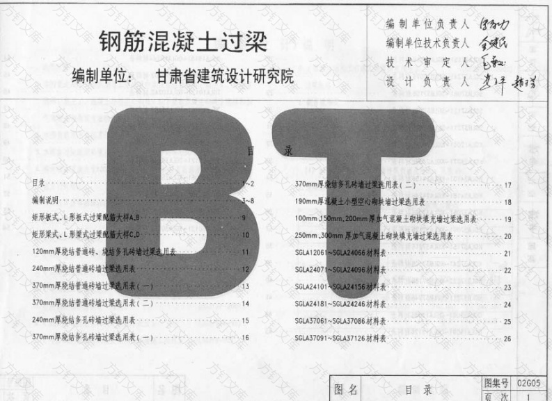 钢筋混凝土过梁钉编制单位技术负责人,编制单位:甘肃省建筑设计研究院编制说明18192021SGA2407SGLA24096材料表22132314SGA24181-SGA24246材养表24240mm厚烧结多孔砖墙过梁选用表15SGA37061~SGLA37086材料表26图名图集号02G05文270GA19151~0GA19244材料素444529TGA10121-GA10242材料表463047TGA15121~TGA15242材料表4832TGA20061-TGA20102材料表49KGLA24071-KGLA24096精料表TGA20121~TGA20242材料表50KGA24101~KGA24156材料表345135TGA25121-TGA25242材料表52365337TGA30121~TGA30242材料表54KGA37151~KGA37216精料表383940KGLB37211-KGLB37246材料表41420GA19091~0GA19126材料表43库图名目录图集号02G05页次2钉编制(设计)说明适用范围G850204-2002)表二,设计依据烧结普通砖墙(G50009-2001)120240370370(G850010-2002)截面形式2403704《建筑抗震设计规范)(G850011-2001)(JGJ137-2001)60.2060,.120.18060.120.180120.180240.300240.300240.300(JG/T14-95)过梁代号SGLASGLASGLASGLB图名编制说明图集号02G05页次3