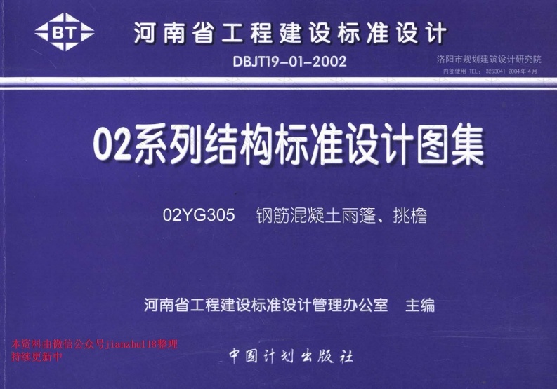 河南省工程建设标准设计DBJT19-01-2002洛阳市规划建筑设汁研究院02系列结构标准设计图集02YG305钢筋混疑土雨篷、挑檐河南省工程建设标准设计管理办公室主编本资料由微信公众号jianzhul l8整理持续更新中钢筋混凝土雨篷挑檐主编单位技术负责人贾燕敏l技术审定人贾燕敏编制单位新乡市建筑设计研究院图集号02YG305目录7374A~H型雨篷平面及详图AH型雨篷选用表A~H型雨篷板材料表21497982-8485-118707172料由微信公众号jianzhul l8整理更新中02YG305图名洛阳市规划建筑设计研究院1适用范围物体厚度:240mm,370mm600.800二b壳环境类别,设计使用年限50年,建筑结构安全等缓为二级,无沿2设计内容21设计内容400.600.8002.2构件规格:本围集中尺寸单位除注明外均为mm,1.《建筑结构可靠度设计统一标准》G950068-2001体厚度:240mm.370mm2.《建筑结构荷载规范)G850009-2001其他尺寸见下表:4.《混凝士结构说计规范)GB50010-20025.《建筑抗度设计规范)G350011-20016.《多孔砖密体结构技术规范》G137-2001800300,5001000,1200,1500,1800,2100.24001000400,6001000,1200,1500,1800,2100.2400持续更新中1500600,.9001500,1800,2100.2400洛阳市规划建筑设计研究院02YG305内部使用2
