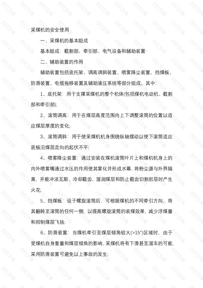 采煤机的安全使用万采煤机的基本组成基本组成:截割部、牵引部、电气设备和辅助装置二、辅助装置的作用辅助装置包括底托架、调高调斜装置、喷雾降尘装置、挡煤板、防滑装置、电缆拖移装置及辅助液压系统等部分组成。其中:1、底托架:用于支撑采煤机的整个机体(包括煤机电动机、截割部和牵引部):2、滚筒调高:用于在煤层高度范围内上下调整滚筒的位置以适应煤层厚度的变化:3、滚筒调斜:用于使采煤机机身围绕纵轴摆动以使下滚筒适应底板沿煤层走向的起伏不平;4、喷雾降尘装置:通过安装在煤机滚筒叶片上和煤机机身上的内外喷雾嘴通过水压的作用使其雾化并形成水幕,将粉尘源与外界隔离,并能冲淡瓦斯、冷却截齿、湿润煤层和防止截齿切割岩层时产生火花5、挡煤板:设于螺旋滚筒后,可根据煤机的不同牵引方向,将其翻转至滚筒的任何一侧,以提高螺旋滚筒的装煤效果,减少浮煤量和抑制煤层飞扬;6、防滑装置:当煤机牵引至煤层倾角较大(>15)区域时,由于受煤机自身重量和煤层倾角的影响,采煤机将有下滑甚至溜车的可能采用防滑装置可避免以上事故的发生电缆拖移装置:用于在采煤机上、下采煤时自动收、放煤机电缆和喷雾水管,替代人工盘电缆和水管的繁重体力劳动7、辅助液压系统:通过改变液压油的流动方向来实现煤机滚筒的跳高、挡煤板的翻转、机身的调斜、防滑装置和制动装置的控制等。三、采煤机安装时的安全注意事项1、电气设备必须完好,保护装置全,信号准确,否则不得入井。2、在井下下放设备是时,在设备靠近煤帮侧,严禁站立人员3、利用绞车拖拉设备入位或合口时,人员必须躲开钢丝绳。4、人工安置滚轮、滑靴时,底托架必须上吊下支,以防伤人。5、安置截割部时,作业人员必须找好退路,防止设备碰撞伤人6、落支架前梁时,防止顶板落矸伤人,操作支架应由专人负责。7、防止起吊过程中碰、撞、帖帮而造成片帮事故。起吊人员不得在被吊物可能摆动侧停留。8、安装附件时,防护装置必须齐全可靠,防止机组下滑伤人9、接通电源,严格执行停送电有关制度。10、运转前,通知所有人员离开牵引链、滚筒周围。四、采煤机维护时的安全注意事项1、必须使用有合格证并检查合格的牵引链和连接环,防止断链伤人。2、开盖检测时,必须检查顶板及四周环境,以确保安全3、补装或更换截齿时,如果滚筒上、下3米范围内有人作业必须采取护帮护顶措施:必须打开隔离开关切断电源,打开离合器闭锁工作面刮板输送机,并且滚筒前后3个支架之内不得升降支架4、在检修过程中,应做好采煤机的防滑工作,时刻注意周围环境变化,确保安全工作。5、工作人员不得随意进入煤壁侧,严禁进入刮板输送机禁区进行检查。6、整机试验时,机组滚筒前后15米范围内不得有人文7、一定要注意电缆破口、接头处漏电。8、对所有涉及人身安全问题,如支顶不严、顶板不好片帮、溜煤等,必须采取有效措施。五、采煤机的安全使用要求1、采煤机司机必须经过培训考核合格后持证上岗,熟练掌握采煤机起动前的检查内容,起动和停止采煤机的程序。2、采煤机禁止带负荷起动和频繁起动;一般情况下不允许用隔离开关或断路器断电停机:不允许在电动机开动的情况下,操纵滚筒离合器。3、无冷却水或冷却水压力、流量达不到要求或喷雾系统不工作时,不准割煤。4、防止采煤机滚筒截割支架顶梁和刮板输送机铲煤板等物体。端头割煤时,除司机外其他作业人员都要躲到安全地点,并严防滚筒割工字钢或单体支柱造成危险。5、采煤机运行时,要随时注意电缆的拖移情况,防止损坏电缆。必须在电动机即将停止时操作截割部离合器。文