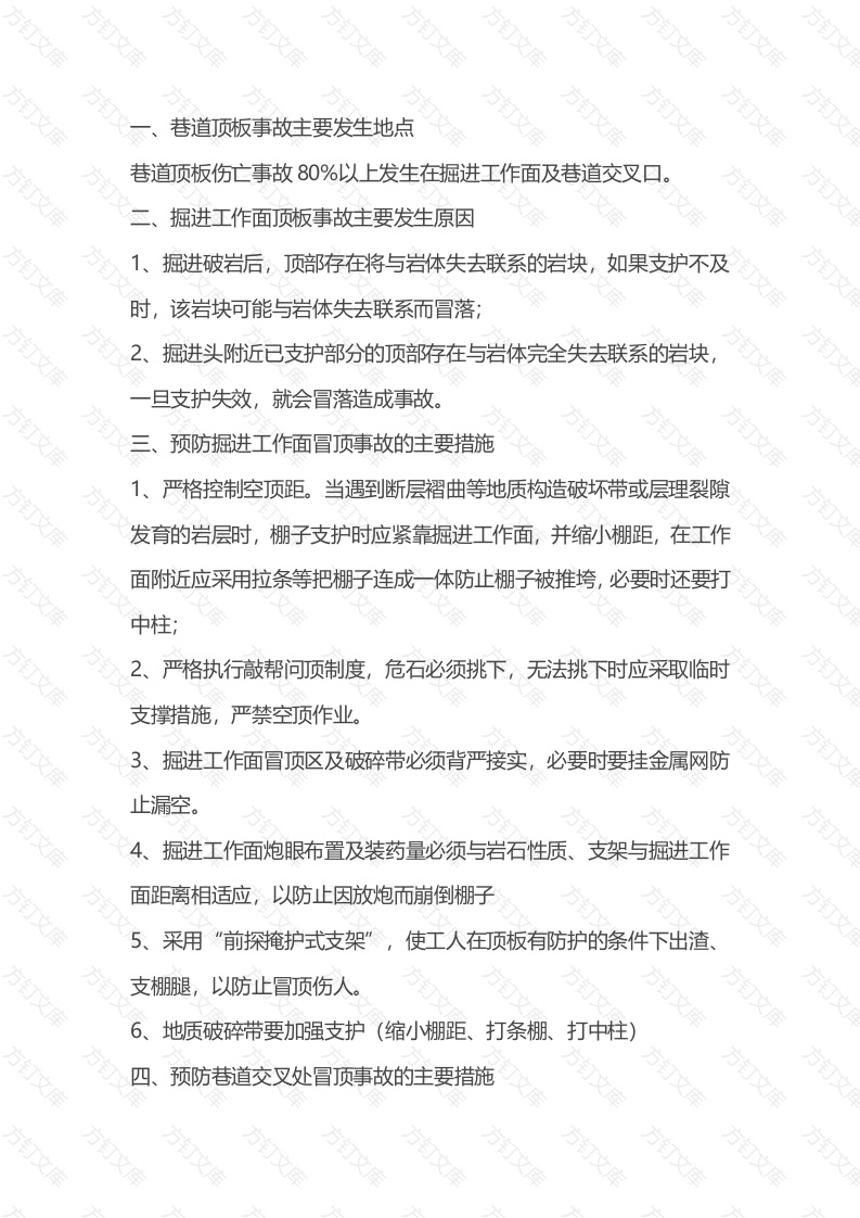 巷道顶板事故主要发生地点巷道顶板伤亡事故80%以上发生在掘进工作面及巷道交叉口掘进工作面顶板事故主要发生原因1、掘进破岩后,顶部存在将与岩体失去联系的岩块,如果支护不及时,该岩块可能与岩体失去联系而冒落;2、掘进头附近已支护部分的顶部存在与岩体完全失去联系的岩块,旦支护失效,就会冒落造成事故。预防掘进工作面冒顶事故的主要措施1、严格控制空顶距。当遇到断层褶曲等地质构造破坏带或层理裂隙发育的岩层时,棚子支护时应紧靠掘进工作面,并缩小棚距,在工作面附近应采用拉条等把棚子连成一体防止棚子被推垮,必要时还要打2、严格执行敲帮问顶制度,危石必须挑下,无法挑下时应采取临时支撑措施,严禁空顶作业。掘进工作面冒顶区及破碎带必须背严接实,必要时要挂金属网防止漏空。4、掘进工作面炮眼布置及装药量必须与岩石性质、支架与掘进工作面距离相适应,以防止因放炮而崩倒棚子5、采用“前探掩护式支架”,使工人在顶板有防护的条件下出渣支棚腿,以防止冒顶伤人。6、地质破碎带要加强支护(缩小棚距、打条棚、打中柱)四、预防巷道交叉处冒顶事故的庄要措施文万万巷道交叉处冒顶事故的主要原因巷道交叉处冒顶事故往往发生在巷道开岔的时候,因为开岔口需要架设抬棚替换原巷道棚子的棚腿,如果开岔处巷道顶部存在与岩体失去联系的岩块,并且围岩正向巷道挤压,而新支设抬棚的强度不够,或稳定性不够,就可能造成冒顶事故。2、预防措施(1)开岔口应避开原来巷道冒顶的范围;(2)必须在开口抬棚支设稳定后再拆除原巷道棚腿,不得过早拆除,切忌先拆棚腿后支护抬棚:(3)注意选用抬棚材料的质量与规格,保证抬棚有足够的强度:(4)当开口处围岩尖角被挤压坏时,应及时采取加强抬棚稳定性的措施;五、支架支护巷道冒顶的主要预防措施1、支架支护巷道冒顶的类型支架支护巷道的冒顶可分为压垮型、漏垮型和推垮型(1)压垮型冒顶是因巷道顶板或围岩施加给支架的压力过大,损坏了支架,造成巷道顶部已破碎的岩块冒落。(2)漏垮型冒顶是因无支护巷道或支护失效(非压坏)巷道顶部存在游离岩块,这些岩块在重力作用下冒落。(3)推垮型冒顶是因巷道顶帮破碎岩石,向巷道中心线有推力,如果这部分巷道支架的支护质量差,可能会被推倒而冒顶。支架支护巷道冒顶的主要地点万文掘进工作面10米内,断层破碎带部附近各10米内,巷道交岔点附近各10米,冒顶处附近各10米内,这些都是容易发生顶板事故的地点,巷道支护必须适当加强。3、支架支护巷道冒顶的主要预防措施(1)巷道应布置在稳定没有裂隙的岩体中,尽量避开采掘工作而带来的不利影响;(2)加强巷道支架的支护质量。支架施工时要严格按工序质量要求进行,并特别注意顶与帮的背严背实问题,杜绝支架与围岩间的空顶与空帮现象;(3)凡因支护失效而空顶的地点,重新支护时应先护顶,再施工(4)巷道替换支架时,必须先支新支架,再拆老支架;(5)锚喷巷道成巷后要定期检查危陷悬空岩石并及时处理。最后需要强调的是防矿山顶板事故最根本的措施,是加强人的顶板事故防范意识和加强采掘工作面工程质量管理。我国煤矿的顶板事故,许多是由管理不严、违章作业和工程质量低劣造成的。据有关统计资料对顶板事故原因统计分析,顶板事故的发生将近一半是因为工程质量低劣造成的。可见抓好工程质量是加强顶板管理的基础。通过对顶板事故的分析,应当采取有针对性的措施,改善和加强顶板管理。首先要提高认识,加强领导,落实责任,加强现场管理,区队干部要现场指挥和检查,发现质量不合格立即返工重来;每个采掘工作面开工前全体职工必须对工程质量标准进行学习,做到应知应会,