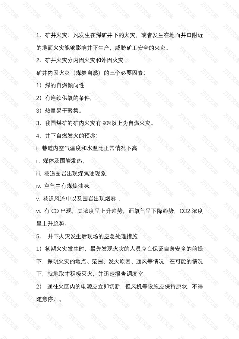 矿井火灾:凡发生在煤矿井下的火灾,或者发生在地面井口附近的地面火灾能够影响井下生产,威胁矿工安全的火灾。2、矿井火灾分内因火灾和外因火灾矿井内因火灾(煤炭自燃)的三个必要因素煤的自燃倾向性,方1)2)有连续供氧的条件,3)热量易于聚集。3、我国煤矿的矿内火灾有90%以上为自燃火灾。4、井下自燃发火的预兆:巷道内空气温度和水温比正常情况下高,煤体及围岩发热,方订巷道围岩出现煤焦油现象iv.空气中有煤焦油味,万文巷道风流中以及围岩出现烟雾有CO出现,其浓度呈上升趋势,而氧气呈下降趋势CO2浓度呈上升趋势。井下火灾发生后现场的应急处理措施:1)初期火灾发生时,最先发现火灾的人员应在保证自身安全的前提下,探明火灾的地点、范围、发火原因、通风等情况,在可能的情况下,就地取才积极灭火,并迅速报告调度室。2通往火区内的电源应立即切断,但风机等设施应保持原状,不得随意停开如受火灾威胁现场人员应在班组长、老工人的带领下,沿避灾路线有组织的撤离撤离时应佩戴好自救器。5)电器火灾应在切断电源后扑灭,否则只能使用干粉灭火器。灭火过程中,应注意不要使煤尘飞扬,造成爆炸事故。7)万一被堵在火区内,要采取正确的自救方法:可利用躲避硐、巷道等设置避难硐室。在避难硐室应做好长时间避灾的准备,一方面进入前应在硐室外留有衣物矿灯等明显标志,便于救护人员发现;另-方面,避难时应保持安静,避免不必要的体力消耗,借以延长避灾时间。硐室内除留一盏矿灯外,其余矿灯应关闭。在硐室内可不间断的敲打铁器、岩石等,发出求救信号。避难人员还应坚定信心,相信自己一定能得救。四、瓦斯爆炸事故方万1、瓦斯爆炸条件瓦斯浓度达到5%2)氧含量在12%以上有点燃瓦斯的火源。万2、矿井瓦斯的危害1)瓦斯爆炸(2)煤与瓦斯突出(3)(瓦斯浓度高、通风不良、瓦斯与二氧化碳浓度虽不高但氧浓度低,氮浓度低文爆炸时产生的物理化学现象1)产生高温。瓦斯浓度在9.5%时,在敞开空间最高温度达1850℃,在半敞开空间最高温度达1850℃以上,在封闭空间最高温度达2650℃2)产生高压。爆炸气体压力可达爆炸前的7.4倍或10.2倍(1850℃2650℃)。3)产生冲击波。1800一2000米/秒,可形成正向和反向冲击波4)产生大量的有毒有害。C0浓度一般在0.4%以上。(很短时间致命中毒)。3、瓦斯爆炸危害性。方造成人员伤亡。烧伤、中毒外伤。破坏井巷、设备、设施。预防措施1)防止瓦斯积聚2)控制瓦斯引爆火源3)加强瓦斯的检查与检测4)有防止灾害扩大的措施。发生瓦斯爆炸的应急措施位于事故地点进风侧的人员应迎着风流撤退;位于事故地点回风侧的人员可佩带自救器或用湿毛巾捂鼻,尽量走捷径较快的绕到新鲜风流中去或顺风流撤退。若路线较长,爆炸波与火焰可能袭来时,应卧倒或俯伏于水沟中,以减轻灼伤。没有佩带呼吸器的人员,不得进入或佩带自救器进入救人。若路线较长,且有烟雾,CO浓度较高,无法佩带自救器逃生,应设置避难硐室进行自救