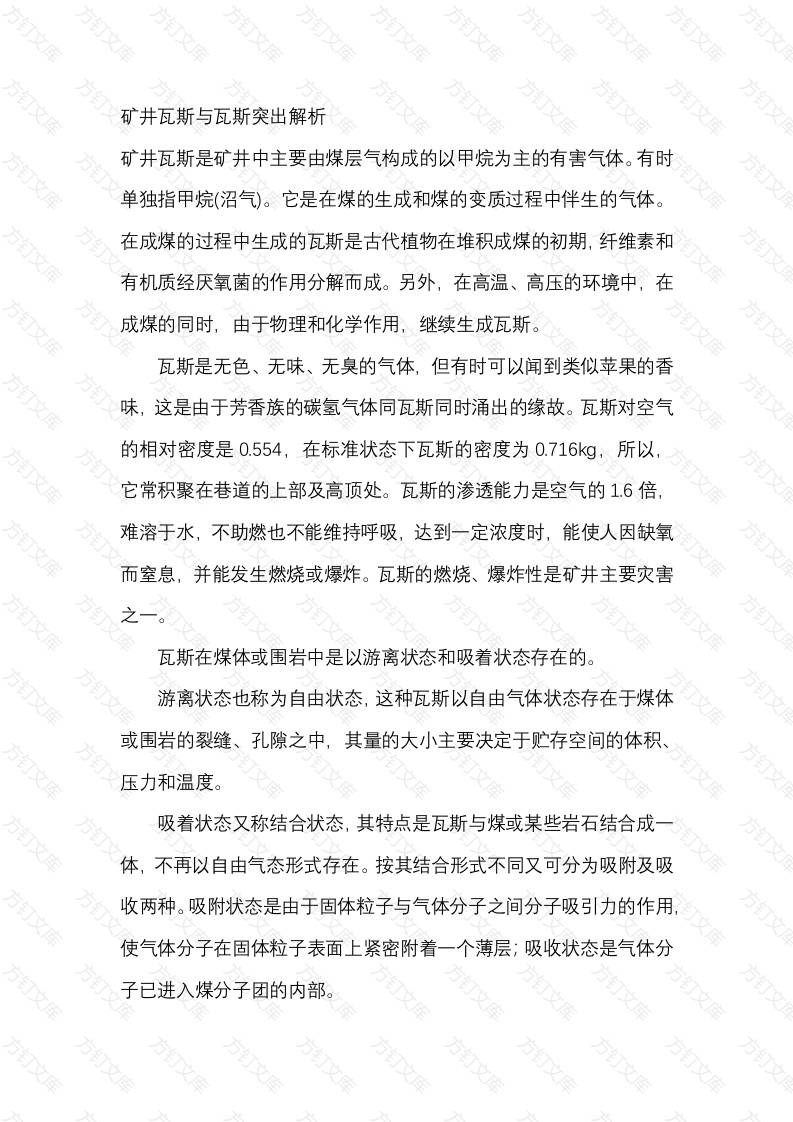 矿井瓦斯与瓦斯突出解析矿井瓦斯是矿井中主要由煤层气构成的以甲烷为主的有害气体。有时单独指甲烷(沼气)。它是在煤的生成和煤的变质过程中伴生的气体。在成煤的过程中生成的瓦斯是古代植物在堆积成煤的初期,纤维素和有机质经厌氧菌的作用分解而成。另外,在高温、高压的环境中,在成煤的同时,由于物理和化学作用,继续生成瓦斯。瓦斯是无色、无味、无臭的气体,但有时可以闻到类似苹果的香味,这是由于芳香族的碳氢气体同瓦斯同时涌出的缘故。瓦斯对空气的相对密度是0.554,在标准状态下瓦斯的密度为0.716kg,所以,它常积聚在巷道的上部及高顶处。瓦斯的渗透能力是空气的1.6倍难溶于水,不助燃也不能维持呼吸,达到一定浓度时,能使人因缺氧而窒息,并能发生燃烧或爆炸。瓦斯的燃烧、爆炸性是矿井主要灾害瓦斯在煤体或围岩中是以游离状态和吸着状态存在的。游离状态也称为自由状态,这种瓦斯以自由气体状态存在于煤体或围岩的裂缝、孔隙之中,其量的大小主要决定于贮存空间的体积压力和温度。吸着状态又称结合状态,其特点是瓦斯与煤或某些岩石结合成体,不再以自由气态形式存在。按其结合形式不同又可分为吸附及吸收两种。吸附状态是由于固体粒子与气体分子之间分子吸引力的作用,使气体分子在固体粒子表面上紧密附着一个薄层;吸收状态是气体分子已进入煤分子团的内部。几种状态的瓦斯处于不断变化的动平衡之中,在一定条件下会互相转化。当压力、温度变化时,游离瓦斯转化为吸着瓦斯称为吸附吸附瓦斯转化为游离瓦斯称解吸。矿井瓦斯等级的划分矿井瓦斯等级是以相对瓦斯涌出量的大小来划分的。《煤矿安全规程》规定,在一个矿井中,只要有一个煤(岩)层发现瓦斯,该矿井即定为瓦斯矿井,并依照矿井瓦斯等级工作制度进行管理。矿井瓦斯等级,根据矿井相对瓦斯涌出量、矿井绝对瓦斯涌出量和瓦斯涌出形式划分为:(1)低瓦斯矿井:矿井相对瓦斯涌出量小于或等于10立方米/吨且矿井绝对瓦斯涌出量小于或等于40立方米/分。(2)高瓦斯矿井:矿井相对瓦斯诵出量大于10立方米/吨且矿井绝对瓦斯涌出量大于40立方米/分。(3)煤(岩)与瓦斯(二氧化碳)突出矿井什么是瓦斯喷出和煤(岩)与瓦斯突出?瓦斯喷出和煤(岩)与瓦斯突出是瓦斯的特殊涌出形式。瓦斯的涌出形式分为普通涌出和特殊涌出。普通涌出,是指瓦斯从煤层或岩层表面非常细微的缝隙中缓慢均匀而持久地涌出。其涌出的面积广、时间长,是瓦斯涌出的主要形特殊涌出可以分为瓦斯喷出和煤(岩)与瓦斯突出两种。瓦斯喷出是指大量瓦斯突然喷出的现象,喷出的时间可长、可短数天或数年)。每昼夜的喷出量可达数百立方米煤(岩)与瓦斯突出(简称突出),是在一瞬间(几秒钟或几分钟)突然喷出大量瓦斯和煤炭(岩石),并伴随有强烈的声响和强大的冲击动力现象。什么是瓦斯突出?瓦斯突出是指随着煤矿开采深度的增加、瓦斯含量的增加,在煤层中形成了在地应力作用下,瓦斯释放的引力作用下,使软弱煤层突破抵抗线,瞬间释放大量瓦斯和煤而造成的一种地质灾害。煤矿开采深度越深,瓦斯瞬间释放的能量也会越大。煤和瓦斯突出主要发生在煤层平巷掘进、上山掘进和石门揭煤时,有的矿井在回采工作面也发生煤和瓦斯突出。瓦斯突出和瓦斯爆炸是两个概念,但灾害都来自于瓦斯。瓦斯突出是一种地质灾害,在大量的有害气体瞬间诵入后,会形成窒息,但不一定会发生爆炸事故。但如果出现以下三种情况后会引发爆炸事故,一是与空气中氧气含量达到12%以上,二是瓦斯浓度达到5%至16%之间,三是遇到明火,点火温度达到650度以上。煤和瓦斯突出有预兆吗?煤和瓦斯突出前大多数都有预兆,归纳起来分有声预兆和无声预兆1.有声预兆1)响煤炮。在煤层内发出像机关枪、炮击声。由于条件不同,音大小、间隔时间也不相同。2)突然压力增大。支柱来劲,发出咔咔的响声,或发出劈裂折断文