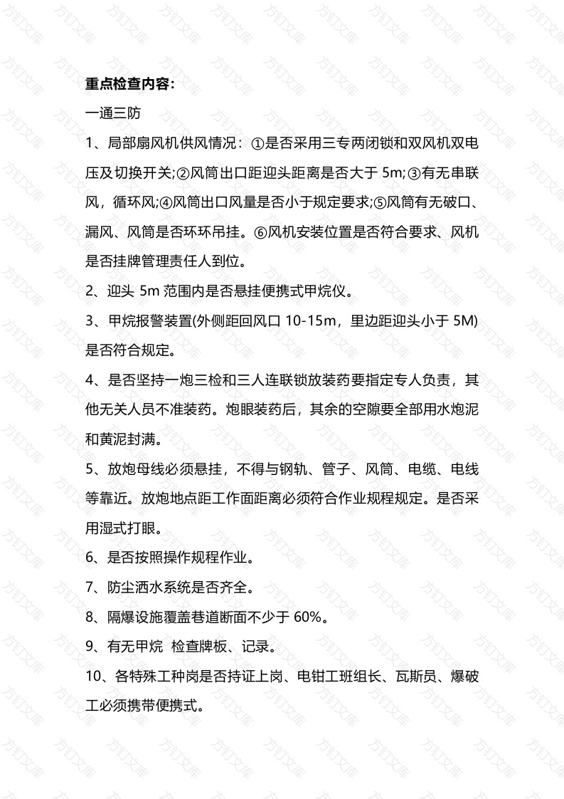 重点检查内容:通三防1、局部扇风机供风情况:①是否采用三专两闭锁和双风机双电压及切换开关;②风筒出口距迎头距离是否大于5;③有无串联风,循环风:④风筒出口风量是否小于规定要求;⑤风筒有无破口、漏风、风筒是否环环吊挂。⑥风机安装位置是否符合要求、风机是否挂牌管理责任人到位。2、迎头5m范围内是否悬挂便携式甲烷仪。3、甲烷报警装置(外侧距回风口10-15m,里边距迎头小于5M)是否符合规定。4、是否坚持一炮三检和三人连联锁放装药要指定专人负责,其他无关人员不准装药。炮眼装药后,其余的空隙要全部用水炮泥和黄泥封满。5、放炮母线必须悬挂,不得与钢轨、管子、风筒、电缆、电线等靠近。放炮地点距工作面距离必须符合作业规程规定。是否采用湿式打眼。6、是否按照操作规程作业。文7、防尘洒水系统是否齐全。8、隔爆设施覆盖巷道断面不少于60%。9、有无甲烷检查牌板、记录。10、各特殊工种岗是否持证上岗、电钳工班组长、瓦斯员、爆破工必须携带便携式。万材料存放是否整齐、挂牌管理、影响通风行人。日常重点检查内容1、各作业地点甲烷、二氧化碳浓度2、采掘地点风量。3、掘进面有无空顶、空帮。4、超前支护、临时支护、防倒器、撑杆使用情况。5、风电、瓦斯闭锁是否动作正常。6、风机切换情况。7、开门地点工程情况。8、施工地点的措施落实情况。方订9、便携仪、瓦斯传感器安装使用情况。10、通风设施是否完好。11、主副井斜坡安全设施完好情况。12、运输机头、机尾、绞车、地杆、地锚、戗柱、压柱是否齐全可靠,是否安装声光信号。13、扩修地点工程、措施落实。14、扩修、回收地点风量、CH4情况。15、特殊工种上岗情况。方16、主副斜井排水点排水情况、水量变化情况。万17、电器设备有无失爆。18、有无扒蹬、跳车、坐皮带现象。方万万掘进巷道检查的内容:巷道的掘进毛断面不得小于设计规定。其局部超高和每侧的局部超宽,不应大于设计规定150毫米(平均不应大于75毫米)。2、巷道的锚杆间距按照措施误差不超正负100mm。3、在掘进工作面打眼前,应清理顶板两帮的浮石。方是否要求使超前支护和前探梁。巷道支护的检查1、掘进工作面临时支护和久支护必使用前探梁护顶,前探距离不得超过1架棚距,严禁空顶作业。2、临时支护距工作面的距离一般不大于1米,锚喷巷道不大于2-3米,软岩层应紧跟工作面。3、倾斜巷道使用的U型钢必须保持足够的迎山角,每架U型钢使用不少于三道的金属拉杆。4、斜巷掘进工作面上方要设牢固的安全挡板。距工作面上方20米处,要设安全栏遮挡。5、砌碹用的碹胎,使用前要进行检查挑选,每架碹胎组立完成后,至少要打3个压顶楔子,跨度超过5米的巷道砌碹拱时,碹内必须打上顶子,防止碹胎变形或塌落。6、碹体和顶帮之间必须用不燃物充满充实。万万文