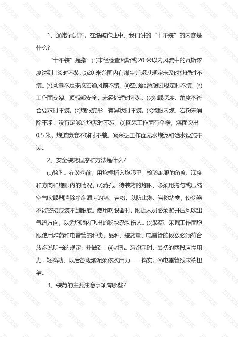 1通常情况下,在爆破作业中,我们讲的“十不装”的内容是什么?”十不装”是指:(1)未经检查瓦斯或20米以内风流中的瓦斯浓度达到1%时不装。(2)20米范围内有煤尘并超过规定未及时处理时不装。(3)风量不足未改善通风前不装。(4)空顶距离超过规定时不装。(⑤)工作面支架、顶板部安全,未经处理时不装。(6炮眼深度、角度不符合要求时不装。(口)炮眼变形,有异状时不装。(8炮眼内煤、除干净,没有足够的炮泥时不装。(9)回采工作面有伞檐,煤面突出0.5米,炮道宽度不够时不装。0采掘工作面无水炮泥和洒水设施不2安全装药程序和方法是什么?(1)验孔。在装药前,用炮棍插入炮眼里,检验炮眼的角度、深度和方向和炮眼内的情况。(2)清孔。待装药的炮眼,必须用掏勺或压缩空气吹眼器清除净炮眼内的煤、岩粉,以防止煤、岩粉堵塞,使药卷不能密接或装不到眼底。使用吹眼器时,附近人员必须避开压风吹出气流方向,以免炮眼内飞出的粉块杂物伤人。(3)装药:采掘工作面炮眼使用炸药和电雷管的种类、品种、装药量、电雷管的段数必须符合放炮说明书的规定,并做到:(4封孔。装炮泥时,最初的两段应慢用力,轻捣动,以后各段炮泥须依次用力捣实。(⑤)电雷管线未端扭装药的主要注意事项有哪些?万万文万万万(1)硬化的硝酸铵类炸药在装药前必须用手揉松,使其不成块状,但不得将药包,纸损坏,严禁使用硬化到不能用手揉松的硝酸铵类炸药也不能使用破乳或不能用手揉松的乳化炸药。(2)不得使用水分含量超过0.5%的铵梯炸药。(3)潮湿或有水的炮眼应使用抗水型炸药。(4)不得装“盖药”或“垫药”。(⑤不得装错电雷管的段数。(6)毫秒电雷管不得跳段使用。()一个炮眼内不得装两个引药。4、什么是正向起爆和反向起爆?各适用于什么条件?起爆药卷位于柱状装药的外端,靠近炮眼口,雷管底部朝向眼底的起爆方法为正向起爆。反向起爆时:炸药的爆轰波和固体颗粒的传递与飞散方向是向着眼口的。当这些微粒飞过预先被气态爆炸产物所加热的瓦斯时,就很容易使瓦斯点燃。而正向起爆题则不同。飞散的炸药颗粒是向炮眼内部飞散的,不易引爆瓦斯,所以,在瓦斯煤尘爆炸危险的工作面,正向起爆比反向起爆安全性高。但是,反向起爆具有比正向起爆的爆破效果好、炮眼利用率高的优点。这是由于反向起爆爆轰波的方向与爆破岩石方向一致,能充分发挥炸药的爆炸能量。5、为什么装药前要清扫炮眼,并使药卷彼此密接?炮眼内存有煤岩粉,容易发生瓦斯爆炸事故或爆破事故。(1)炮眼内有煤、岩粉,使装入炮眼内的药卷不能紧靠在一起,或者装不到眼底,在药卷之间,药卷和眼底之间,存有一段煤、岩粉,影响炸药能量的传播,以致造成残爆、拒爆和爆燃或留下残眼。(2)煤粉是可然物质,极易被爆炸火焰然烧,喷出孔外,有点燃瓦斯、煤尘的危险。(3)若煤粉参与炸药的爆炸反应,改变了原有爆炸的氧平衡,成为负氧平衡,使爆生气体的一氧化碳量增高,影响人身健康。6、为什么装药时要用炮棍将药卷轻轻推入而不能捣实药卷?()目前煤矿井下普遍使用的炸药,如果用炮棍捣实,使炸药密度大于最佳密度,就会使炸药的敏感度降低,造成爆炸反应不完全,还可能出现爆炸中断而产生拒爆。(2)用炮棍捣实药卷,会使药卷膨胀,直径加大,:把药卷的防潮外皮捣破,当眼内有水时,使炸药受潮,影响炸药的爆破性能。(3)用炮棍捣实药卷,有可能捣破电雷管的脚线皮或捣断脚线,尤其危险的是有可能捣响雷管。7、为什么潮湿或有水的炮眼,应使用抗水炸药?煤矿井下使用的炸药,除无瓦斯的井筒开凿时,有的使用抗水性能强的硝化甘油类炸药外,绝大部分矿井均使用硝酸铵类炸药。吸水和吸潮的硝酸铵炸药,极易产生拒爆、残爆或爆燃。虽然常有将非抗水性炸药套上防水套,或是将一定数量药卷串穿在防水的油纸筒或塑料防水套里,但装药时,易将防水套划坏,或装、放炮间隔时间稍长,水进入防水套内,便起不到防水作用。于是防水套在炮眼内参加爆炸反应,改变了炸药的氧平衡,增加爆生气体中有毒气体一氧化碳含量,《煤矿安全规程》规定,潮湿和有水的炮眼应使用抗水炸药。8、装药时,聚能穴的方向为什么必须一致指向传爆方向?装药时,将引药和炸药的聚能穴都一致指向传爆方向,可以增强传爆能力,确保传爆稳定,改善爆破安全状况,并提高爆破效果,否