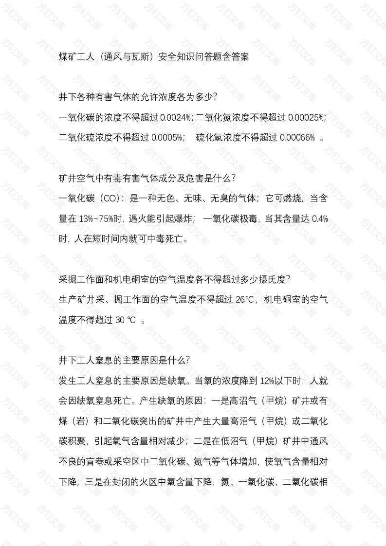 煤矿工人(通风与瓦斯)安全知识问答题含答案井下各种有害气体的允许浓度各为多少?氧化碳的浓度不得超过0.0024%;二氧化氮浓度不得超过0.00025%;氧化硫浓度不得超过0.0005%;硫化氢浓度不得超过0.00066%矿井空气中有毒有害气体成分及危害是什么?氧化碳(CO):是一种无色、无味、无臭的气体;它可燃烧,当含量在13%~75%时,遇火能引起爆炸;一氧化碳极毒,当其含量达0.4%时,人在短时间内就可中毒死亡。采掘工作面和机电硐室的空气温度各不得超过多少摄氏度?生产矿井采、掘工作面的空气温度不得超过26℃,机电硐室的空气温度不得超过30℃井下工人室息的主要原因是什么?发生工人室息的主要原因是缺氧。当氧的浓度降到12%以下时,人就会因缺氧室息死亡。产生缺氧的原因:一是高沼气(甲烷)矿井或有煤(岩)和二氧化碳突出的矿井中产生大量高沼气(甲烷)或二氧化碳积聚,引起氧气含量相对减少;二是在低沼气(甲烷)矿井中通风不良的盲巷或采空区中二氧化碳、氮气等气体增加,使氧气含量相对下降;三是在封闭的火区中氧含量下降,氮、一氧化碳、二氧化碳相万对增加。矿井瓦斯爆炸的条件是什么?矿井瓦斯爆炸的必要条件(1)瓦斯浓度。正常情况下,瓦斯爆炸的下限为5%,上限为16%,所以瓦斯浓度在5-16%范围内,遇火则发生爆炸。(2)引火温度。瓦斯的点燃温度为650~750℃。所以井下的明火、电弧火花、放炮、自然发火、架线机车火花、甚至铁器撞击、磨擦产生的火花等都可以引燃瓦斯。(3)有足够的氧气。当井下空气中氧气含量低于12%时,则瓦斯遇火也不发生爆炸。预防瓦斯爆炸的技术措施有哪些?预防瓦斯爆炸的技术措施主要包括三个方面(1)防止瓦斯积聚。所谓瓦斯积聚是指局部瓦斯浓度超过2%,体积超过0.5立方米的现象。为了防止瓦斯积聚,每一矿必须从生产技术管理上尽量避免出现盲巷,临时停工地点不准停风,并加强通风系统管理,严格执行瓦斯检查制度,及时安全地处理积聚瓦斯。(2)防止瓦斯引燃。防止瓦斯引燃的措施是严禁和杜绝一切火源;严格管理和控制生产中可能发生的火、热源,防止它的产生或限制其引燃瓦斯的能力。因而严禁携带烟草和点火物品下井;矿灯应完好,否则不得发放,矿灯严禁被拆开、敲打、撞击;加强电气设备管理和维护万采用防爆型的电气设备,井下供电还应做到无鸡爪子、无羊尾巴、无明接头、坚持使用煤电钻综合保护;坚持局扇使用风电闭锁(3防止瓦斯爆炸范围扩大。万一发生爆炸,使灾害限制在尽可能小的范围,并尽可能减少损失,为此通风系统力求简单,采用并联通风禁止大串联通风。对采掘工作面内流中瓦斯浓度和局部积聚瓦斯浓度及处理措施有何规定?采掘工作面风流中瓦斯浓度达到1%时,必须停止用电钻打眼;施炮地点附近20米以内风流中的瓦斯浓度达到1%时,严禁放炮。采掘工作面及其他作业地点风流中,电动机或其开关安设地点附近20米以内风流中的瓦斯浓度达到1.5%时,必须停止工作,切断电源,撤出人员,进行处理。采掘工作面及其他巷道内,体积大于0.5立方米的空间内积聚的瓦斯浓度达到2%时,附近20米以内必须停止工作,切断电源,撤出人员,进行处理怎样处理掘进巷道局部瓦斯积聚?处理掘进巷道局部瓦斯积聚的方法有以下几种(1)隔离法。巷道空顶范围较少或顶板裂缝瓦斯涌出压力较低时,可在棚梁上钉木板或笆片,填上黄土捣实,隔绝巷道风流与顶板裂缝。2分支通风。利用局扇风筒或在压风管上接一分岔风筒或风管,引出