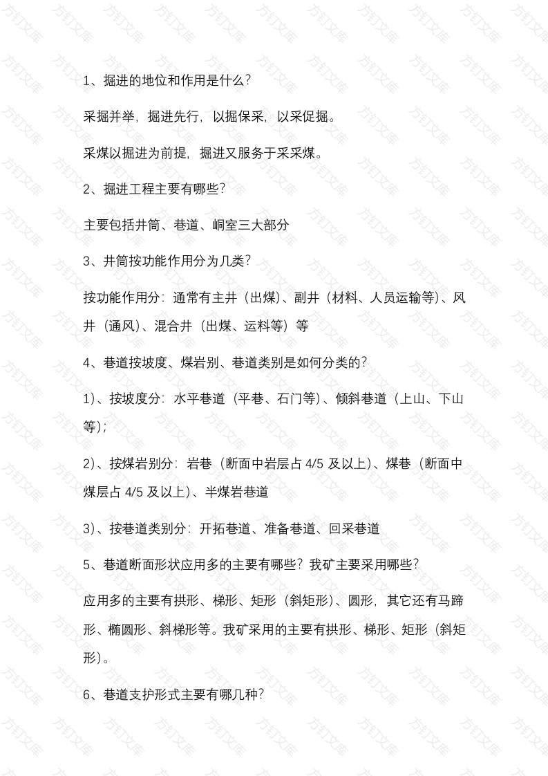 掘进的地位和作用是什么?万方采掘并举,掘进先行,以掘保采,以采促掘。采煤以掘进为前提,掘进又服务于采采煤2、掘进工程主要有哪些?主要包括井筒、巷道、峒室三大部分3、井筒按功能作用分为几类?按功能作用分:通常有主井(出煤)、副井(材料、人员运输等)、风井(通风)、混合井(出煤、运料等)等4、巷道按坡度、煤岩别、巷道类别是如何分类的?1)、按坡度分:水平巷道(平巷、石门等)、倾斜巷道(上山、下山等)2)、按煤岩别分:岩巷(断面中岩层占4/5及以上)、煤巷(断面中煤层占4/5及以上)、半煤岩巷道3)、按巷道类别分:开拓巷道、准备巷道、回采巷道5、巷道断面形状应用多的主要有哪些?我矿主要采用哪些:应用多的主要有拱形、梯形、矩形(斜矩形)、圆形,其它还有马蹄形、椭圆形、斜梯形等。我矿采用的主要有拱形、梯形、矩形(斜矩形)。巷道支护形式主要有哪几种?万支护主要有锚杆支护、喷浆(喷射混凝土)支护砌碹支护棚式支架支护联合支护:主要有锚喷支护、架棚喷支护、锚架支护7、锚喷支护的主要优点是什么?能充分发挥围岩自身的作用和承载能力,使围岩和支护体形成一个整体的结构,共同承担围岩的压力和变形,是一种主动的支护方式,它成本较低,便于实现平行交叉作业,有利于组织快速施工。应用范围较广,是值得推广的主要支护形式。8、我矿现采用的树脂锚固钢筋锚杆的组成及作用树脂锚固钢筋锚杆由树脂胶囊、杆体、托板和螺母等组成。锚杆杆体用于承受张拉作用。托板的作用是将围岩压力转化为对锚杆的拉力;螺母的作用是产生预紧力,预防围岩松动离层。树脂胶囊的作用是将杆体与围岩很好的粘结。9、锚杆的快速安装工艺是什么?锚杆快速安装工艺:锚索机将锚杆、快速锚固剂搅拌到位后(锚固剂搅拌时间20~30s),锚索机停止搅拌但不撤下,等待1分钟后,即直接将锚杆螺母拧紧,完成锚杆的安装工作。10、什么是锚杆的“三径"匹配?锚杆的“三径"匹配:指锚杆孔直径、锚固剂直径、锚杆直径之间的尺寸配合关系。一般要求:钻孔直径大于锚杆直径4~6mm(以6mmV最好),锚固剂直径大于锚杆直径2~4mm。11、锚杆施工对螺母有什么要求?螺母必须拧紧,扭矩满足要求,以确保锚杆的预紧力;现我矿要求锚杆螺母的扭矩为100N.m。12、喷射混凝土的配比要求?水泥:集料(即砂子和石子)=1:4~1:4.5,砂子在集料中占45%~55%;即通常水泥:砂子:石子=1:2:2左右;水灰比为0.4~0.45。13、喷射混凝土施工的养护要求?加强养护:混凝土终凝h后即应养护,并不少于7天,每小班至少次。14、金属支架按材质分类及材质代号的意义?按材质分:主要有矿用工字钢金属支架、矿用U型钢金属支架工字钢型号:用工字钢高度的厘米数表示:如12号工字钢即高度为12cm。U型钢型号:用每米重量(公斤)表示,如U29即表示该U型钢为29kg/m。15、U型钢拱形可缩性支架的优点及组成和应用优点:结构较简单、承载能力较大、可缩性能较好支架由顶梁、柱腿、连接件、架间拉杆、背板材料等组成。文
