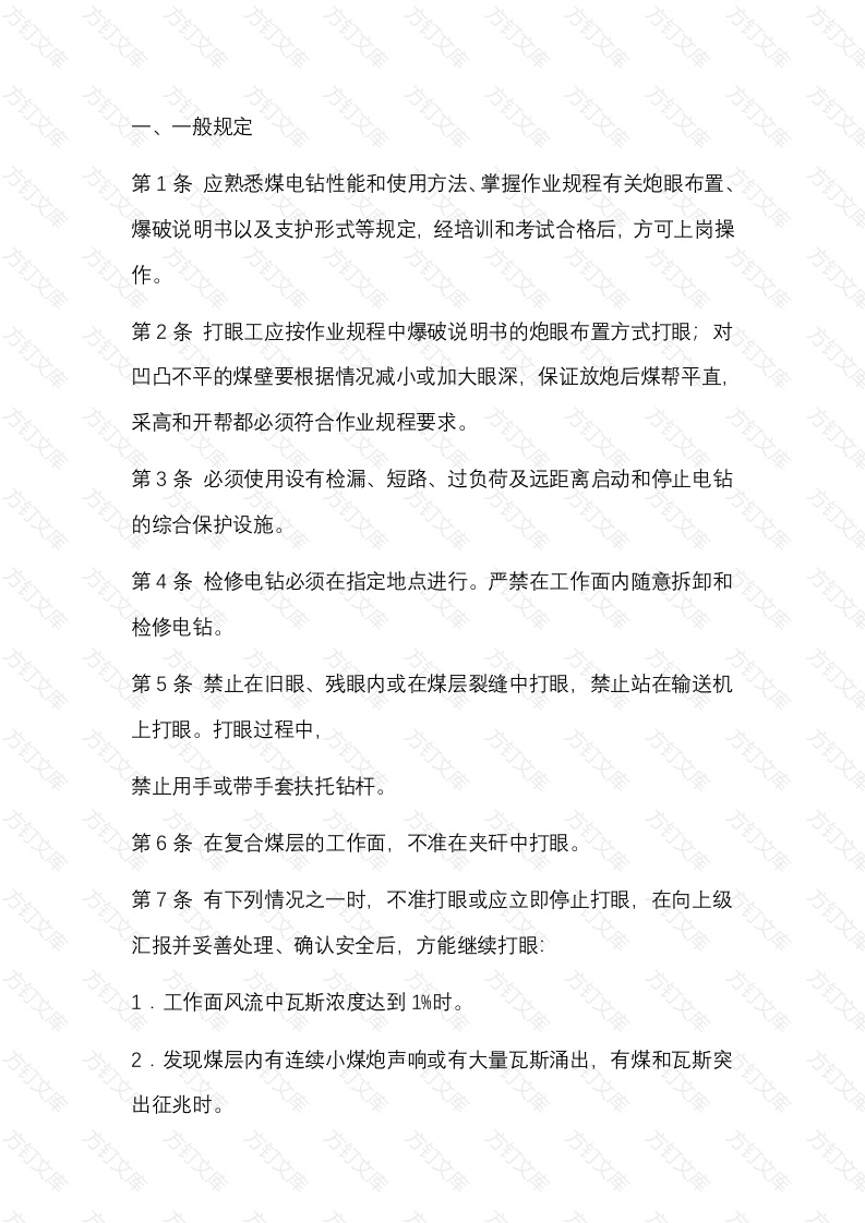 般规定第1条应熟悉煤电钻性能和使用方法、掌握作业规程有关炮眼布置爆破说明书以及支护形式等规定,经培训和考试合格后,方可上岗操第2条打眼工应按作业规程中爆破说明书的炮眼布置方式打眼;对凹凸不平的煤壁要根据情况减小或加大眼深,保证放炮后煤帮平直采高和开帮都必须符合作业规程要求。第3条必须使用设有检漏、短路、过负荷及远距离启动和停止电钻的综合保护设施。第4条检修电钻必须在指定地点进行。严禁在工作面内随意拆卸和检修电钻。第5条禁止在旧眼、残眼内或在煤层裂缝中打眼,禁止站在输送机上打眼。打眼过程中文禁止用手或带手套扶托钻杆。方第6条在复合煤层的工作面,不准在夹矸中打眼。第7条有下列情况之一时,不准打眼或应立即停止打眼,在向上级汇报并妥善处理、确认安全后,方能继续打眼工作面风流中瓦斯浓度达到1%时。发现煤层内有连续小煤炮声响或有大量瓦斯涌出,有煤和瓦斯突出征兆时。发现煤层变潮、煤质松软,有挂红、挂汗、出现雾气、水叫、顶板淋水加大、空气变冷等透水预兆时。4.打眼中突遇压力水从钻孔流出时,应立即停钻,严禁抽动钻杆。5.工作面局部顶板来压、片帮严重6.悬顶距离、控顶距离或端面距超过作业规程的规定。方订7.支护不齐全、不牢固或倒棚未扶处。8.在自溜运输工作面,打眼处的上方正在出煤时9.抵抗线小于0.5(岩石0.3)米万10.钻孔突然与老空区或旧巷相透时。对上述1、2、3、4项,如情况紧急,还必须立即发出警报,撤出所有受威胁地点的人员。第8条打眼工应和放炮员紧密配合,共同搞好安全生产,确保爆破良好。第9条打眼工作顺序准备(领取工具→携带工具→敷设电缆)→检查→处理一→打眼操作(试转开眼一钻进→排煤粉)→工作结束。方准备、检查与处理万万万万万第10条领取电钻等工具时要认真检查,并应符合下列规定电钻的机体无裂纹破损,螺丝、螺帽、销子等齐全牢固。2.电钻开关灵敏可靠。钻杆要直,不弯曲变形,钻头锋利。方4.试转一下,其转动方向正确,声音正常。万5.电缆无“鸡爪子”无“羊尾巴”,无明接头,不漏电6.带齐钻杆、钻头、铅丝(铁线)、护套、长撬棍等必需的工具。第11条电钻、钻杆、电缆的携带:1·将电缆绕成圆圈,其一端固定在电钻上并系结好,要手提电钻手把或肩背电钻和电缆。不准安上钻杆挑着电钻行走,不准用电缆拖拉电钻,更不准带电拖拉电钻,严禁强拉硬拽。2.搬运、长距离移动煤电钻时,必须卸下钻杆。方3急倾斜工作面要用结实绳子绑套运送煤电钻。严禁用刮板输送机运送电钻、钻杆、电缆。方订第12条打眼电缆的敷设:1.巷道内的电缆都必须吊挂整齐牢固,不许随意扔放,散乱堆放。电缆横跨输送机机头、机尾、溜槽和溜煤道时,应在距其0.5米文以上悬挂牢固,以免煤、矸、材料等挤碰。