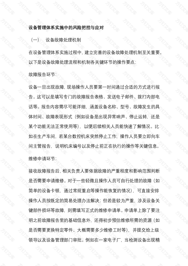 设备管理体系实施中的风险把控与应对万设备故障处理机制在设备管理体系实施过程中,建立完善的设备故障处理机制至关重要。以下是设备故障处理流程和机制各关键环节的操作要点故障报告环节设备一旦出现故障,现场操作人员要第一时间通过合适的方式进行报告。这可以是填写专门的故障报告表格、发送电子邮件、拨打内部电话等。报告内容需尽可能详细,涵盖设备名称、型号、故障发生的具体时间、故障表现形式(例如设备是出现异常响声、停止运转,还是某个功能无法正常使用等),以便后续相关人员能快速了解情况。比如在生产车间,若某台数控机床突然停止工作,操作人员要立即向车间主管报告,说明机床编号以及停止前正在执行的操作等关键信息。维修申请环节:接收故障报告后,相关负责人要依据故障的严重程度和影响范围判断是否需要申请维修。对于一些轻微且操作人员可自行处理的故障(如简单的设备卡顿,通过常规重启等操作能恢复的情况),可直接安排操作人员按既定的简易处理办法解决;但若是较为严重,涉及设备关键部件损坏等故障,则需填写正式的维修申请单。申请单上除了要注明之前故障报告里的基础信息外,还得初步预估维修所需的资源(如是否需要更换特定零件、大概需要多少维修工时等),并提交给上级领导以及设备管理部门审批。例如在一家电子厂,当检测设备出现精