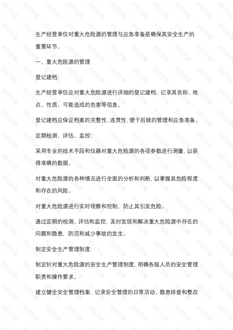 生产经营单位对重大危险源的管理与应急准备是确保其安全生产的重要环节。重大危险源的管理登记建档:生产经营单位应对重大危险源进行详细的登记建档,记录其名称、地点、性质、可能造成的危害等信息。登记建档应保证档案的完整性、连贯性,便于后续的管理和应急准备。定期检测、评估、监控:采用专业的技术手段和仪器对重大危险源的各项参数进行测量,以获得准确的数据。对重大危险源的各种情况进行全面的分析和判断,以掌握其危险程度和存在的风险。对重大危险源进行实时观察和控制,防止其引发危险。通过定期的检测、评估和监控,及时发现和解决重大危险源中存在的问题和隐患,防范和减少事故的发生。制定安全生产管理制度:制定针对重大危险源的安全生产管理制度,明确各级人员的安全管理职责和操作要求。建立健全安全管理档案,记录安全管理的日常活动、隐患排查和整改情况等万万加强安全培训定期开展员工安全生产知识培训、应急急救培训等,提高员工的安全意识和应急处置能力。确保员工能够正确应对各种突发情况,降低事故发生的可能性。加强与相关单位的沟通和协调:与相关单位建立有效的沟通和协调机制,共同维护重大危险源的安全稳定运行。分享安全管理经验和信息,共同提高安全管理水平。应急准备万文制定应急预案根据重大危险源的特点和可能引发的事故类型,制定详细的应急预案。应急预案应明确应急响应流程、救援措施、人员分工和时间节点等关键信息。定期组织应急演练:通过模拟事故场景,定期组织应急演练,检验应急预案的有效性和员工的应急反应能力。文万万万根据演练结果,及时修订和完善应急预案,确保其可行性和实效性。建立应急响应团队:组建专业的应急响应团队,负责在紧急情况下进行救援和处理。应急响应团队应定期进行培训和演练,提高其应急处理能力。储备应急物资和设备根据应急预案的需求,储备足够的应急物资和设备,如灭火器、消防水带、防毒面具等。定期检查应急物资和设备的有效性,确保其处于完好可用状态综上所述,生产经营单位对重大危险源的管理与应急准备需要建立健全的管理制度和应急预案,加强安全培训和应急演练,储备必要的应急物资和设备,以确保在紧急情况下能够迅速有效地进行应急处置,保障人民群众的生命财产安全。方方万万