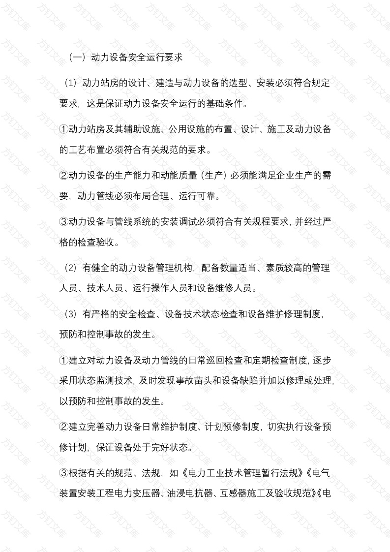 动力设备安全运行要求(1)动力站房的设计、建造与动力设备的选型、安装必须符合规定要求,这是保证动力设备安全运行的基础条件。①动力站房及其辅助设施、公用设施的布置、设计、施工及动力设备的工艺布置必须符合有关规范的要求。②动力设备的生产能力和动能质量(生产)必须能满足企业生产的需要,动力管线必须布局合理、运行可靠。③动力设备与管线系统的安装调试必须符合有关规程要求,并经过严格的检查验收。(2)有健全的动力设备管理机构,1配备数量适当、素质较高的管理人员、技术人员、运行操作人员和设备维修人员。(3)有严格的安全检查、设备技术状态检查和设备维护修理制度预防和控制事故的发生。①建立对动力设备及动力管线的日常巡回检查和定期检查制度,逐步采用状态监测技术,及时发现事故苗头和设备缺陷并加以修理或处理以预防和控制事故的发生。②建立完善动力设备日常维护制度、计划预修制度,切实执行设备预修计划,保证设备处于完好状态。③根据有关的规范、法规,如《电力工业技术管理暂行法规》《电气装置安装工程电力变压器、油浸电抗器、互感器施工及验收规范》《电业安全工作规程》《工业企业电气装置技术管理规程》《锅炉及压力容器安全监察规程》《压力容器使用登记管理规则》《蒸汽锅炉安全监察规程》《热水锅炉安全技术监察规程》《工业锅炉房设计规范》《氧气站设计规范》《压缩空气站设计规范》《气瓶安全监察规程》等,制定各种安全检查、质量检验、环境监察等技术标谁,作为对动力设备及动力管线进行安全技术检查和质量检验的依据。④建立完善的技术资料的收集、整理、保管、借阅制度。技术资料包括:各动力站房的技术设计及施工设计图和平面布置图;动力设备使用说明书和维修备件图册:全厂、分厂、区、车间动力管线图、动力系统竣工图、动能生产工艺流程图和继电保护原理接线图等,以供对动力设备及管线进行安全技术检查和维护修理时使用。⑤配备足够的、先进适用的检测试验器具和仪器进行安全检查、质量检查、状态监测、环境监控等(4)有严格的安全操作规程和完善的岗位责任制度。①通过建立各种安全工作规程,保证动力设备的安全运行。如在操作维修动力设备和进行安全试验时应遵守的工作规程及应采取的技术措施和组织措施;发生事故时的紧急处置方法;某些动力设备工作时应采取的特殊安全措施等。②建立运行操作规程,包括动力设备正常操作的方法和程序;允许使用的运行参数范围;开车(点火)、停车(熄火)的操作程序和注意事项;运行操作中应重点检查的项目和要求;可能出现的异常现象及其判断方法和对策等。③进行预防性试验的项目、期限与技术标准④各种运行管理制度,如岗位责任制、交接班制度、巡回检查制度、安全防火制度等,并做好各种记录。二)动力设备运行调度体系动力设备运行管理比较严密复杂。企业在外部要接受主管业务部门的技术监督和调度,在企业内部为使各动力设备相互协调,建立正常的运行秩序,也必须相应建立运行调度体系。上与外部供电、供热、供水、供燃气等主管业务部门的调度单位衔接,下管到企业各个动力站,各种动力传输管网,直到重点耗能设备。具体的调度方式可根据企业实际制定。例如:涉及采取各种安全措施的操作,应采用调度工作单的方式;属于停送动力的调度,允许口头或电话调度;在紧急情况下,允许口头调度及现场调度,先操作后补记录:在特别紧急的情况下,现场运行人员可以先操作,然后向调度室报告等。调度室和运行管理人员所在现场,应设置模拟板,明显标示系统运行状况,使系统运行状况一目了然,防止调度管理出现差错。三)动力设备的日常管理动力设备日常管理和维护应达到1)建立运行制度、操作规程、安全规程、岗位责任制等。2)设备运行状态参数符合设备出厂、生产需要、运行安全可靠、