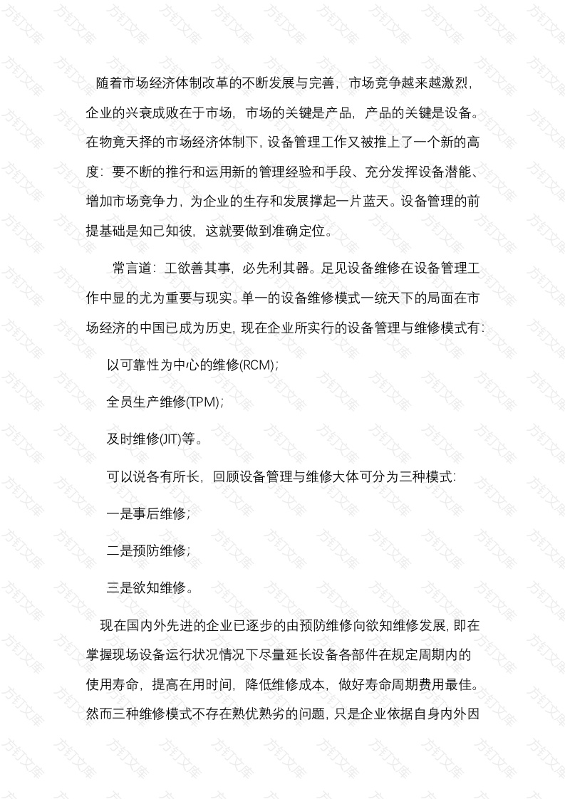随着市场经济体制改革的不断发展与完善,市场竞争越来越激烈企业的兴衰成败在于市场,市场的关键是产品,产品的关键是设备。在物竟天择的市场经济体制下,设备管理工作又被推上了一个新的高度:要不断的推行和运用新的管理经验和手段、充分发挥设备潜能增加市场竞争力,为企业的生存和发展撑起一片蓝天。设备管理的前提基础是知己知彼,这就要做到准确定位。常言道:工欲善其事,必先利其器。足见设备维修在设备管理工作中显的尤为重要与现实。单一的设备维修模式一统天下的局面在市场经济的中国已成为历史,现在企业所实行的设备管理与维修模式有:以可靠性为中心的维修(RCM)全员生产维修(TPM);及时维修T等。可以说各有所长,回顾设备管理与维修大体可分为三种模式:是事后维修;是预防维修,三是欲知维修。文现在国内外先进的企业已逐步的由预防维修向欲知维修发展,即在掌握现场设备运行状况情况下尽量延长设备各部件在规定周期内的使用寿命,提高在用时间,降低维修成本,做好寿命周期费用最佳。然而三种维修模式不存在熟优熟劣的问题,只是企业依据自身内外因素及维修费用加以考虑,事后维修是最原始的维修模式,他的维修费用最低,在一些简易或价值低的设备中采用也是比较经济有效的。事后维修在很多企业中还占有很大比重,并且在很长一段时间内也不会消失,因为以预防为中心的维修还不能达到万无一失。然而任何一种维修模式都有其适应性,这就要各企业立足现实,就是基于企业设备和企业自身因素及发展环境的不同,客观实际的做到维修定位。设备定位根据企业生产的性质和自身要求对设备在生产中的重要程度定位分为三种设备重点设备。方订b重要设备。般设备。方方划分重点设备的条件可以考虑以下几点:A、对生产的影响。B、对产品质量的影响方C、对维修费用的影响。D、对安全及环境的影响等。划分重点设备的条件各企业根据自身的实际情况和工作需要而决定,划分重点设备后也不是一成不变的,随着生产计划的变更,或设备技术的改造及更新等,也会有相应的变动。重点设备一般占设备总数的10%左右。重点设备的划分是设备准确定位的体现,设备类别的划分可以使企业对不同的设备确定不同的维修方法,重点设备一般实行预防维修般设备实行事后维修,既可以提高设备维修的经济性,又有助于解决使用与维修之间的矛盾,增强设备的维修实用性。设备类型的定位是做到知己,是维修模式选择的前提与基础二、故障定位设备各个阶段的的故障率所形成的一条曲线,叫船型曲线,可以把设备故障大体分为三个阶段:1、设备投产初期的故障,叫早期故障,主要是设备的设计、制造磨合等方面的原因造成的,在刚刚大中修过的设备也有这种情况,随着不断的调整、磨合设备逐步走向正常此时的故障易用事后维修解决。2、设备正常运行阶段的故障,是偶发故障,它是由于某些零件中存在一时难以发现的缺陷所引起的故障,在此期间故障基本上很少的3、设备长期运转日趋老化,零件磨损加剧,是故障频繁,这个时期如果不及时地进行预防或欲知维修,设备很快就会报废。故障的准确定位是做到知彼。定位设备管理与维修模式要想在具体中的到应用还要强管理就要在设备管理工作中全面推进设备点检法。通过点检能早期发现设备隐患及时采取有效措施,避免突发故障,保障