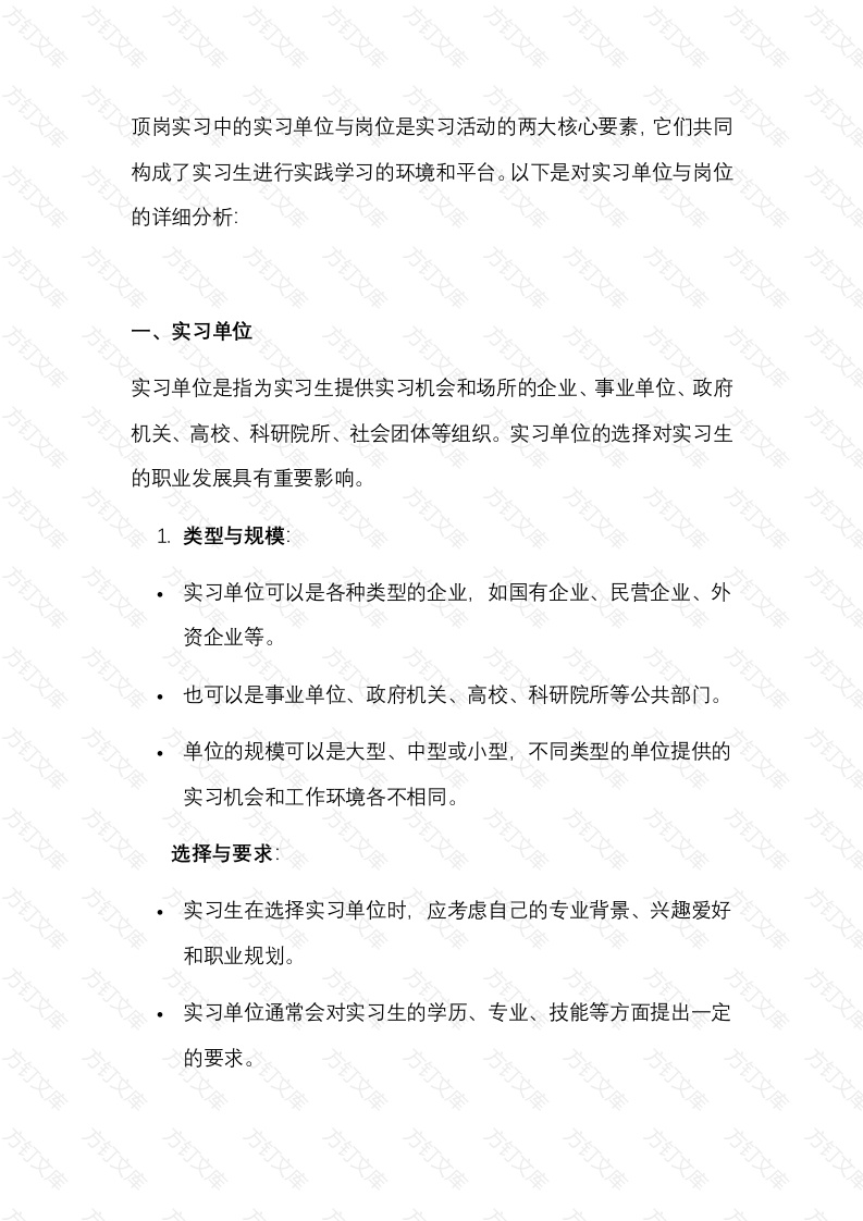 顶岗实习中的实习单位与岗位是实习活动的两大核心要素,它们共同构成了实习生进行实践学习的环境和平台。以下是对实习单位与岗位的详细分析实习单位实习单位是指为实习生提供实习机会和场所的企业、事业单位、政府机关、高校、科研院所、社会团体等组织。实习单位的选择对实习生的职业发展具有重要影响。1.类型与规模:实习单位可以是各种类型的企业,如国有企业、民营企业、外资企业等。也可以是事业单位、政府机关、高校、科研院所等公共部门。单位的规模可以是大型、中型或小型,不同类型的单位提供的实习机会和工作环境各不相同。选择与要求:实习生在选择实习单位时,应考虑自己的专业背景、兴趣爱好和职业规划。实习单位通常会对实习生的学历、专业、技能等方面提出一定的要求。万万文作用与意义实习单位为实习生提供了一个将理论知识应用于实践的平台。实习生在实习单位中可以接触到真实的工作环境,了解行业现状和发展趋势。实习单位还可以为实习生提供职业发展机会和就业指导。实习岗位实习岗位是指实习生在实习单位中承担的具体工作职责和任务。实习岗位的设置通常由实习单位根据自身业务需求和工作内容来决定。1.岗位类型实习岗位可以是技术类、管理类、市场类、财务类等各种类型。不同类型的岗位对实习生的专业背景和技能要求各不相同。岗位职责实习岗位通常包括一些基础性的工作任务,如数据录入、文档整理、市场调研等。也可能包括一些具有挑战性的任务如项目策划、产品设计、客户管理等。岗位匹配度方万万万实习岗位应与实习生的专业背景相匹配,以确保实习生能够学以致用。实习单位在安排实习岗位时,会考虑实习生的能力和兴趣,以最大限度地发挥其实习效果。实习收获实习生在实习岗位上可以学习到与工作相关的专业技能和操作方法。还可以了解企业的运营模式和业务流程,提高自己的职业素养和沟通能力。实习岗位还可以为实习生提供职业发展机会和就业指导帮助其更好地规划未来职业生涯。实习单位与岗位的关系实习单位与实习岗位是相互依存、密不可分的。实习单位为实习生提供了实习场所和实践机会,而实习岗位则是实习生在实习单位中承担的具体工作职责和任务。二者共同构成了实习生进行实践学习的环境和平台。在选择实习单位时,实习生应关注单位的发展前景、企业文化和工作环境等方面;在选择实习岗位时,则应考虑自己的专业背景、兴趣爱好和职业规划等方面。通过合理的选择和安排,实习生可以在实习过