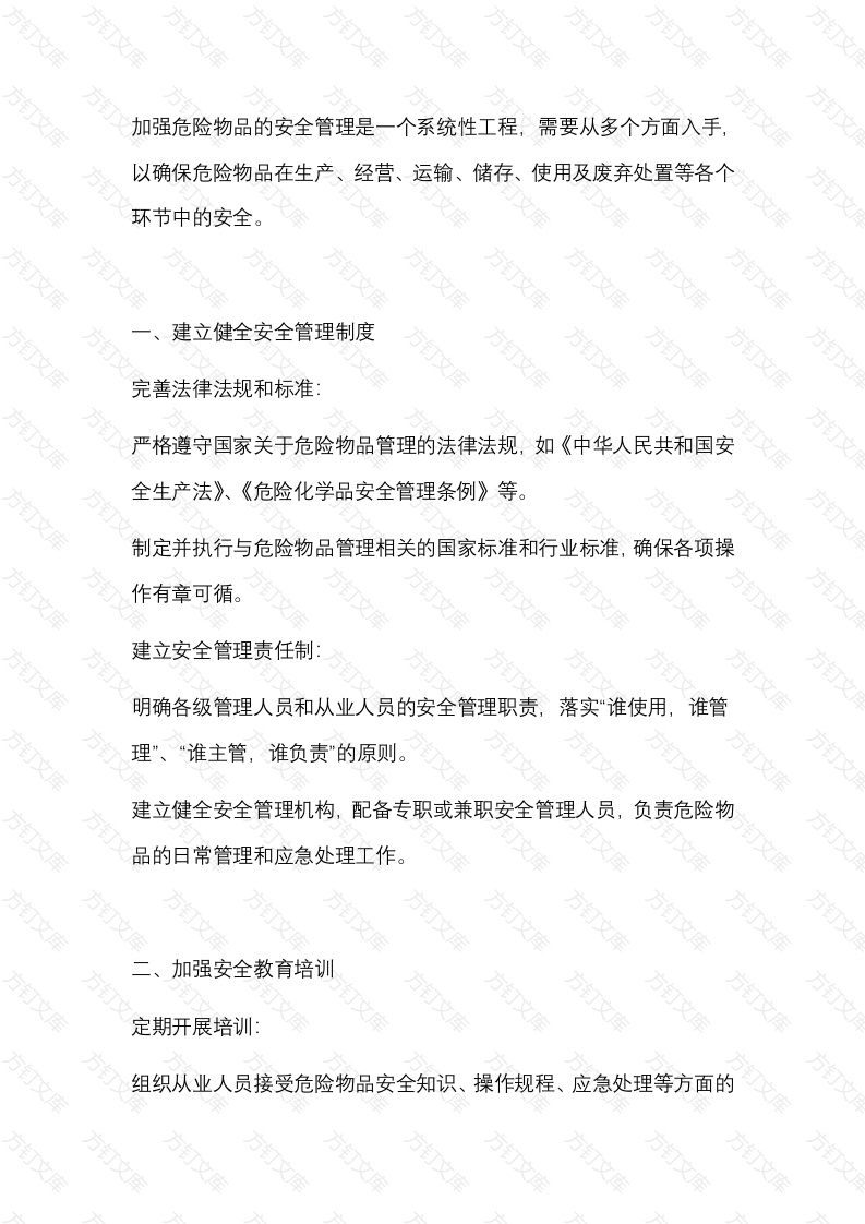 加强危险物品的安全管理是一个系统性工程,需要从多个方面入手以确保危险物品在生产、经营、运输、储存、使用及废弃处置等各个环节中的安全。建立健全安全管理制度完善法律法规和标准严格遵守国家关于危险物品管理的法律法规,如《中华人民共和国安全生产法》、《危险化学品安全管理条例》等。制定并执行与危险物品管理相关的国家标准和行业标准,确保各项操作有章可循。建立安全管理责任制明确各级管理人员和从业人员的安全管理职责,落实“谁使用,谁管理”、“谁主管,谁负责”的原则。建立健全安全管理机构,配备专职或兼职安全管理人员,负责危险物品的日常管理和应急处理工作。加强安全教育培训定期开展培训:组织从业人员接受危险物品安全知识、操作规程、应急处理等方面的万文培训。通过案例分析、模拟演练等方式,提高员工的安全意识和操作技能。提升员工素质鼓励员工参加相关的职业资格认证考试,提升专业素质和安全管理能力。定期开展安全知识竞赛、技能比武等活动,营造良好的学习氛围。方三、严格采购审批与储存管理严格采购审批建立严格的危险物品采购审批制度,未经批准不得擅自购买剧毒、易燃易爆等危险物品。采购时应选择具有合法资质的生产商和供应商,确保产品质量和安全性。规范储存管理危险物品应存放在符合安全条件的专用仓库或储存场所,设置明显的安全警示标志。仓库或储存场所应配备相应的安全设施,如防火、防爆、防毒、防雷击等。定期对储存场所进行安全检查,及时发现并整改安全隐患。万文四、加强运输与使用管理规范运输管理危险物品的运输应遵守国家相关法律法规和标准,选择具有合法资质的运输企业和车辆。运输过程中应采取有效的安全防护措施,如使用专用运输工具、配备押运人员等。定期对运输车辆和人员进行安全检查和维护,确保运输安全。规范使用管理:危险物品的使用应严格按照操作规程进行,严禁违章操作。使用过程中应配备相应的安全防护设施和应急处理设备,确保人员安全。定期对使用场所进行安全检查,及时发现并整改安全隐患。五、完善应急预案与演练制定应急预案:根据危险物品的种类、数量和可能发生的危险情况,制定详细的应急预案。万方