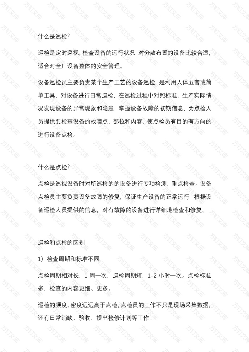 什么是巡检?巡检是定时巡视,检查设备的运行状况,对分散布置的设备比较合适适合对全厂设备整体的安全管理。设备巡检员主要负责某个生产工艺的设备巡检,是利用人体五官或简单工具,对设备进行日常巡检,在巡检过程中对照标准、生产实际情况发现设备的异常现象和隐患,掌握设备故障的初期信息,为点检人员提供要检查设备的故障点、部位和内容,使点检员有目的有方向的进行设备点检。什么是点检?点检是巡视设备时对所巡检的的设备进行专项检测,重点检查。设备点检员主要负责设备故障的修复,保证生产设备的正常运行,根据设备巡检人员提供的信息,对有故障的设备进行详细地检查和修复。文巡检和点检的区别1)检查周期和标准不同点检周期相对长,1周一次,巡检周期短1-2小时一次。点检标准多,检查的内容更细、更多。巡检的频度、密度远远高于点检,点检员的工作不只是现场采集数据还有日常消缺、验收、提出检修计划等工作。2技术要求不同巡检人员通常是普通工人,掌握一定的巡检知识即可。点检员必须是经过特殊训练的专门人员,对技术要求相对较高。检查侧重点不同巡检侧重于面的管理,对企业生产设备进行全面、整体的安全管理。点检侧重点的管理,通过巡检提供相应的信息,针对某些设备进行进行专项检测,重点检查。A工作职责不同(1)设备巡检员是利用人的五官或简单的仪器工具,对设备进行日常巡查,在巡检过程中对照标准发现设备的异常现象和隐患。(2)点检员是设备技术状态的管理员,是设备运行,维护,检修技术管理的中坚力量,对设备的技术状态负责。负责对所辖区域设备技术状管理,按点巡检要求,设备技术维护要求定期按时进行设备的现场巡视并作好记录;负责设备的检修计划,备品备件计划,设备技术维护计划的制定和现场故障处理;负责设备检修计划的组织实施,质量监督验收等负责与维修工段(公司)联络,开出检修委托工作量签证;负责设备故障的检测分析诊断,提出处理意见和检修,改进方案;文负责对设备的现场管理,指导,检查,督促生产岗位人员搞好设备操作和日常维护负责设备运行档案的填写与管理负责本区域岗位人员的设备知识培训。巡检和点检的联系检查方式类同方巡检和点检都是通过预定的计划和任务,根据五定原则侧(定点、定方法、定标准、定周期、定人),以设备安全运行状态为目的的检查。检查目标相同巡检和点检的目标都是使设备在可靠性、维护性、经济性上达到协调优化管理。合理延长设备检修周期,缩短检修工期,降低检修成本提高检修质量,并使日常检修和定期检修负荷达到最均衡状态。3)巡检是点检的基础巡检可为点检提供相应的信息依据,使点检更有方向、有针对性的对设备进行检查,不至于出现过度检查的情况,降低工作效率。万点检的“五层防护体系第一层:运行人员的巡检。万万万
