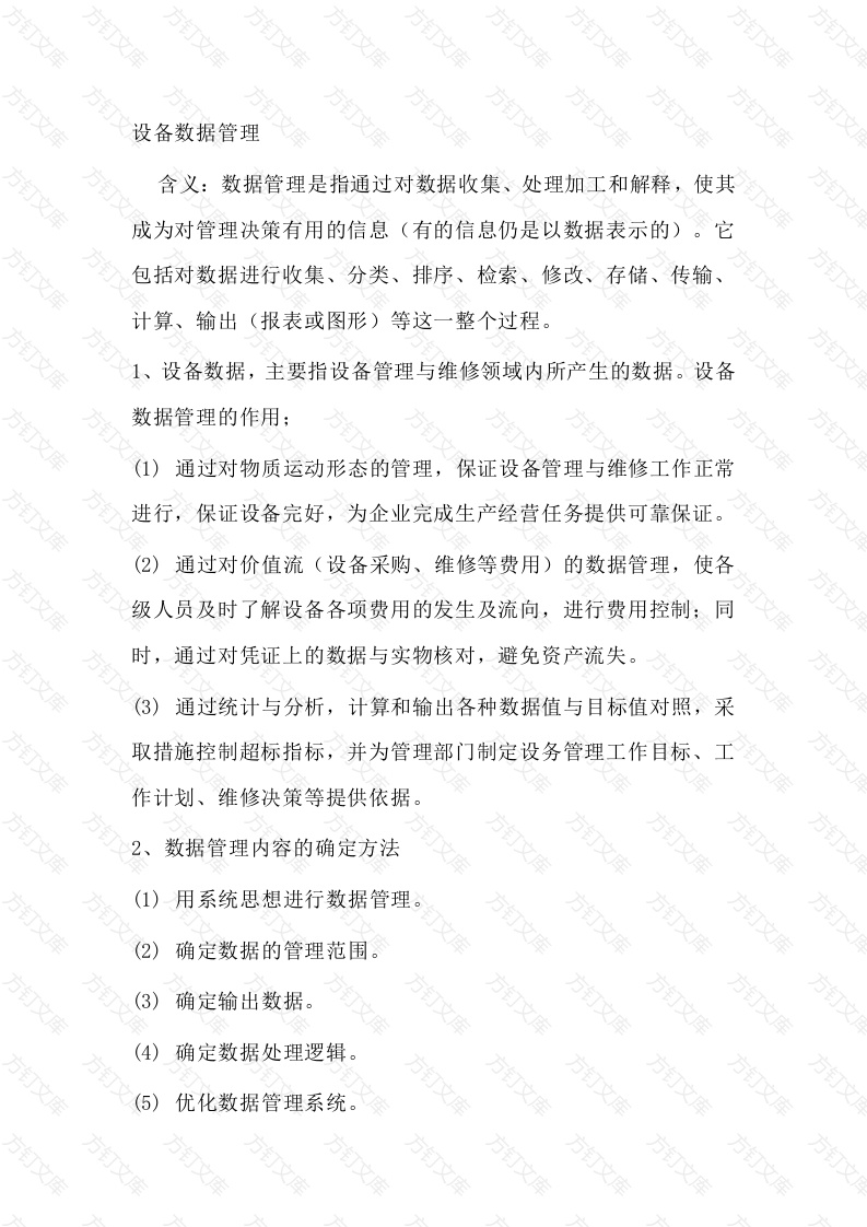 设备数据管理含义:数据管理是指通过对数据收集、处理加工和解释,使其成为对管理决策有用的信息(有的信息仍是以数据表示的)。它包括对数据进行收集、分类、排序、检索、修改、存储、传输、计算、输出(报表或图形)等这一整个过程。1、设备数据,主要指设备管理与维修领域内所产生的数据。设备数据管理的作用;(1)通过对物质运动形态的管理,保证设备管理与维修工作正常进行,保证设备完好,为企业完成生产经营任务提供可靠保证。(2)通过对价值流(设备采购、维修等费用)的数据管理,使各级人员及时了解设备各项费用的发生及流向,进行费用控制:同时,通过对凭证上的数据与实物核对,避免资产流失。3)通过统计与分析,计算和输出各种数据值与目标值对照,采取措施控制超标指标,并为管理部门制定设务管理工作目标、作计划、维修决策等提供依据。2、数据管理内容的确定方法(1)用系统思想进行数据管理。确定数据的管理范围。3)确定输出数据。方确定数据处理逻辑5优化数据管理系统。万万注重数据的收集管理。方3、数据管理程序(1)数据收集2)数据存储。方方(3)数据传输(4)数据处理。方订5)数据输出。数据汇总账卡、图表、登记册的建立数据汇总是指对设备管理环节发生的数据进行分类累加,求其总数的计算。(1)设备台账和设备卡片;设备验收移交生产后,企业设备管理部门和财务部均应建立单台设备的固定资产台账和卡片。数据主要来源于设备订货合同,使用说明书和安装移交验收单等。设备台账:分主要生产设备和非主要生产设备。般设备台账分三种:①设备序号账。②设备分类账。方③分车间(使用单位)账。方方方万万设备卡片:设备资产管理除应建立完善的台账外,还需要按使用单位(车间、科室等)的顺序建卡片册。随着设备的调动、转让和报废,卡片位置可在卡片册内调整,转出或撤出注销。为了便于核对,保证账、物相符,设备卡片应一式两套(设备管理和使用部门各执一套)2)设备分类与资产编号在填写设备台账和卡片时,均要涉及设备资产编号,而资产编号又与设备分类有关,必须实行统一的划分与编号。另外,为了便于设备管理和用计算机进行数据处理,企业应对设备进行科学编码,使其既有识别,又利于用计算机进行统计汇总①设备分类(用于资产编号前一段)②设备资产编号资产设备的编号由三段数字组成,每两段之间为横线。段表示设备类别:二段表示设备使用单位(包括分厂、车间、科室)代号;三段表示同类设备的顺序号。设备运行管理数据汇总方①主要生产设备润滑卡片。②不完好设备登记册。设备事故登记册。方设备备件台账7设备资产变动数据汇总万万