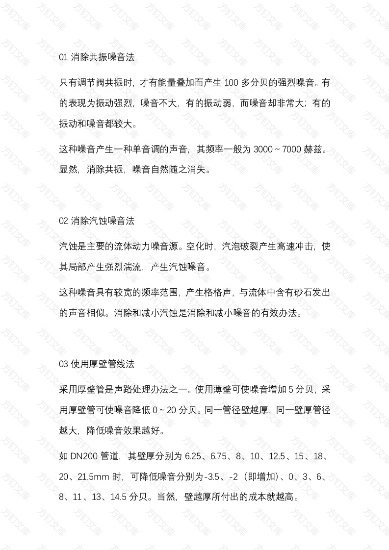万文01消除共振噪音法只有调节阀共振时,才有能量叠加而产生100多分贝的强烈噪音。有的表现为振动强烈,噪音不大,有的振动弱,而噪音却非常大;有的振动和噪音都较大。这种噪音产生一种单音调的声音,其频率一般为3000~7000赫兹。显然,消除共振,噪音自然随之消失。02消除汽蚀噪音法汽蚀是主要的流体动力噪音源。空化时,汽泡破裂产生高速冲击,其局部产生强烈湍流,产生汽蚀噪音。这种噪音具有较宽的频率范围,产生格格声,与流体中含有砂石发出的声音相似。消除和减小汽蚀是消除和减小噪音的有效办法。03使用厚壁管线法采用厚壁管是声路处理办法之一。使用薄壁可使噪音增加5分贝,采用厚壁管可使噪音降低0~20分贝。同一管径壁越厚,同一壁厚管径越大,降低噪音效果越好。如DN200管道,其壁厚分别为6.25、6.75、8、10、12.5、15、1820、21.5mm时,可降低噪音分别为-3.5、-2(即增加)、0、3、6、8、11、13、14.5分贝。当然,壁越厚所付出的成本就越高。文文万04采用吸音材料法这也是一种较常见、最有效的声路处理办法。可用吸音材料包住噪音源和阀后管线。必须指出,因噪音会经由流体流动而长距离传播,故吸音材料包到哪里,采用厚壁管至哪里,消除噪音的有效性就终止到哪里这种办法适用于噪音不很高、管线不很长的情况,因为这是一种较费钱的办法。05串联消音器法本法适用于作为空气动力噪音的消音,它能够有效地消除流体内部的噪音和抑制传送到固体边界层的噪音级。对质量流量高或阀前后压降比高的地方,本法最有效而又经济。使用吸收型串联消音器可以大幅度降低噪音。但是,从经济上考虑般限于衰减到约25分贝。06隔音箱法使用隔音箱、房子和建筑物,把噪音源隔离在里面,使外部环境的噪音减小到人们可以接受的范围内。万07串联节流法在调节阀的压力比高(△P/P1≥0.8)的场合,采用串联节流法,就是把总的压降分散在调节阀和阀后的固定节流元件上。如用扩散器、多孔限流板,这是减少噪音办法中最有效的。为了得到最佳的扩散器效率,必须根据每件的安装情况来设计扩散器(实体的形状、尺寸),使阀门产生的噪音级和扩散器产生的噪音级相同。08选用低噪音阀低噪音阀根据流体通过阀芯、阀座的曲折流路(多孔道、多槽道)的逐步减速,以避免在流路里的任意一点产生超音速。有多种形式,多种结构的低噪音阀(有为专门系统设计的)供使用时选用。文当噪音不是很大时,选用低噪音套筒阀,可降低噪音10~20分贝,这是最经济的低噪音阀。方文万方万万