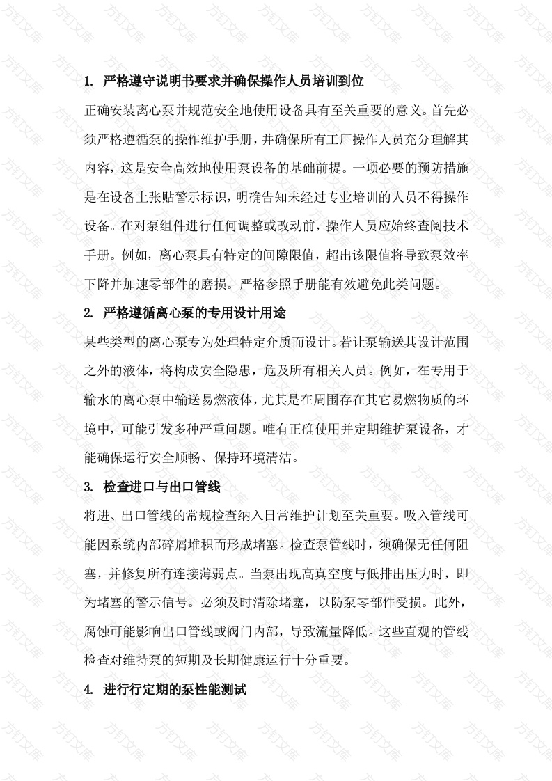 严格遵守说明书要求并确保操作人员培训到位正确安装离心泵并规范安全地使用设备具有至关重要的意义。首先必须严格遵循泵的操作维护手册,并确保所有工厂操作人员充分理解其内容,这是安全高效地使用泵设备的基础前提。一项必要的预防措施是在设备上张贴警示标识,明确告知未经过专业培训的人员不得操作设备。在对泵组件进行任何调整或改动前,操作人员应始终查阅技术手册。例如,离心泵具有特定的间隙限值,超出该限值将导致泵效率下降并加速零部件的磨损。严格参照手册能有效避免此类问题。2.严格遵循离心泵的专用设计用途某些类型的离心泵专为处理特定介质而设计。若让泵输送其设计范围之外的液体,将构成安全隐患,危及所有相关人员。例如,在专用于输水的离心泵中输送易燃液体,尤其是在周围存在其它易燃物质的环境中,可能引发多种严重问题。唯有正确使用并定期维护泵设备,才能确保运行安全顺畅、保持环境清洁。3.检查进口与出口管线将进、出口管线的常规检查纳入日常维护计划至关重要。吸入管线可能因系统内部碎屑堆积而形成堵塞。检查泵管线时,须确保无任何阻塞,并修复所有连接薄弱点。当泵出现高真空度与低排出压力时,即为堵塞的警示信号。必须及时清除堵塞,以防泵零部件受损。此外,腐蚀可能影响出口管线或阀门内部,导致流量降低。这些直观的管线检查对维持泵的短期及长期健康运行十分重要。进行行定期的泵性能测试万泵性能测试有助于判断泵零部件的磨损程度。进行测试时,首先启动泵,待其达到最大流量后,逐步关闭出口阀,记录进出口仪表的读数。若泵工作正常,该读数应与零流量时标注的泵最大性能压力值一致如果未能达到零流量下的最大压力,则可能需要更换零部件或整台泵(具体视设备状况及周边环境而定)5.采取措施防止过热离心泵若不采取适当的措施,可能发生过热现象。过热往往是故障的前兆,不仅会严重损坏泵的零部件,更可能造成操作人员烫伤或其它伤害。在泵运行期间保持进、出口管线畅通,是防止离心泵过热的有效预防措施。若泵确实发生过热,应立即停机并给予充分的冷却时间。冷却过程中请与泵保持一定的距离,以避免烫伤。请注意,即便是拆卸盖板这类简单的操作,也可能导致严重的伤害。6.定期检查泵零部件离心泵在零部件磨损状态下运行会构成安全隐患,甚至引发严重的后果。例如,轴承磨损可能导致轴系不稳,进而引发泵出现过热现象:密封磨损会造成介质泄漏与流量异常。剧烈振动、异常噪音及设备过热均为零部件磨损的常见表现。对耐磨环、叶轮叶片及蜗壳等零部件实施定期维护,可确保泵的安全稳定运行。7.泵组应靠近所输送的液体安装离心泵应尽可能靠近所输送的液体安装。被输送的液体同时对泵起到润滑与冷却作用,可有效防止设备过热。若离心泵处于干运转状态可能在一分钟内即发生故障。这意味着,若液位与泵入口距离较远且因故障导致液体无法被输送,泵发生干运转的几率将大幅增加,进而不可避免地引起过热和泵的损坏。另一项实用的安全建议是:泵与其它设备之间应至少保持三英尺的间距,并牢固地固定于地面,以防止运行中发生位移。8.检查空气泄漏零部件磨损会导致空气泄漏,进而使泵丧失静扬程。定期使用真空计检查有助于确保吸入管路的气密性。若吸入管路密封良好、工作正常,当离心泵停机时,真空计显示的将是液面至测压接头的垂直距离。若吸入管道存在漏气,当泵停机时,进入管道的大气压力将会减弱,导致真空计读数波动,这表明相关零部件需要更换,9.保证良好的通风良好的通风环境有助于离心泵维持正常的工作温度,同时也能防止有害烟雾或气体积聚。通风适宜的泵设备通常也更便于进行检查,有助于及时发现可能引发危险事故的隐患,降低操作人员受伤的风险。10.佩戴防护装备即便已落实各项安全规程,失误与意外仍然可能发生。因此,在工业环境中必须强制要求佩戴个人防护装备(PPE)。护目镜、手套、安全鞋及合身的工作服(避免宽松款式)等安全装备能为操作人员提供有效的保护。确保所有人员在操作泵时均规范佩戴防护装备,可显著降低受伤风险。方万万万方万万