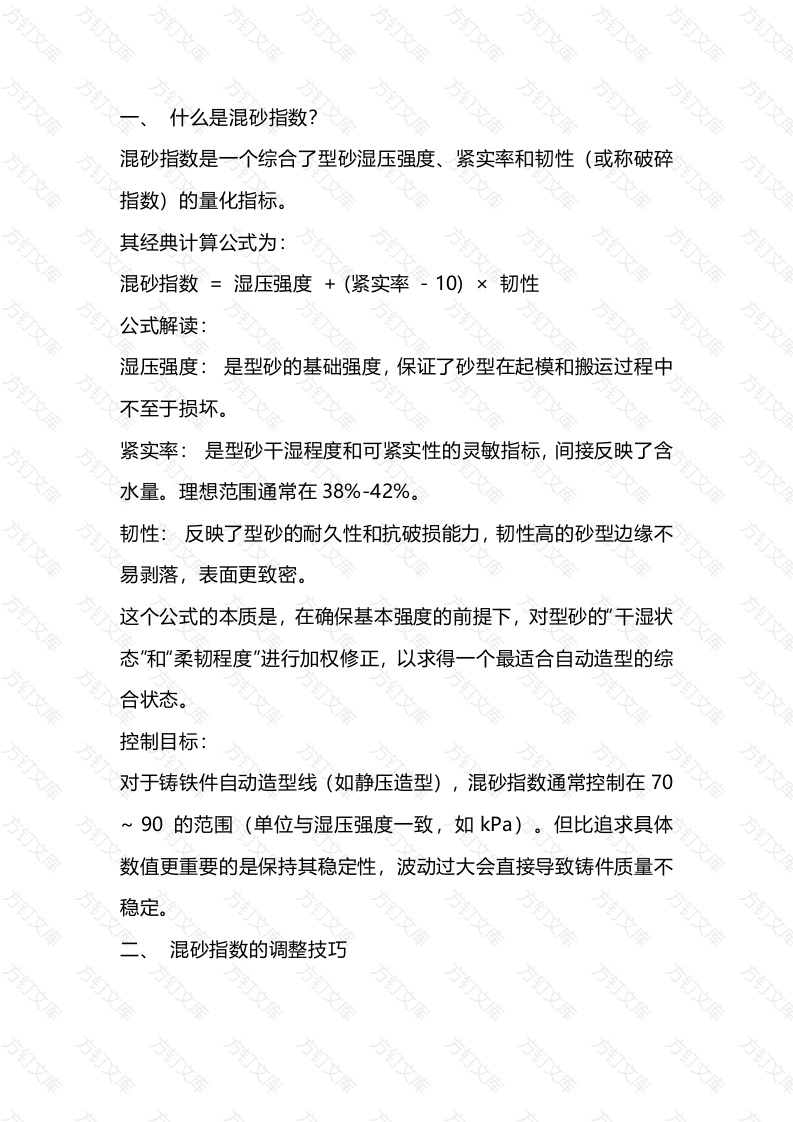 什么是混砂指数?混砂指数是一个综合了型砂湿压强度、紧实率和韧性(或称破碎指数)的量化指标。其经典计算公式为:混砂指数=湿压强度+(紧实率10)韧性公式解读:湿压强度:是型砂的基础强度,保证了砂型在起模和搬运过程中不至于损坏。紧实率:是型砂干湿程度和可紧实性的灵敏指标,间接反映了含水量。理想范围通常在38%-42%。韧性:反映了型砂的耐久性和抗破损能力,韧性高的砂型边缘不易剥落,表面更致密。这个公式的本质是,在确保基本强度的前提下,对型砂的干湿状态“和“柔韧程度”进行加权修正,以求得一个最适合自动造型的综合状态。控制目标:对于铸铁件自动造型线(如静压造型),混砂指数通常控制在7090的范围(单位与湿压强度一致,如kPa)。但比追求具体数值更重要的是保持其稳定性,波动过大会直接导致铸件质量不稳定。混砂指数的调整技巧万万万文万万当混砂指数偏离目标范围时,需要系统地调整原材料和工艺参数。调整的核心在于理解各个因素如何影响湿压强度、紧实率和韧性这三个基础变量。1.调整的基本原则:先调水分,再调组分第一步:锁定紧实率在任何调整开始前,应首先观察紧实率是否在目标范围内(如38%-42%)。如果不在,优先调整加水量,将紧实率调整到位。因为水分是影响型砂工艺性能最敏感的因素,必须先将其稳定下来,后续对粘土、煤粉的调整才有意义。2.混砂指数过低的调整技巧(表现为强度不足、砂型酥脆)文混砂指数过低,通常意味着湿压强度和韧性不足。最有效的措施:增加有效煤粉含量增加煤粉补加量是提升混砂指数最快、最显著的手段。因为煤粉能同时、大幅度地提升型砂的湿压强度和韧性,对计算公式中的两个关键变量都有强力的正向作用,堪称“强心剂”。根本性措施:增加有效粘土含量增加粘土的补加量可以稳定地提高型砂的湿压强度,这是基础。但粘土对韧性的提升效果不如煤粉显著。检查工艺参数:文确保混砂时间充足:混砂时间不足,粘土和煤粉未能充分包裹在砂粒表面并舒展其性能,会导致强度和韧性都上不来。文严格控制旧砂温度:旧砂温度过高(如超过50°C),会瞬间蒸发大量水分并“烫死”粘土,使其失去粘结性,导致强度和韧性急剧下降,这是混砂指数无法提升的常见原因。3.混砂指数过高的调整技巧(表现为型砂发”肉”、流动性差、透气性差)混砂指数过高,说明型砂过于“强壮“和“柔韧”,可能不利于气体排出。最温和且有效的措施:增加新砂补加量增加新砂的加入,可以稀释旧砂系统中过高的有效粘土和有效煤粉浓度,从而同时降低湿压强度和韧性,使混砂指数平稳回落。针对性措施:降低粘土/煤粉补加量在保证不粘模和铸件表面质量的前提下,可以适当微幅降低粘土或煤粉的补加量。但这需要谨慎操作,避免调整过度。三、核心注意事项与理念型砂的性能取决于有效粘土和有效煤粉含量。旧砂中积累的死粘土和灰分会占据份额但不发挥作用。定期检测有效煤粉和有效粘土含量,比只关注补加量更重要。2.稳定性压倒一切个在目标范围内保持稳定的混砂指数,远比一个“完美”但波动的数值更重要。调整时应遵循”微调、观察、再调整”的原则,避免大幅变动