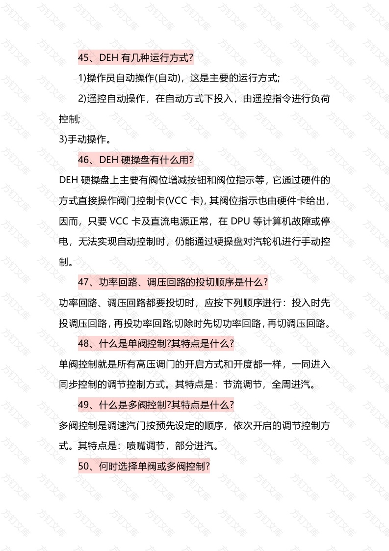 45DEH有几种运行方式?1)操作员自动操作(自动),这是主要的运行方式,2)遥控自动操作,在自动方式下投入,由遥控指令进行负荷控制;3)手动操作46、DEH硬操盘有什么用?DEH硬操盘上主要有阀位增减按钮和阀位指示等,它通过硬件的方式直接操作阀门控制卡CC卡),其阀位指示也由硬件卡给出,因而,只要VCC卡及直流电源正常,在DPU等计算机故障或停电,无法实现自动控制时,仍能通过硬操盘对汽轮机进行手动控制。47、功率回路、调压回路的投切顺序是什么?功率回路、调压回路都要投切时,应按下列顺序进行:投入时先投调压回路,再投功率回路;切除时先切功率回路,再切调压回路。48、什么是单阀控制?其特点是什么?单阀控制就是所有高压调门的开启方式和开度都一样,一同进入同步控制的调节控制方式。其特点是:节流调节,全周进汽。49、什么是多阀控制?其特点是什么?多阀控制是调速汽门按预先设定的顺序,依次开启的调节控制方式。其特点是:喷嘴调节,部分进汽。50、何时选择单阀或多阀控制?万万在机组运行初期,为使汽轮机各部件加热均匀,减少热应力,应采用单阀控制;当机组带部分负荷运行,为改善机组效率,提高经济性,应选择多阀控制。51、单阀、多阀切换时应注意什么?在单、多阀切换正在进行的过程中,不能再进行相反的切换,要等到切换结束后再进行,另外,不要随意进行单、多阀切换,因为这会导致汽轮机各部件经受不必要的热应力变化。52、如何做EH备用油泵联动试验?H备用油泵的联锁应在投入位置,在微机内打开低油压联动电磁阀(20/MPT),试验油路的压力会下降,降至11.2?0.2Mpa时,压力开关63/MP动作,使EH备用泵联动。正常后,关闭20/MPT电磁阀,停止一台H油泵。也可以在就地供油装置端子箱内缓慢开启低油压联动手动阀,进行试验。53、回油管上的弹簧加载逆止阀开启说明什么问题?压力回油管上的弹簧加载逆止阀开启说明压力回油滤网堵塞或回油压力过高,压力回油经过汤簧加载逆止阀直接回到油箱,保证设备的安全。54、操作DEH硬操盘上“高、中压调门增减"按钮时,调门的增减速率是怎样的?在刚按下高、中压调门增减按钮时,阀门的增减速率为20%/min,连续按10秒后,阀门的增减速率为40%/min,连续按20秒后阀门的增减速率为80%/min。55、VCC故障如何处理?当该VCC卡控制的阀门处于全关位置,且DEH输出指令为O时可将机组控制切至手动,注意控制监视各参数及负荷稳定;当该VCC卡控制的阀门不处于全关状态或DEH输出指令不为0时,须联系热工用强制指令使阀门开度逐渐到0后,再更换VCC卡在此过程中投入功率回路,使关小阀门过程中,负荷维持稳定。指令到0,阀门全关后,将机组控制切至手动,注意控制、」监视各数及负荷稳定。56、那些部件出现故障必须停机停泵处理?下列部件故障后必须停机停泵处理,不能在线更换。逆止阀(安全油逆止阀和回油逆止阀)、截止阀、OPC电磁阀、膜阀、空气引导阀。57、哪些情况下DEH系统必须由自动切至手动?1)阀门控制卡VCC卡)故障,在线更换VCC卡;2)一只LVDT故障,在线更换故障的LVDT时;3)DPU(主控站)故障;4)操作员站故障时,机组可暂时切至手动控制;5)在线更换BC站控制板时。58、故障情况下如何快速加减负荷,加减速率是多少?DEH系统在操作站内设有”快速增减负荷”键,在需要快速增减负运行人员点击”快速增减负荷”键,弹出操作块,按增、减