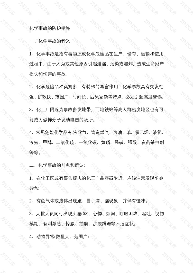 万万化学事故的防护措施化学事故的释义1、化学事故是指有毒物质或化学危险品在生产、储存、运输和使用过程中,由于人为或其他原因引起泄漏、污染或爆炸,造成生命财产损失和伤害的事故。2、化学危险品种类繁多,有特殊的毒害作用,化学事故具有突发性强、扩散快、范围广、时间长、后果复杂等特点,必须引起高度警惕。3、化工厂附近为事故多发地带,而地铁站等高人群密度地区也有可能成为恐怖分子发动袭击的场所。4、常见危险化学品有液化气、管道煤气、汽油、苯、氯乙烯、液氯、液氨、甲醇、二氧化硫、一氧化碳、黄磷、强碱、强酸、农药杀虫剂等等。化学事故的前兆和确认:1、在化工区或有警告标志的化工产品容器附近,应该注意发现前兆异常2、有色气体或液体出现跑、冒、滴、漏现象,并伴有怪味。3、大批人员同时出现头痛(晕)、心悸、烦闷、呼吸困难、呕吐、视物模糊、有刺激感、惊厥、抽筋、步履蹒跚等不适症状。4、动物异常(数量大、范围广)万万万许多蜂、蝇、蝴蝶等昆虫飞行不稳、抖翅、挣扎。②大量青蛙、麻雀、鸽子、家禽、家畜等出现眨眼、散瞳、缩瞳、流口水、站立不稳、呼吸困难、抽筋现象。③很多鱼、虾、蚂蟥等水生物活动加快、乱蹦乱爬,尔后活动困难。5、植物异常:许多种类植物的颜色发生变化。三、防护措施:(几种常见化学品中毒的应急措施)万1)氯气:①进入眼睛用2%小苏打水或食盐水洗涤。②进入呼吸道用2%小苏打水或食盐水洗鼻、漱口,吸入水蒸气。③严重者要输氧和注射强心剂。氨:①眼晴和皮肤:用清水或3%硼酸水或1%明矾水洗涤。②眼角膜溃疡:红霉素、氯霉素眼药水或金霉素眼膏涂眼。③支气管炎、肺炎:及时送医院治疗。3)一氧化碳:方①迅速移至空气新鲜处,解开衣领、腰带等,保持呼吸畅通。②呼吸困难的要输氧。③停止呼吸的要进行人工呼吸。④进入眼睛用2%小苏打水或食盐水洗涤。4)氯气万万万①进入呼吸道:用2%小苏打水或食盐水洗鼻、漱口,吸入水蒸气。②严重者要输氧和注射强心剂。3眼睛和皮肤:用清水或3%硼酸水或1%明矾水洗涤。方①眼角膜溃疡红霉素、氯霉素眼药水或金霉素眼膏涂眼。②支气管炎、肺炎:及时送医院治疗。③迅速移至空气新鲜处,解开衣领、腰带等,保持呼吸畅通。(6)一氧化碳:方①呼吸困难的要输氧。方②停止呼吸的要进行人工呼吸。(7)氰化物万万①呼吸困难者需施行超压输氧,呼吸停止者进行人工呼吸。方②口服0.2%高锰酸钾或3%氧化氢和高浓度食盐水,反复引吐和洗胃。3清醒者吸入亚硝酸异戊酯,10分钟3~6滴。④失去知觉者注入3%亚硝酸钠10毫升,注射10%硫代硫酸钠溶液。(8)有机磷农药:①保证呼吸和心跳正常,必要时施行人工呼吸或体外心脏按摩。②解毒药解磷针、阿托品、曼陀罗、氯磷啶等。