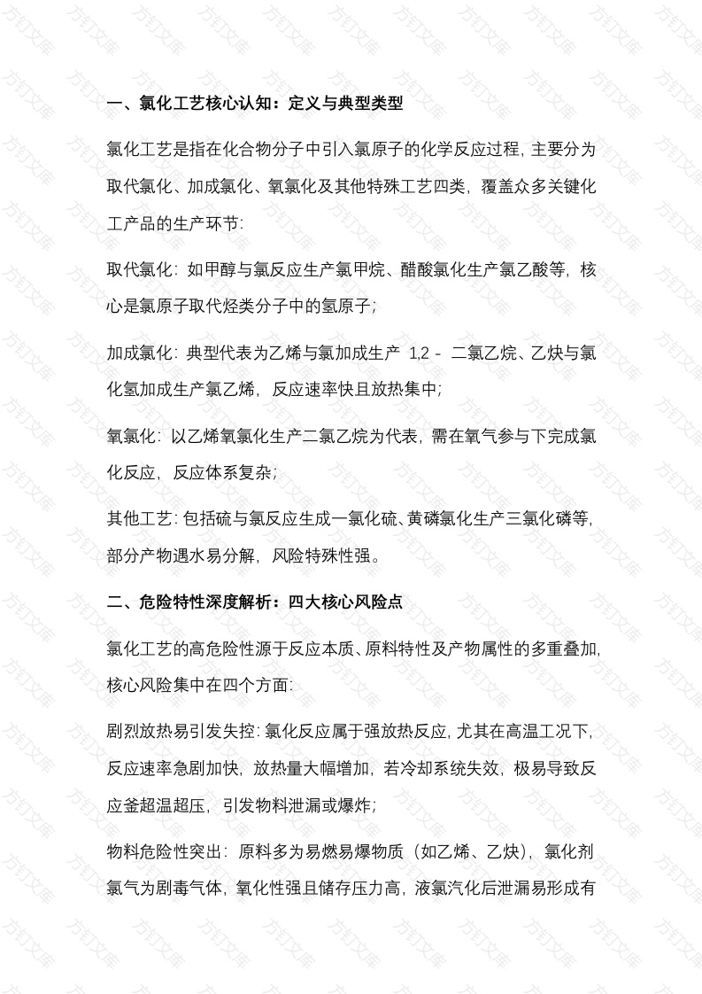 氯化工艺核心认知:定义与典型类型氯化工艺是指在化合物分子中引入氯原子的化学反应过程,主要分为取代氯化、加成氯化、氧氯化及其他特殊工艺四类,覆盖众多关键化工产品的生产环节:取代氯化:如甲醇与氯反应生产氯甲烷、醋酸氯化生产氯乙酸等,核心是氯原子取代烃类分子中的氢原子,加成氯化:典型代表为乙烯与氯加成生产1,2-二氯乙烷、乙炔与氯化氢加成生产氯乙烯,反应速率快且放热集中;氧氯化:以乙烯氧氯化生产二氯乙烷为代表,需在氧气参与下完成氯化反应,反应体系复杂;其他工艺:包括硫与氯反应生成一氯化硫、黄磷氯化生产三氯化磷等,部分产物遇水易分解,风险特殊性强。二、危险特性深度解析:四大核心风险点氯化工艺的高危险性源于反应本质、原料特性及产物属性的多重叠加核心风险集中在四个方面:剧烈放热易引发失控:氯化反应属于强放热反应,尤其在高温工况下,反应速率急剧加快,放热量大幅增加,若冷却系统失效,极易导致反应釜超温超压,引发物料泄漏或爆炸;物料危险性突出:原料多为易燃易爆物质(如乙烯、乙炔),氯化剂氯气为剧毒气体,氧化性强且储存压力高,液氯汽化后泄漏易形成有文毒云团,造成人员中毒杂质与副产物风险:氯气中的三氯化氮杂质积累到一定浓度易引发爆炸,氢气、氧气等杂质也会增加反应体系的燃爆风险;生成的氯化氢气体遇水后腐蚀性极强,易损坏设备管线,尾气与环境风险:氯化反应尾气可能形成爆炸性混合物,若处理不及时易引发二次事故;部分产物(如三氯化磷)遇水剧烈分解一旦接触含水介质会释放有毒气体,扩大危害范围。三、重点监控单元:精准锁定风险关键环节针对氯化工艺的风险特点,需重点监控三大核心单元,实现风险的早期预警与精准管控:氯化反应釜:作为反应核心设备,需实时监控温度、压力、搅拌电流(速率)、氯化剂进料量及投料配比等关键参数,这些参数直接决定反应稳定性;冷却系统:冷却效果直接影响反应温度控制,需监控冷媒流量、温度及冷却设备运行状态,防止因冷却失效导致反应失控氯化反应尾气处理单元:需监控尾气组成、压力及吸收处理效果,避免尾气泄漏或形成爆炸性混合物。四、全流程安全管控措施:实战落地核心要求结合工艺特点与法规要求,氯化工艺需落实“监测联锁、物料管控设备防护、作业规范、应急保障”五大维度管控措施,构建全流程安全防线万1.参数监测与联锁控制:筑牢第一道防线针对反应釜温度、压力、搅拌电流等核心参数,设置具备远传记录和超限报警功能的在线监测装置,确保参数异常时及时预警;建立分级联锁机制:温度、压力设高报警和高高报警,高高报警时自动切断氯化剂进料并加大冷媒流量;搅拌系统故障时,通过电流(速率)高低报警触发氯化剂进料切断联锁,同时启动紧急冷却措施;氯气进料管设置紧急切断阀和防反串设施,当进料流量过低或气化器与反应器压差异常时,自动切断氯气进料,防止物料反串引发危险。2.物料与设备专项管控:消除本质风险忌水物料管控:涉及三氯化磷、氯化亚砜等遇水分解物料时,严格控制原料和溶剂的水分残留,换热系统避免直接使用含水介质,确需使用的需采取隔离防护措施;三氯化氮防控:定期检测氯气缓冲罐、过滤器底部的三氯化氮含量及时排污,确保排出物中三氯化氮质量分数低于0.5%;设备材质与防护:液氯气化采用全气化工艺,禁用釜式气化器;与干燥氯气接触的设备禁用钛材或钛合金;存在氯离子应力腐蚀风险的设备外表面,采用涂层或阴极保护等防腐蚀措施;储罐与气化器管控:液氯储罐、气化器设置压力、液位、温度在线监测装置并与进料设施联锁,储罐储存系数不超过0.8,配备两种不同