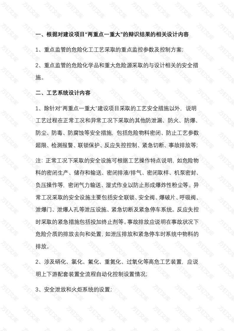 根据对建设项目“两重点一重大”的辩识结果的相关设计内容重点监管的危险化工工艺采取的重点监控参数及控制方案2、重点监管的危险化学品和重大危险源采取的与设计相关的安全措施。工艺系统设计内容1、除针对“两重点一重大”建设项目采取的工艺安全措施以外,说明工艺过程在正常工况和异常工况下采取的其他防泄漏、防火、防爆、防尘、防毒、防腐蚀等安全措施,包括危险物料密闭、防止工艺参数超限、检测报警、联锁保护、反应失控控制、紧急切断、事故排放等;注:正常工况下采取的安全设施可根据工艺操作特点说明,如危险物料的密闭生产、储存和输送、密闭排液/排气、密闭取样、机泵密封负压操作等,密闭气力输送、湿式作业以防止形成爆炸性粉尘等。异常工况采取的安全设施主要包括安全联锁、安全阀、爆破片、呼吸阀泄爆门、泄爆人孔等泄压设施、紧急切断及紧急停车系统。反应失控时采取的紧急措施包括投加终止剂等。事故排放应说明在事故状况下危险介质的排放去向和处置,如泄压排放和紧急停车时系统中物料的排放。2、涉及硝化、氯化、氟化、重氮化、过氧化等高危工艺装置,应说明上下游配套装置全流程自动化控制设置情况:安全泄放和火炬系统的设置万万万万万注应说明采用的火炬类别,如高架火炬、低温火炬、酸性气火炬氨火炬等,并说明突发事故时的最大火炬排放量、火炬设计量、火炬高度、热辐射范围、防回火措施等。4、有毒有害气体的排气处理设施,包括碱洗塔、吸收塔、洗涤塔等;5、废气、废液焚烧系统的设置。三、总平面布置设计内容建设项目与厂/界外设施的间距、标准符合性及采取的防护措施,2、全厂及装置(设施)平面及竖向布置的设计方案,包括功能分区风速、风向、间距、高程、管廊布置、危险化学品运输等,并说明厂内装卸设施、运输线路、停车场等采取的安全措施,3、总平面布置的主要防火间距及标准符合情况;文万4、厂区消防道路、安全疏散通道及出口的设置情况。四、设备和管道设计内容1、压力容器、设备及管道设计与国家法规及标准的符合性,包括进口压力容器满足国家强制性规定的情况:2、主要设备的选型、材质和防护措施:3、主要管道材料的选择和防护措施。五、电气设计内容电气负荷分级、供电电源、应急或备用电源的设置;爆炸危险区域内电气设备的防爆防护等级选择3、防雷、防静电接地设施,4、电缆选择及敷设路径的安全措施;5、疏散照明、消防应急照明及备用照明的设置。六、自控仪表设计内容1、应急或备用电源、气源的设置;2、自控系统(包括DCS、SIS、GDS、PLC等)设置,说明各系统的应用范围及紧急停车、安全联锁、应急控制等安全功能3、根据项目开展的SL定级分析结果说明各SF回路的SL等级;4、可燃及有毒气体检测和报警系统设置和布置;控制室组成及主要功能,包括生产控制、消防控制等;6、电缆选择及敷设路径的安全措施。方七、电信设计内容1、火灾报警系统;工业电视监控系统;3、扩音对讲系统及应急广播、无线通信。万文万八、建(构)筑物设计编制“建(构)筑物一览表”,说明结构、建筑面积、层数、建筑