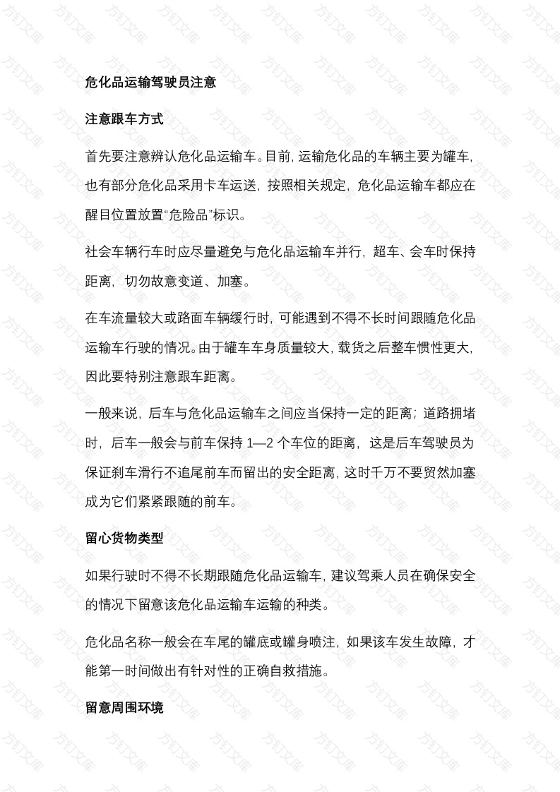 危化品运输驾驶员注意万万注意跟车方式首先要注意辨认危化品运输车。目前,运输危化品的车辆主要为罐车,也有部分危化品采用卡车运送,按照相关规定,危化品运输车都应在醒目位置放置“危险品”标识。社会车辆行车时应尽量避免与危化品运输车并行,超车、会车时保持距离,切勿故意变道、加塞。在车流量较大或路面车辆缓行时,可能遇到不得不长时间跟随危化品运输车行驶的情况。由于罐车车身质量较大,载货之后整车惯性更大,因此要特别注意跟车距离。般来说,后车与危化品运输车之间应当保持一定的距离;道路拥堵时,后车一般会与前车保持1一2个车位的距离,这是后车驾驶员为保证刹车滑行不追尾前车而留出的安全距离,这时千万不要贸然加塞成为它们紧紧跟随的前车。留心货物类型如果行驶时不得不长期跟随危化品运输车,建议驾乘人员在确保安全的情况下留意该危化品运输车运输的种类。危化品名称一般会在车尾的罐底或罐身喷注,如果该车发生故障,才能第一时间做出有针对性的正确自救措施。留意周围环境文万如果身旁的危化品运输车发生了事故,驶离道路被阻断,周围车辆驾乘人员则应当第一时间撤离现场。然而,危化品种类繁多,危险性质各不相同,如何安全地撤离也与周围水体、天气、地形、风向等因素密切相关。因此,还要在确保行车安全的前提下留意周围环境,确保撤离时选择正确的逃生方向和路线。危化品运输事故逃生、报警要点逃生时应首先撤出现场,以免与其他正常行驶的车辆发生次生事故,切勿逆行、穿越或在公路上行走。翻出护栏时请注意路肩及沟渠(危险品液体有可能在此聚集)撤离桥隧路段时要注意车流,尽快跑到有边坡或路肩的地带撤出高速公路。逃离至安全地带后,驾乘人员、沿线居民应当立即拨打119联系消防部门救援。危化品事故如何逃生易燃易爆,这些东西尽量远离常见的易燃易爆物品包括可燃气体、石化产品、炸药及烟花爆竹,不少易燃易爆固体(如硝酸铵、TT、白磷等)受到撞击摩擦就可能爆万万文有的甚至接触空气、水也可能发生爆炸其储存介质(如煤油)也可运输此类物品应选择气温凉爽的时段出行,注意罐体温度、压力,要避免受热和光照;驾驶员跟车时也应当格外小心,防止碰撞;遇到此类车辆发生事故,必须第一时间远离现场。气、液泄漏,注意正确逃生方向气体、液体可以流动,泄漏时应当根据其是否可燃、是否有毒、是否溶于水等特性,结合环境因素选择逃生路线。有风时优选上风方向。有毒、可燃的气体或者其挥发物有毒、可燃的液体泄漏,如果现场有风,应优选上风(逆风)方向逃生。坡道上选好垂直方向。如果事故发生在坡道上,除注意风向外,还要根据选好逃生的垂直方向。甲烷、一氧化碳、乙烯、乙炔等比空气轻,无风环境下应尽量选择下坡方向逃生。苯、氯气、光气等比空气重,无风环境下应尽量选择上坡方向逃生。如果泄漏物是液体或者液化气体,应选择高处逃生。还要注意部分液化气体温度极低,泄漏时汽化吸热,一旦接触则引发严重冻伤;而液氨和液态苯还具有毒性,液氧泄漏会增加爆炸概率。遇水生变,雨天路滑特别注意不少危化品遇水后会发生化学反应或物理反应,产生其他危险,因此